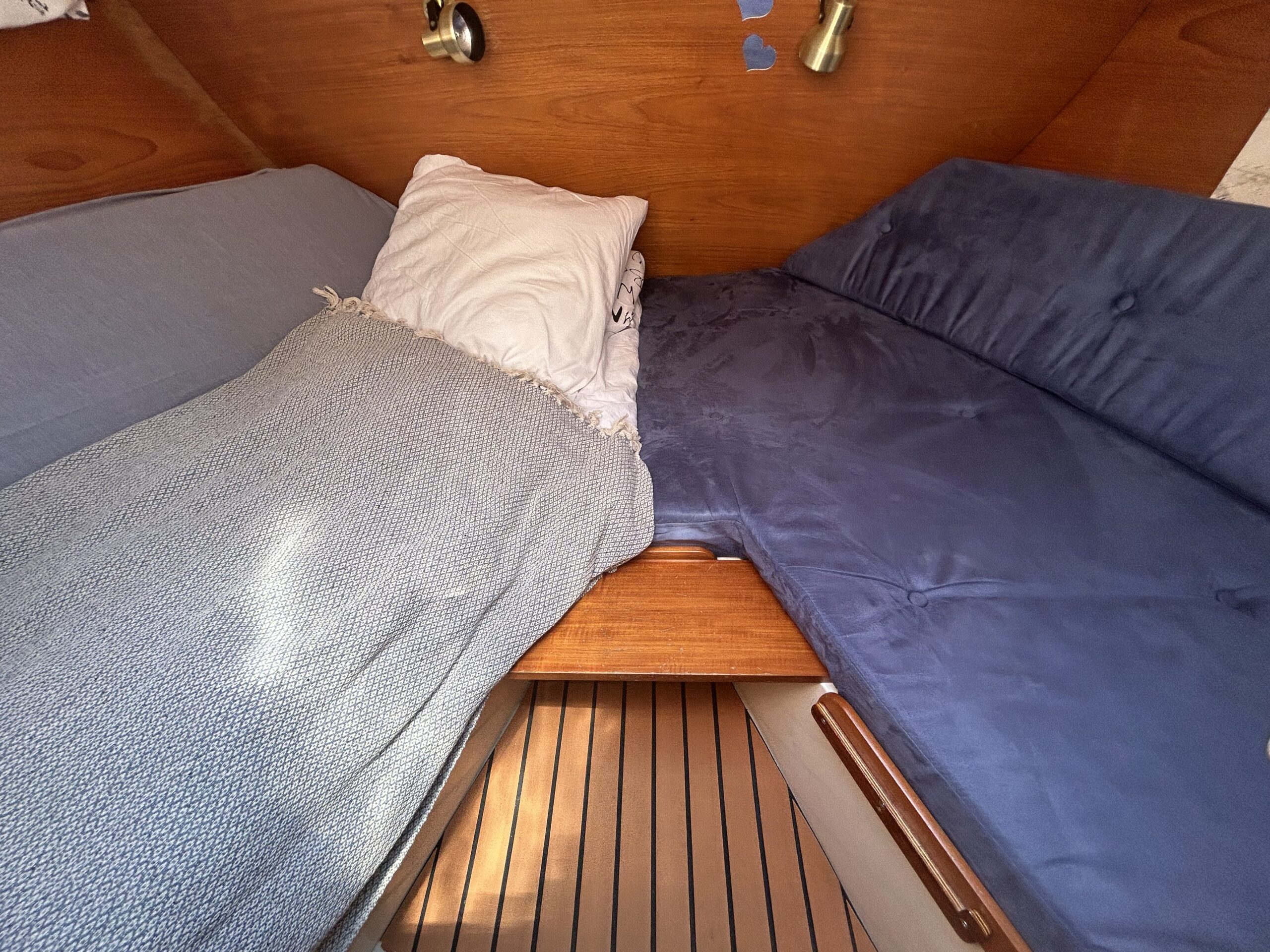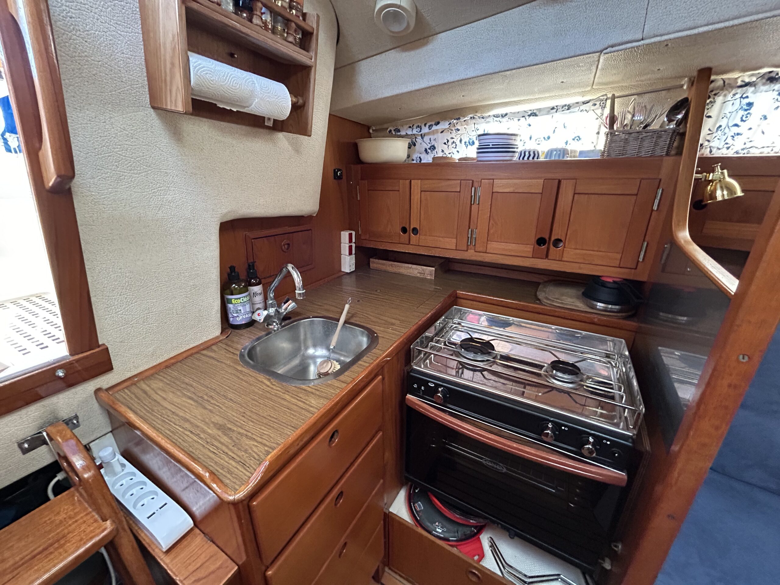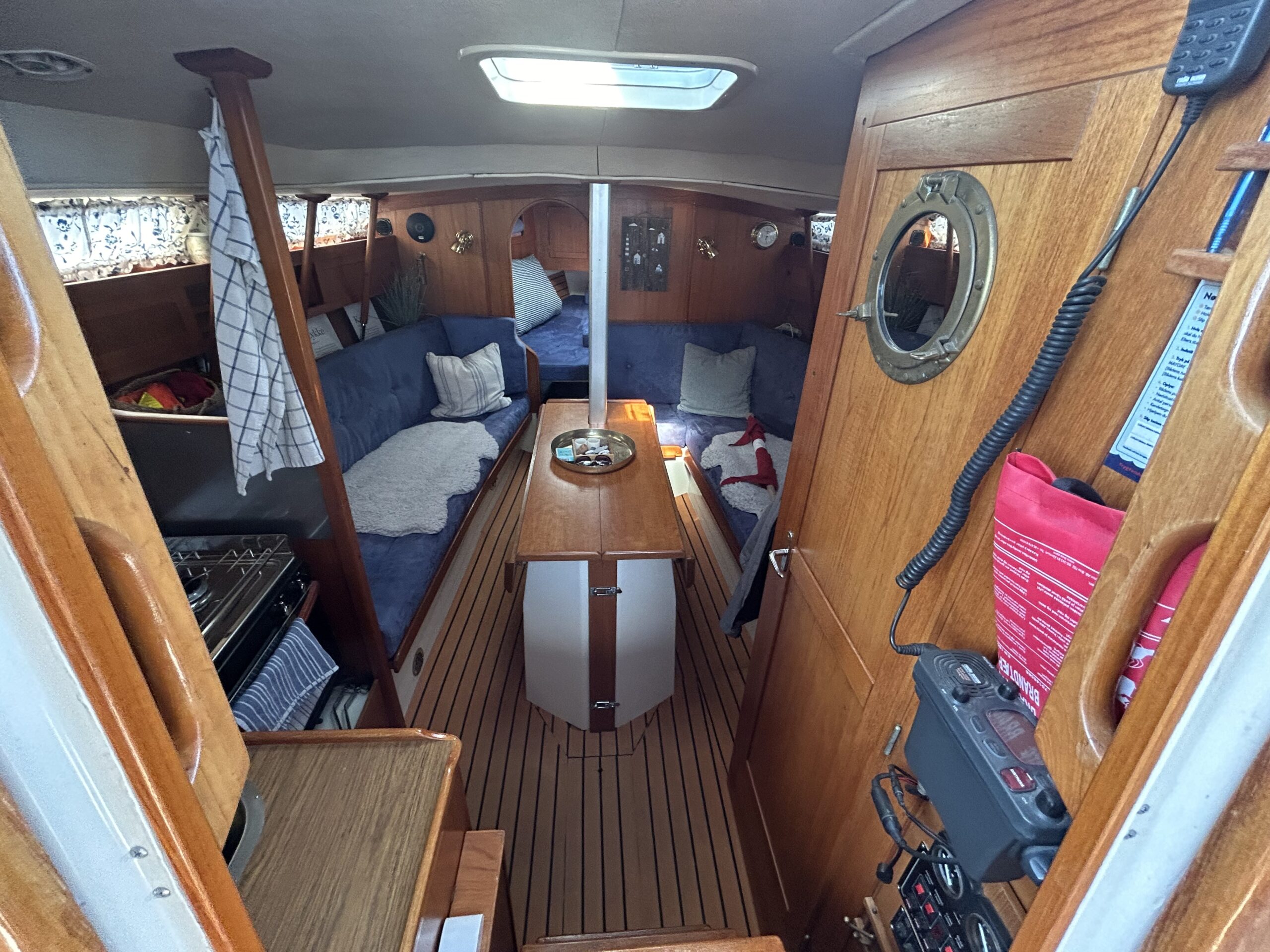 Nedgang til velindrettet stor salon, med soveplads til 3 personer. Sofagruppe med Flotte pæne blå hynder. Stort toiletrum. Stor forkahyt i traditionel V-format. Bemærk den fine Yanmar 3YM30 motor med KUN 680 timer, bovpropel samt opgraderingen på navigation og instrumenter. Ejeren har passet båden overalt. Båden har stor agterkahyt til 2 personer, køjelængde 0ver 2 meter. En båd der er et besøg værd.