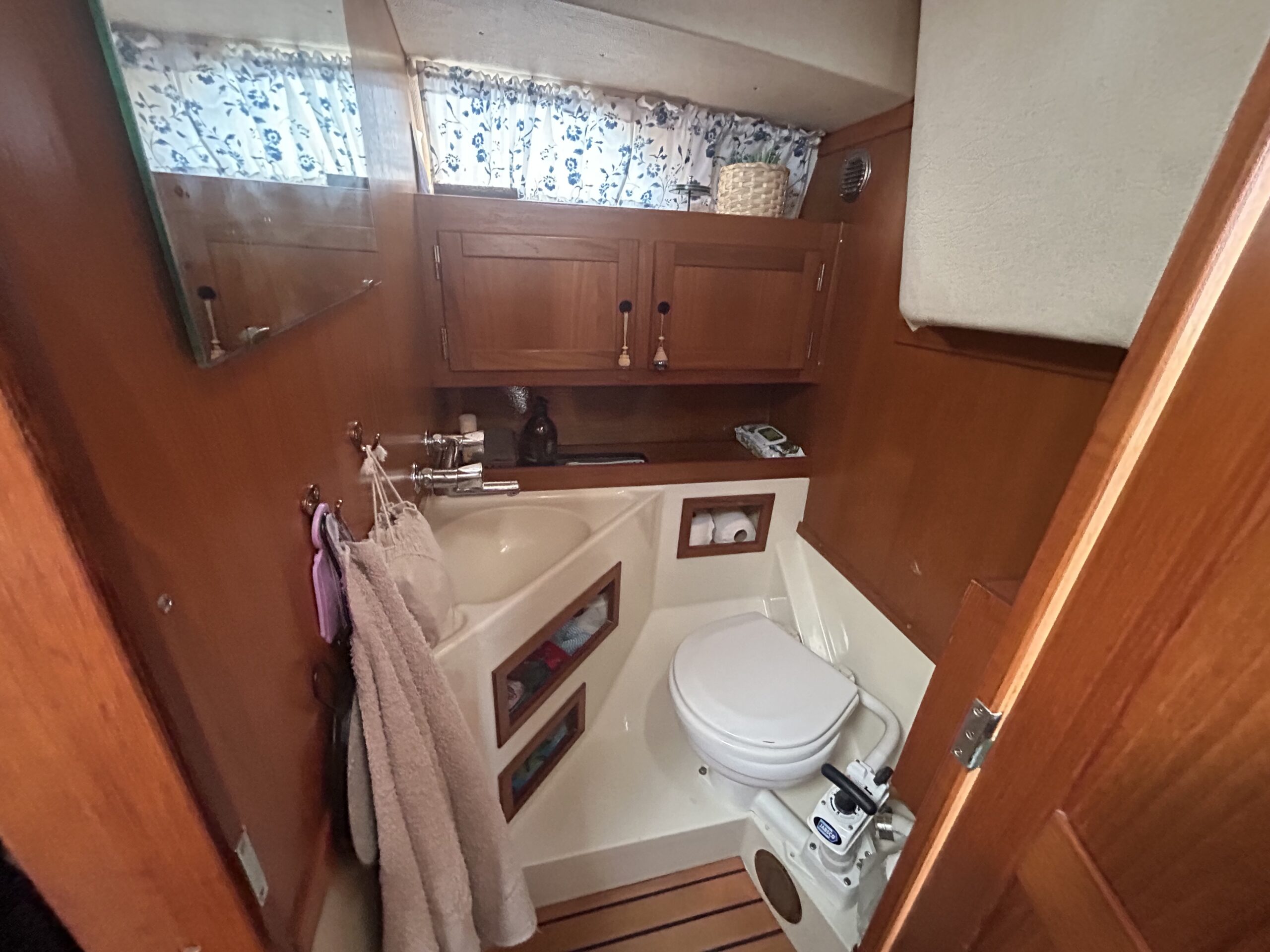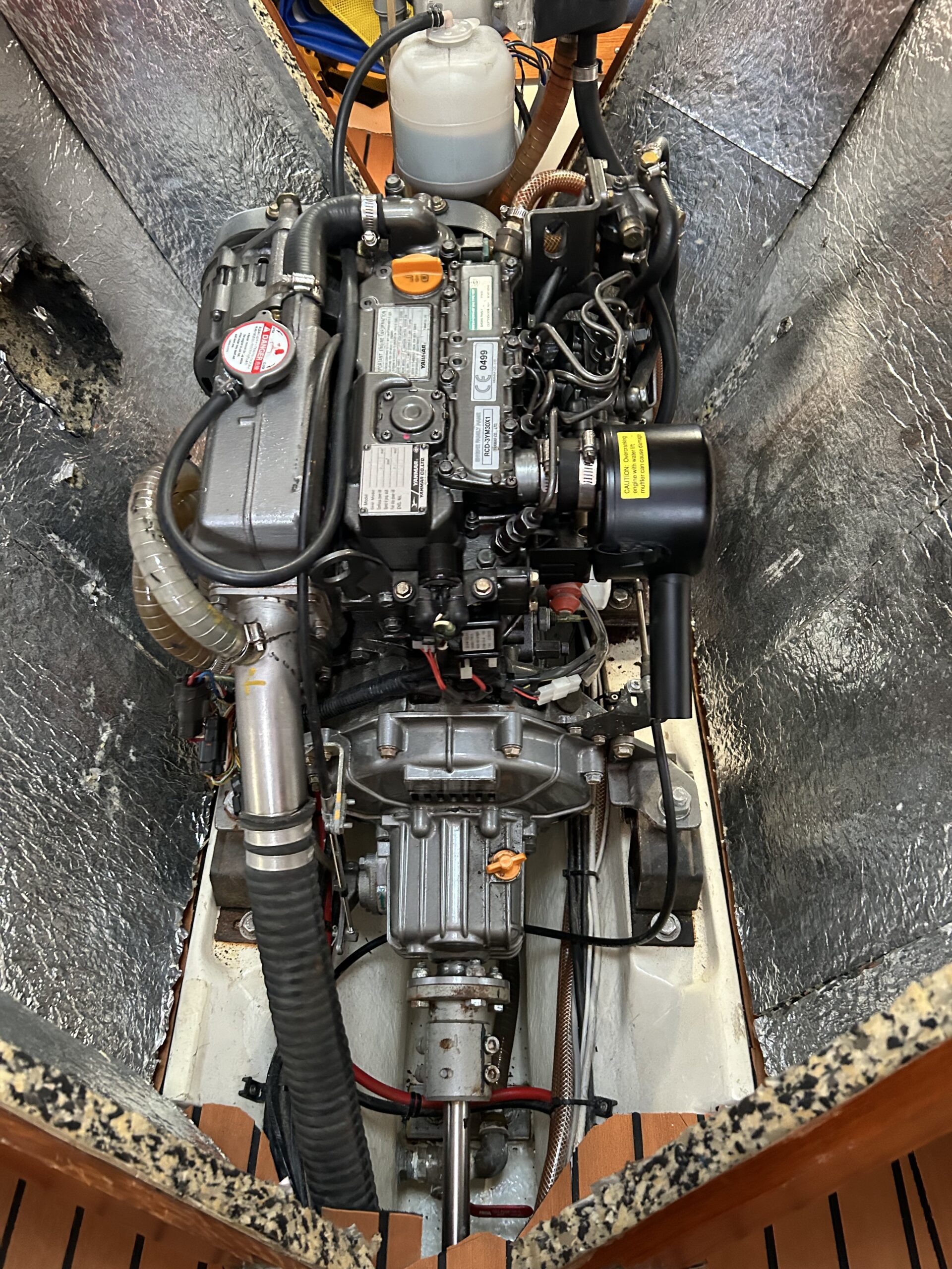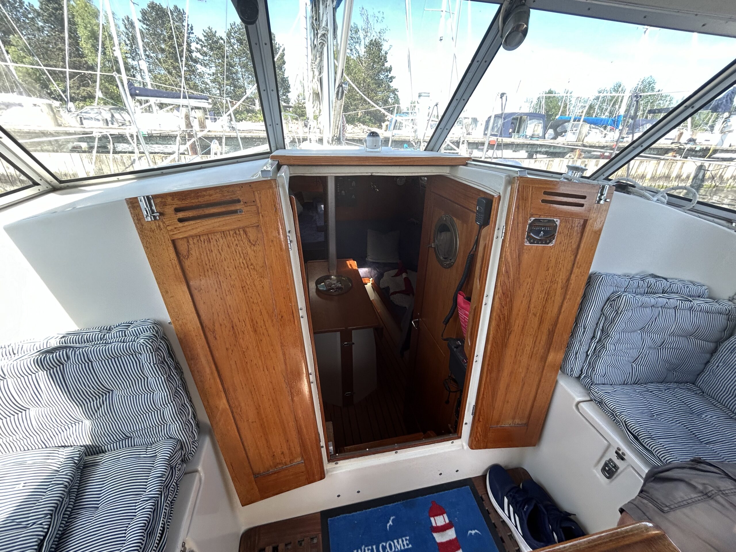 Nedgang til velindrettet stor salon, med soveplads til 3 personer. Sofagruppe med Flotte pæne blå hynder. Stort toiletrum. Stor forkahyt i traditionel V-format. Bemærk den fine Yanmar 3YM30 motor med KUN 680 timer, bovpropel samt opgraderingen på navigation og instrumenter. Ejeren har passet båden overalt. Båden har stor agterkahyt til 2 personer, køjelængde 0ver 2 meter. En båd der er et besøg værd.