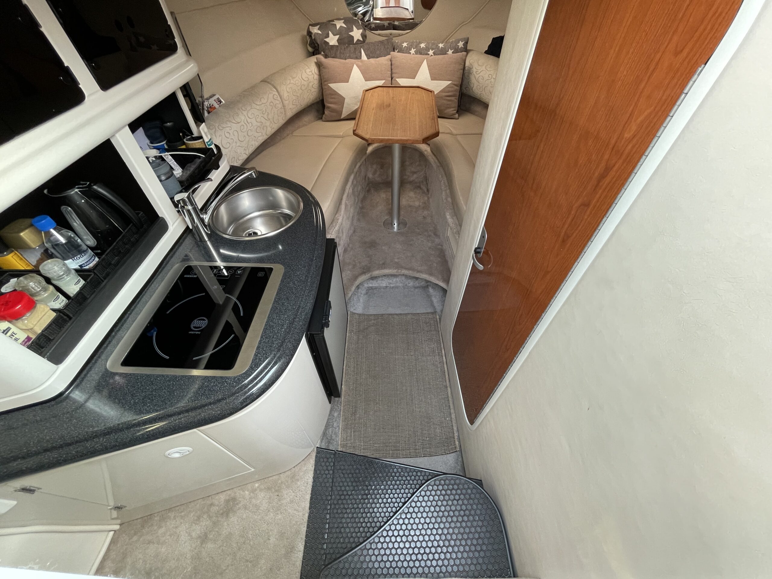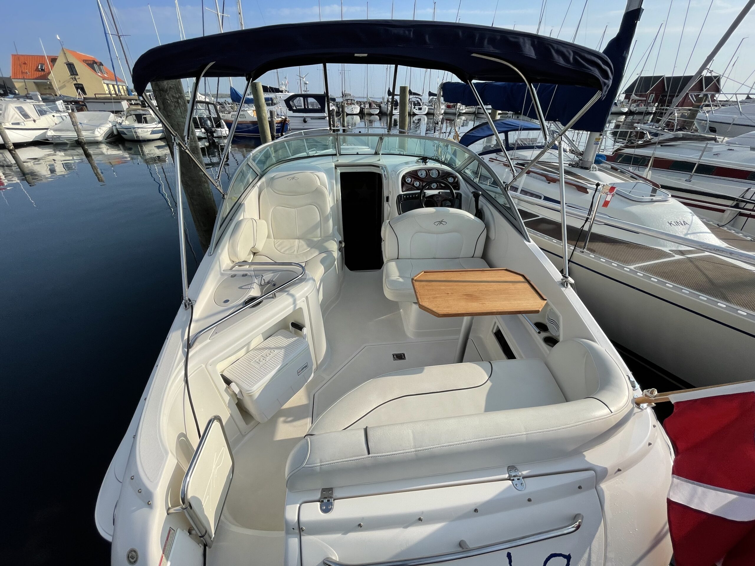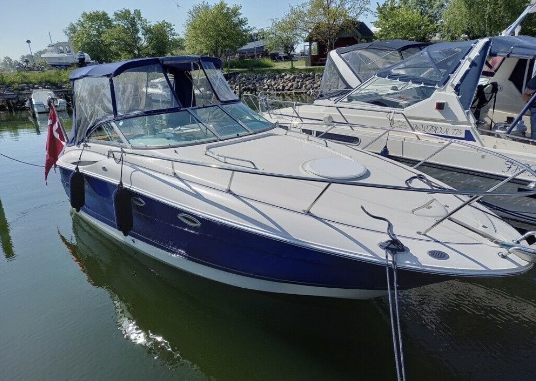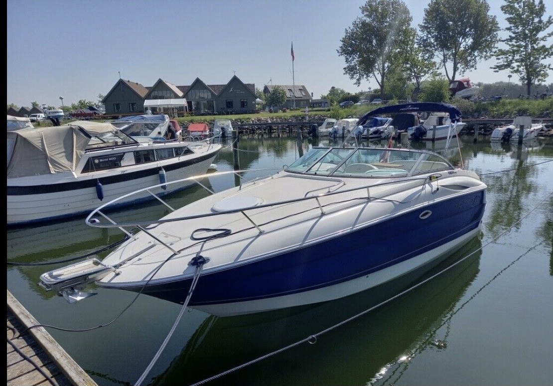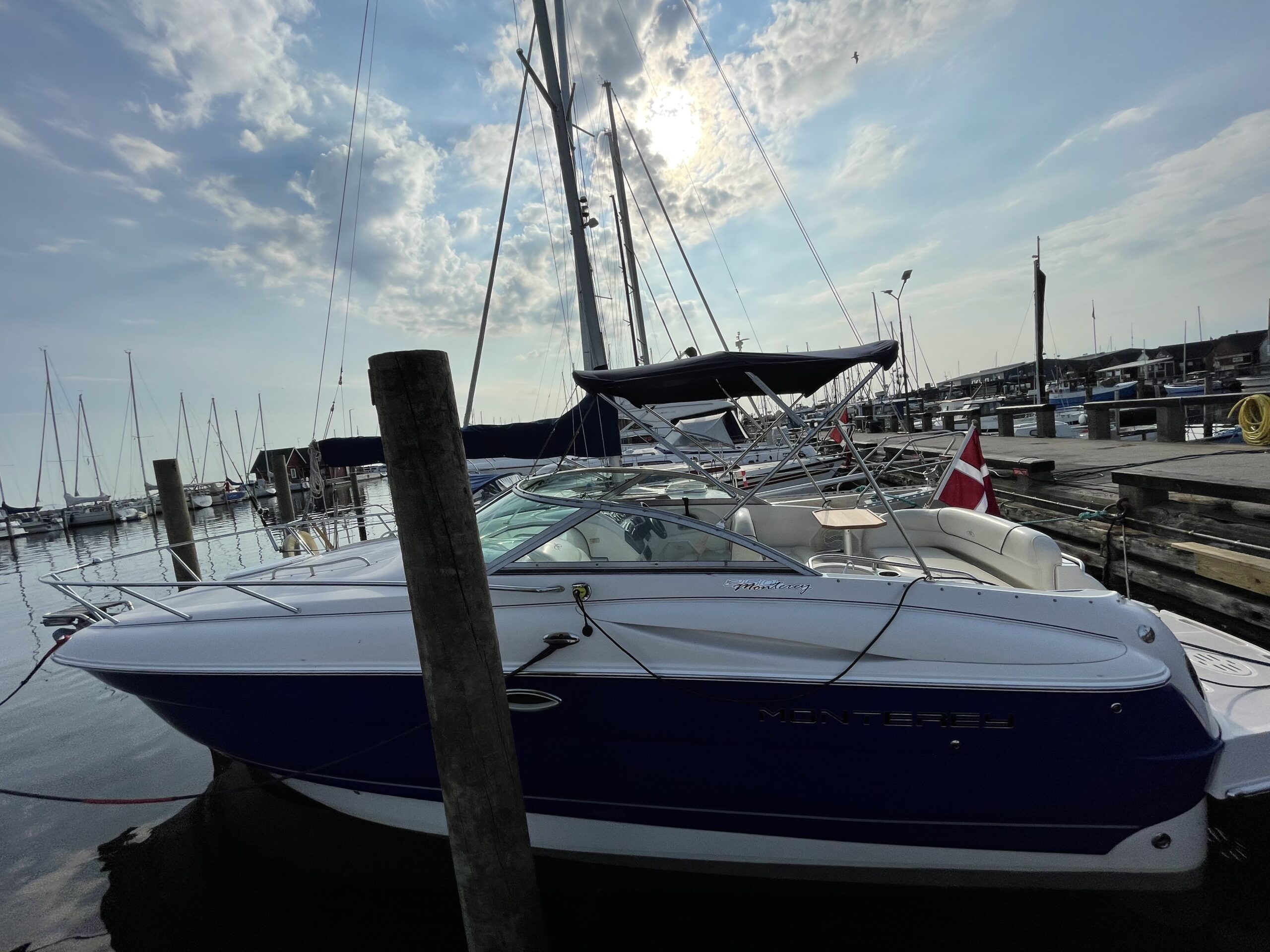 Kvalitetscruiser fra Monterrey – noget af det mest gennemførte,  lækker kvalitet og fine detaljer. Skønt stort cockpit  dejlig badeplatform med badestige. Fin adgang fra badeplatform til cockpit i BB side via gangzone. Sofagruppe med plads til 4-5 voksne. 1 stor køleboks er monteret under vask, bord monteres hurtigt i cockpit således af der kan hygges med en frokost. Trin op til fordækket ved siden af styrestolen. Nedgang til lækker luftig kahyt med U-sofa med bordløsning som kan omgøres til dobbeltkøje rigeligt til 2 voksne og alligevel med plads til junior i midten, Pantry med vask, induktions kogeplade, køleskab og massere af skabsplads. toilet rum med elektrisk toilet, brus og vask. Midt-cabin med dobbeltseng.