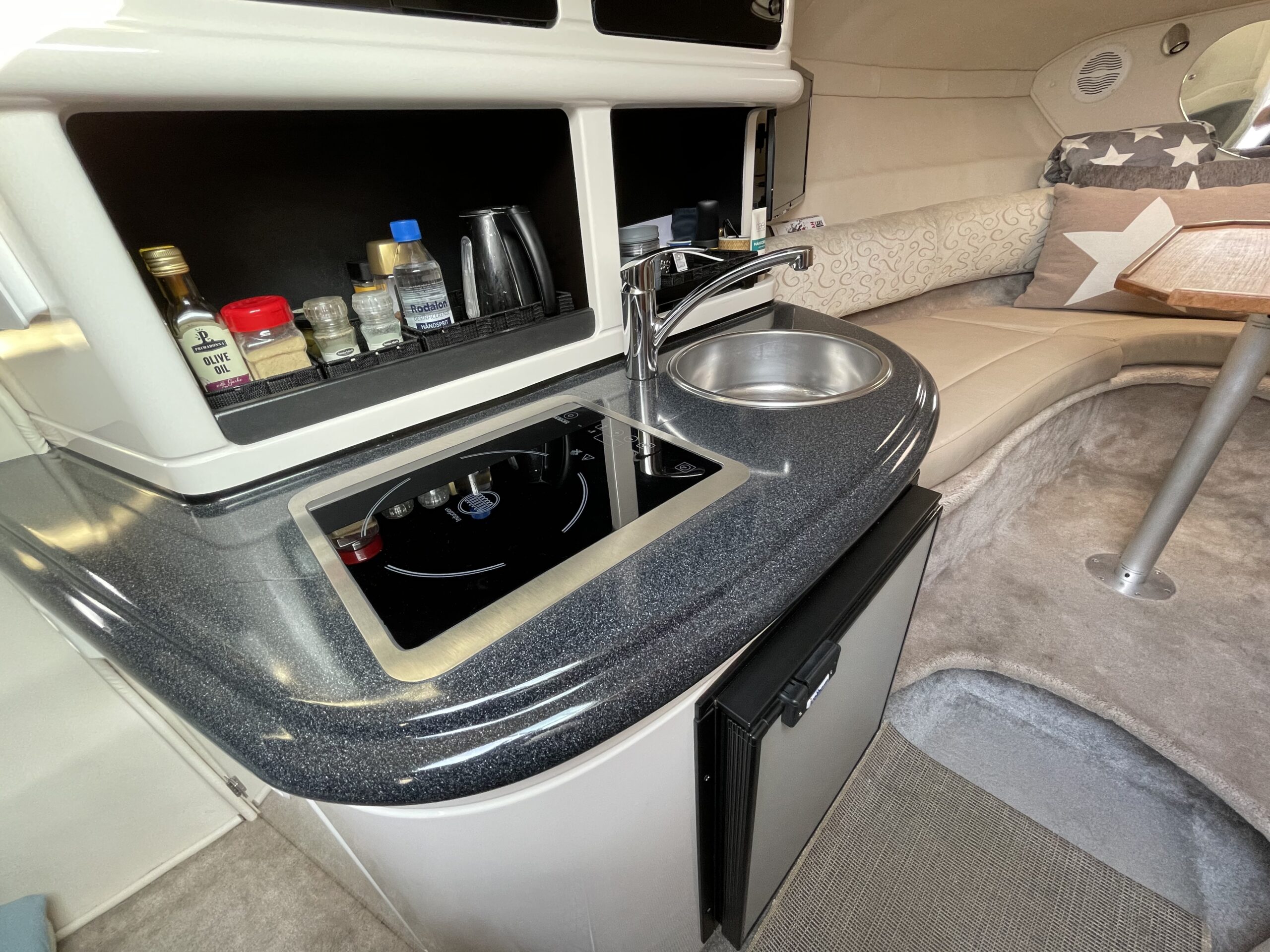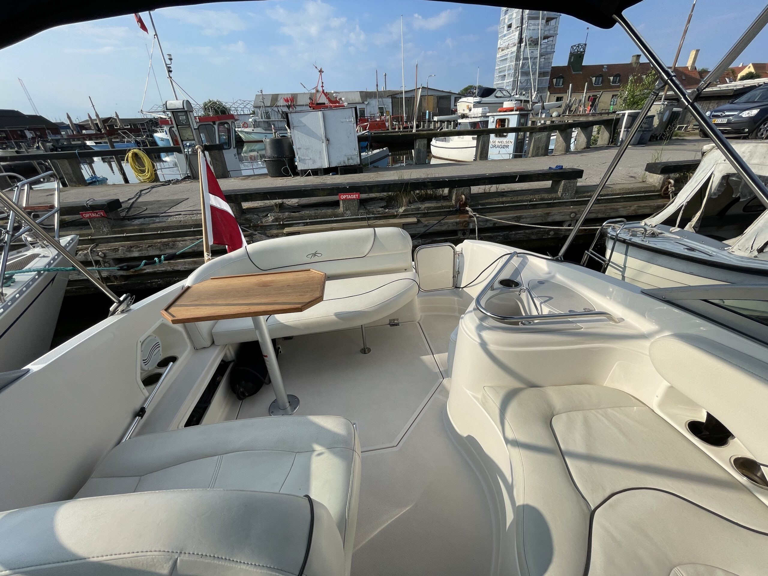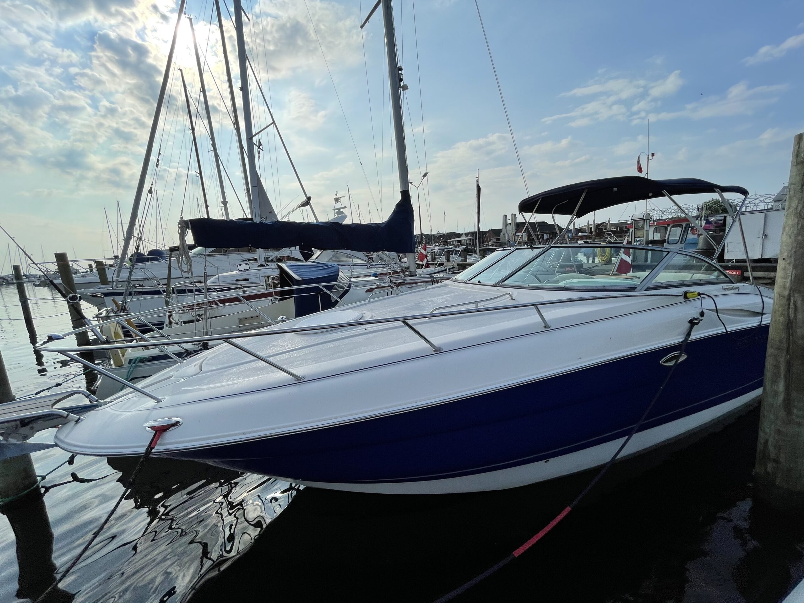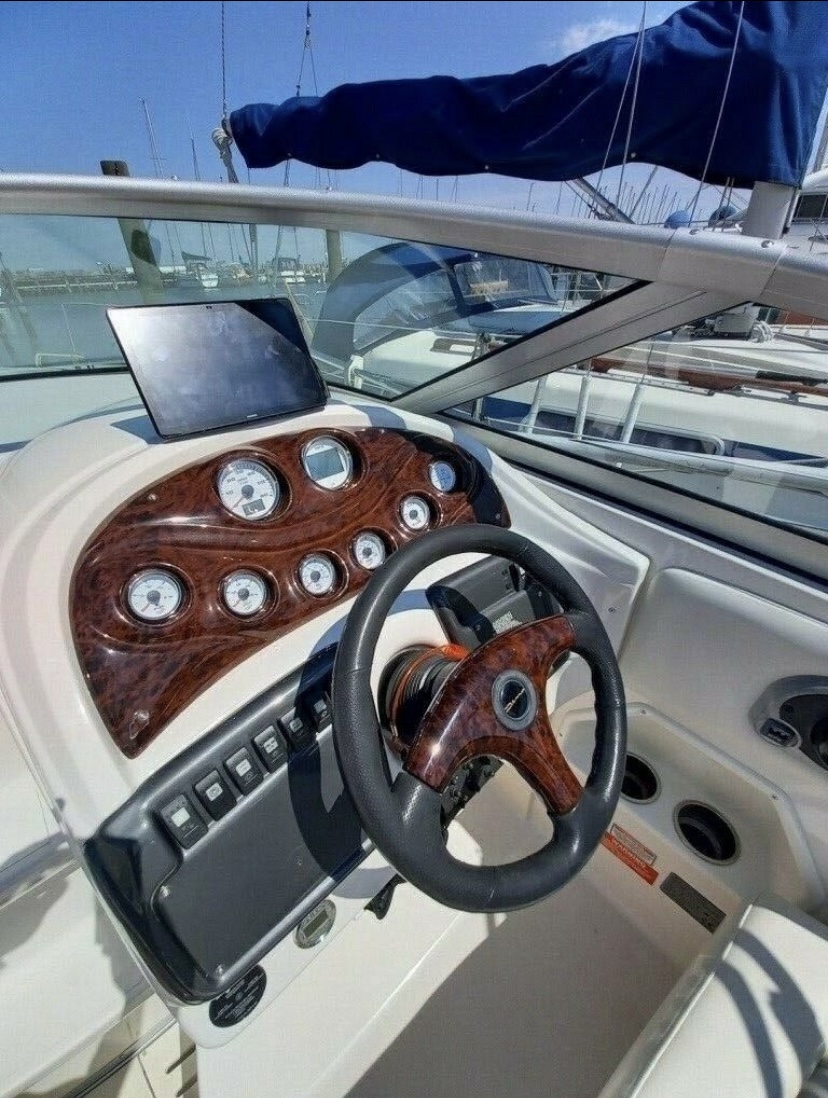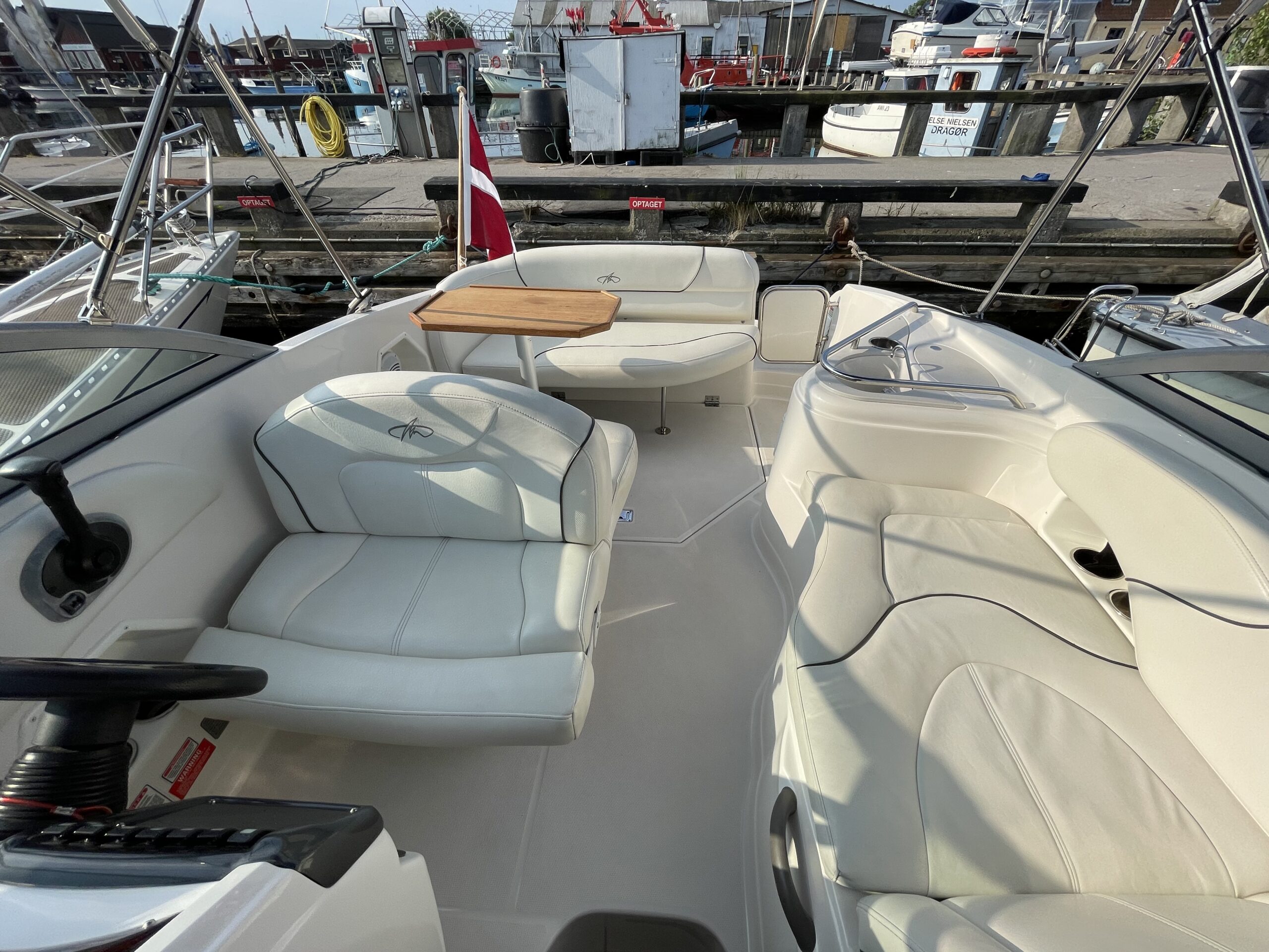 Kvalitetscruiser fra Monterrey – noget af det mest gennemførte,  lækker kvalitet og fine detaljer. Skønt stort cockpit  dejlig badeplatform med badestige. Fin adgang fra badeplatform til cockpit i BB side via gangzone. Sofagruppe med plads til 4-5 voksne. 1 stor køleboks er monteret under vask, bord monteres hurtigt i cockpit således af der kan hygges med en frokost. Trin op til fordækket ved siden af styrestolen. Nedgang til lækker luftig kahyt med U-sofa med bordløsning som kan omgøres til dobbeltkøje rigeligt til 2 voksne og alligevel med plads til junior i midten, Pantry med vask, induktions kogeplade, køleskab og massere af skabsplads. toilet rum med elektrisk toilet, brus og vask. Midt-cabin med dobbeltseng.