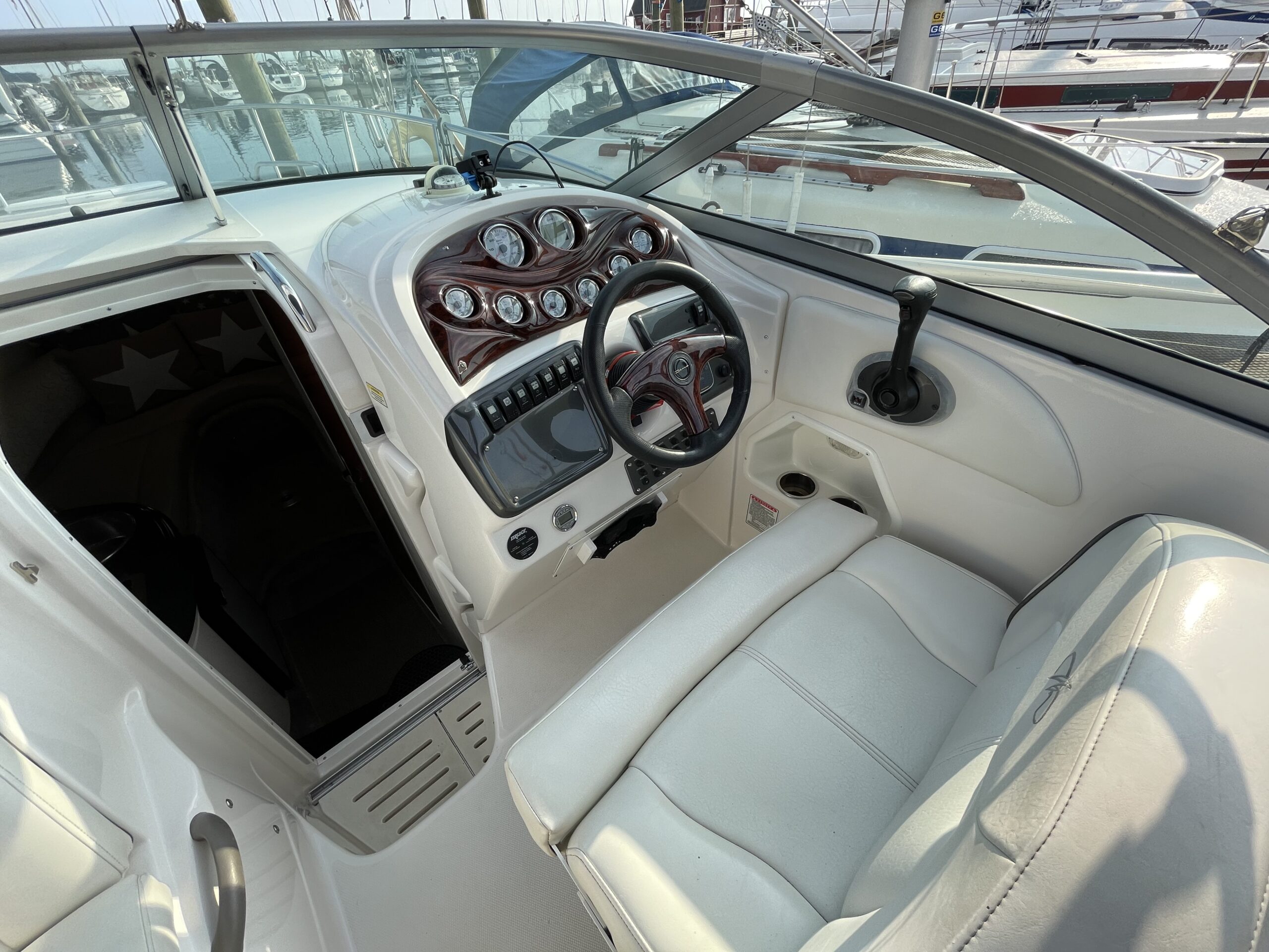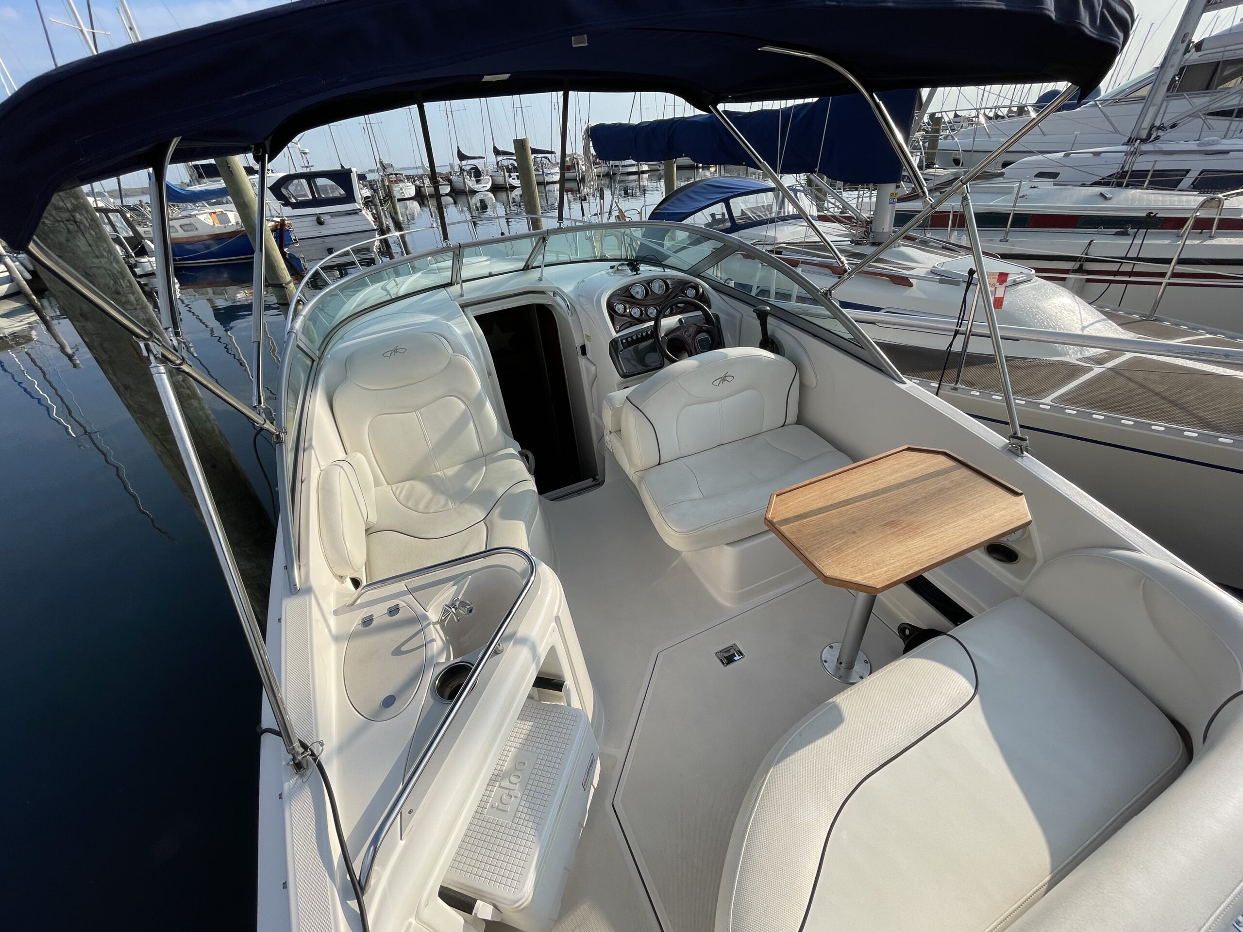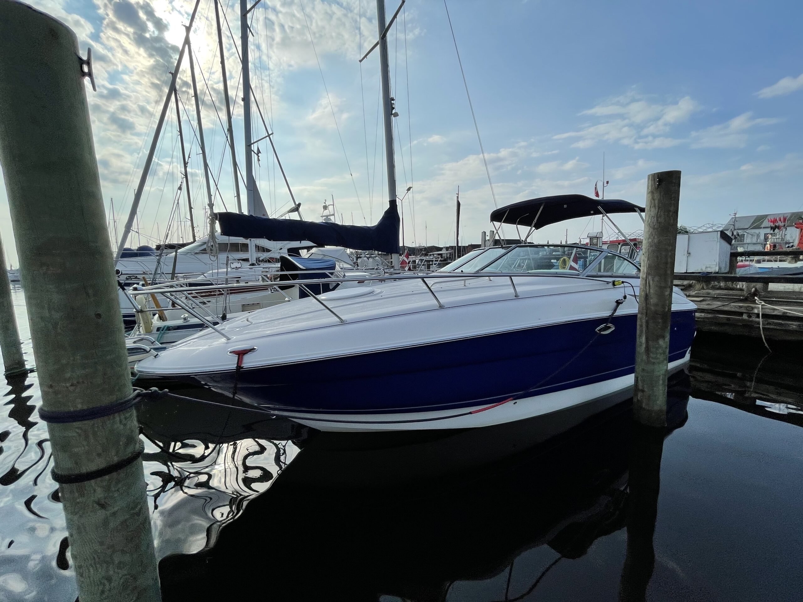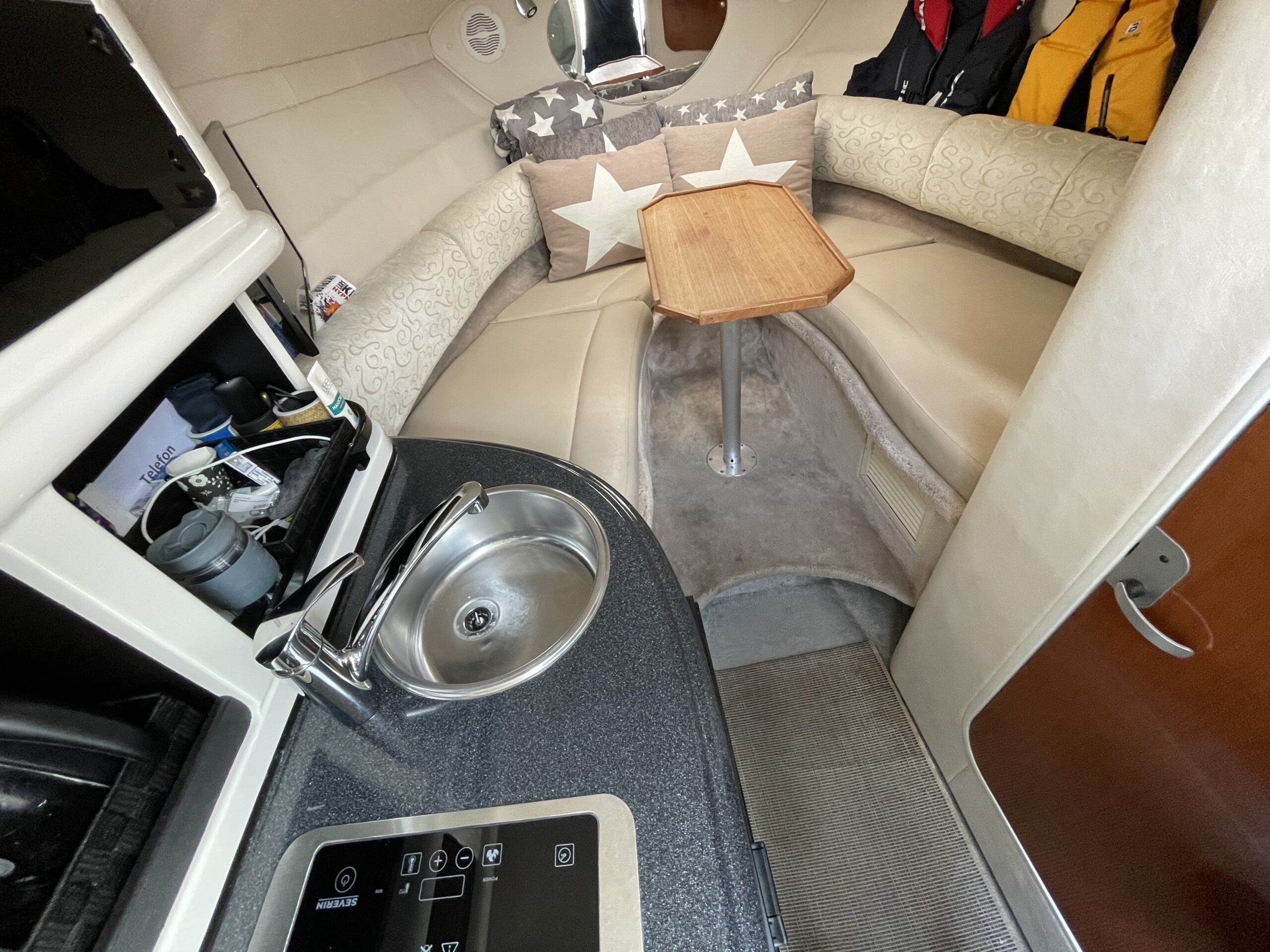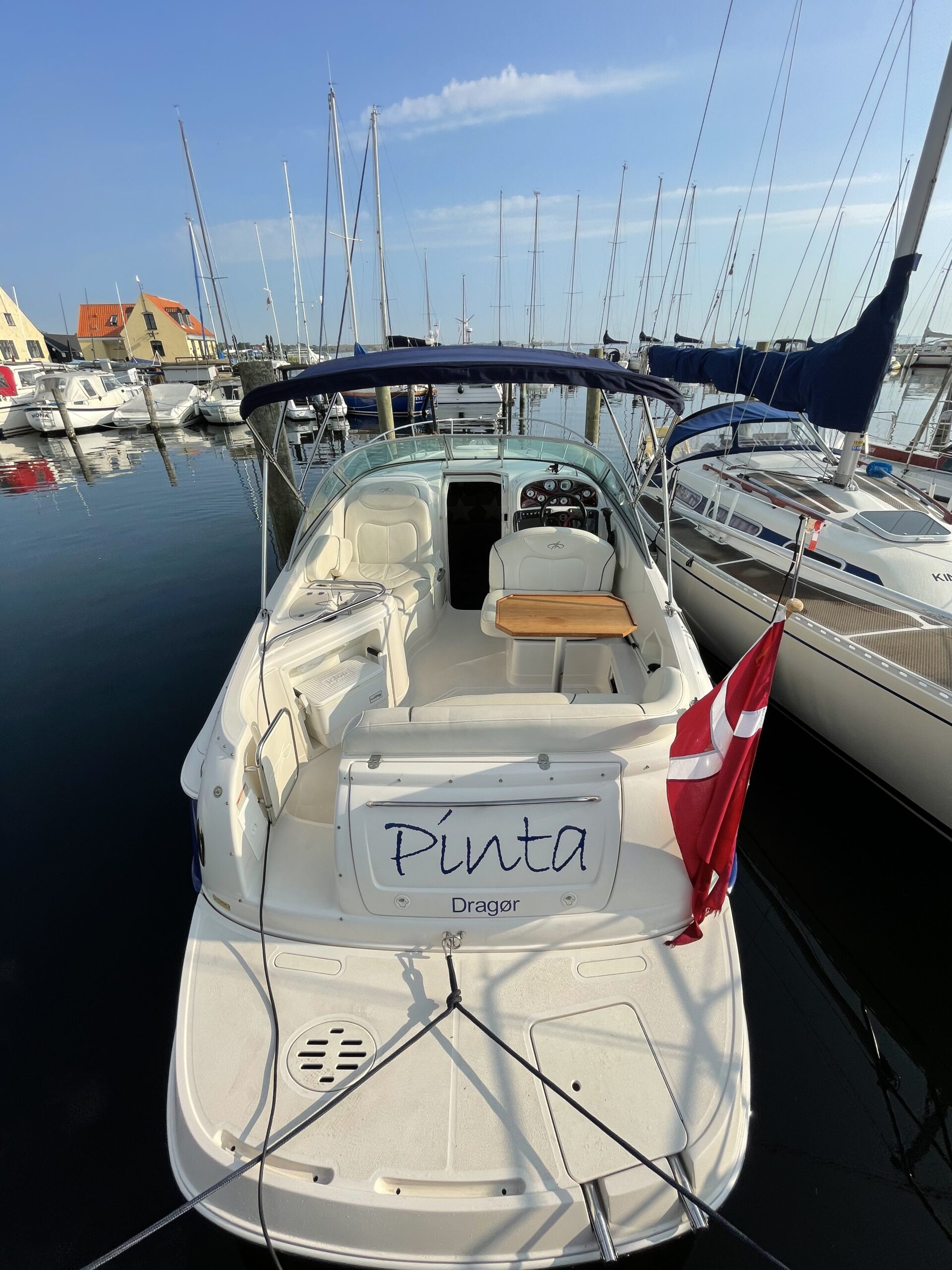 Kvalitetscruiser fra Monterrey – noget af det mest gennemførte,  lækker kvalitet og fine detaljer. Skønt stort cockpit  dejlig badeplatform med badestige. Fin adgang fra badeplatform til cockpit i BB side via gangzone. Sofagruppe med plads til 4-5 voksne. 1 stor køleboks er monteret under vask, bord monteres hurtigt i cockpit således af der kan hygges med en frokost. Trin op til fordækket ved siden af styrestolen. Nedgang til lækker luftig kahyt med U-sofa med bordløsning som kan omgøres til dobbeltkøje rigeligt til 2 voksne og alligevel med plads til junior i midten, Pantry med vask, induktions kogeplade, køleskab og massere af skabsplads. toilet rum med elektrisk toilet, brus og vask. Midt-cabin med dobbeltseng.