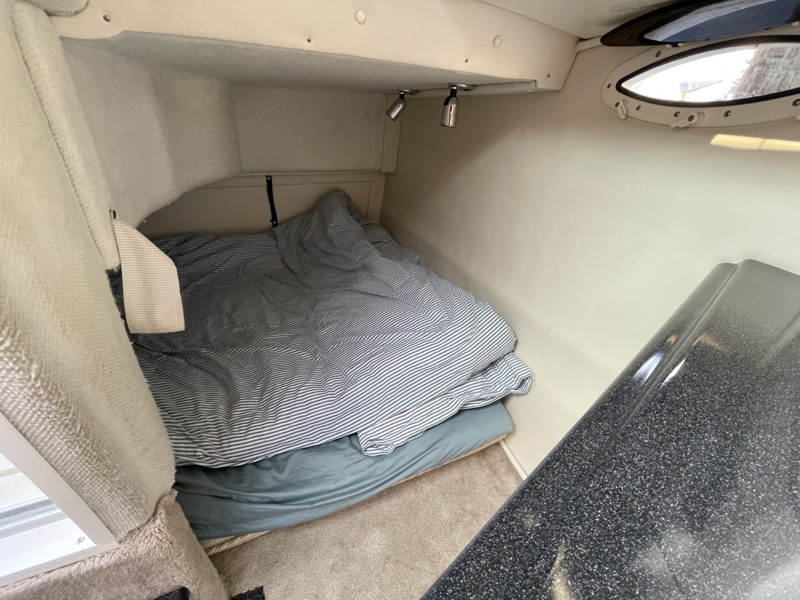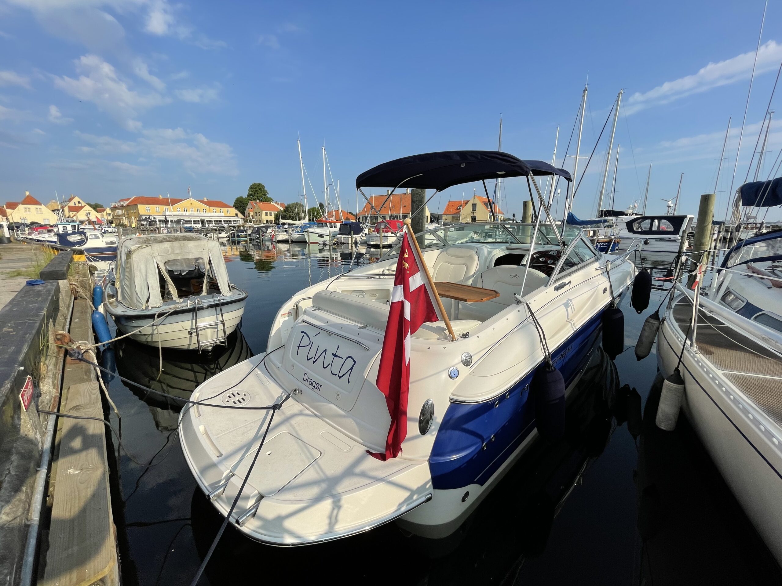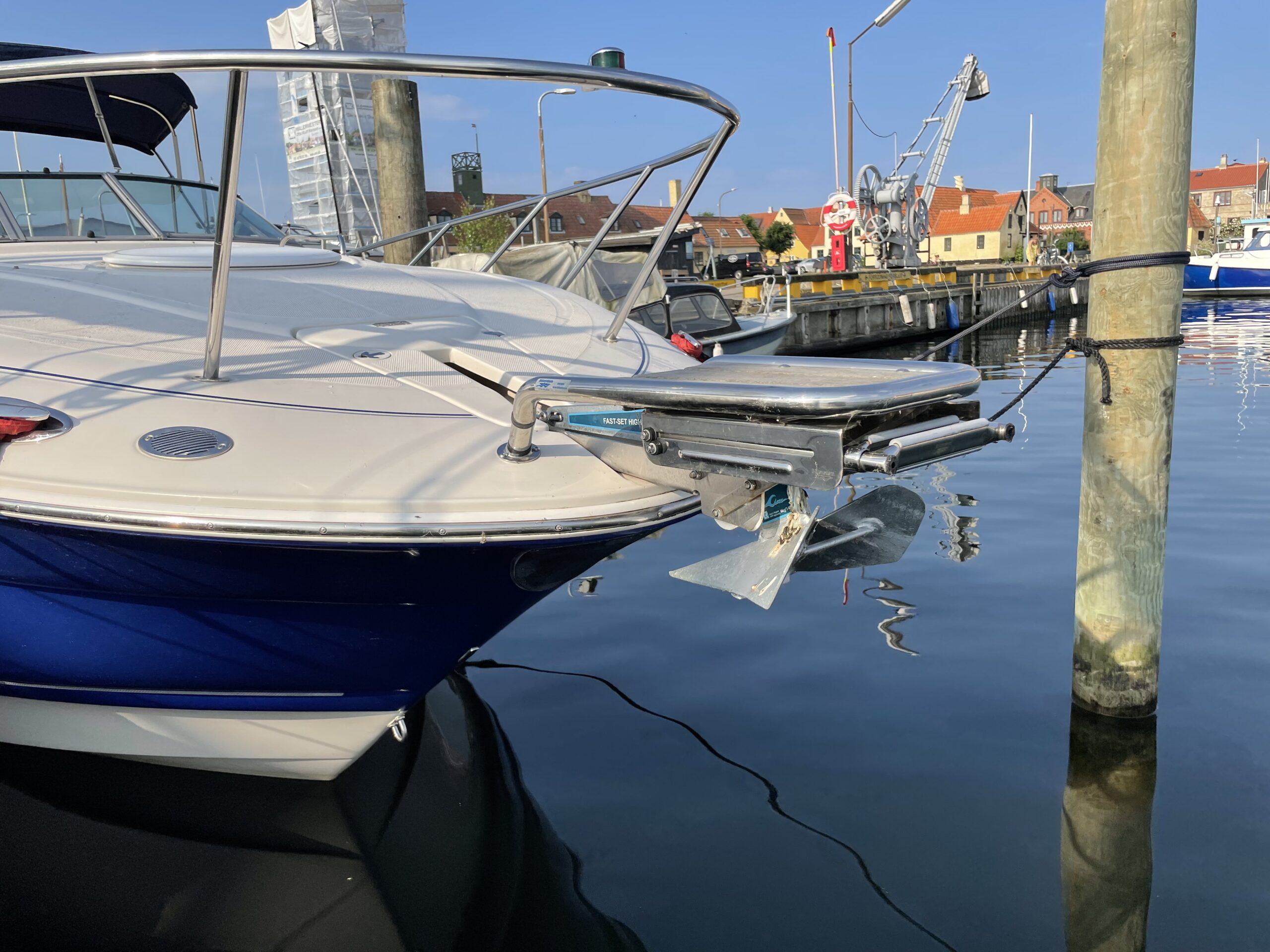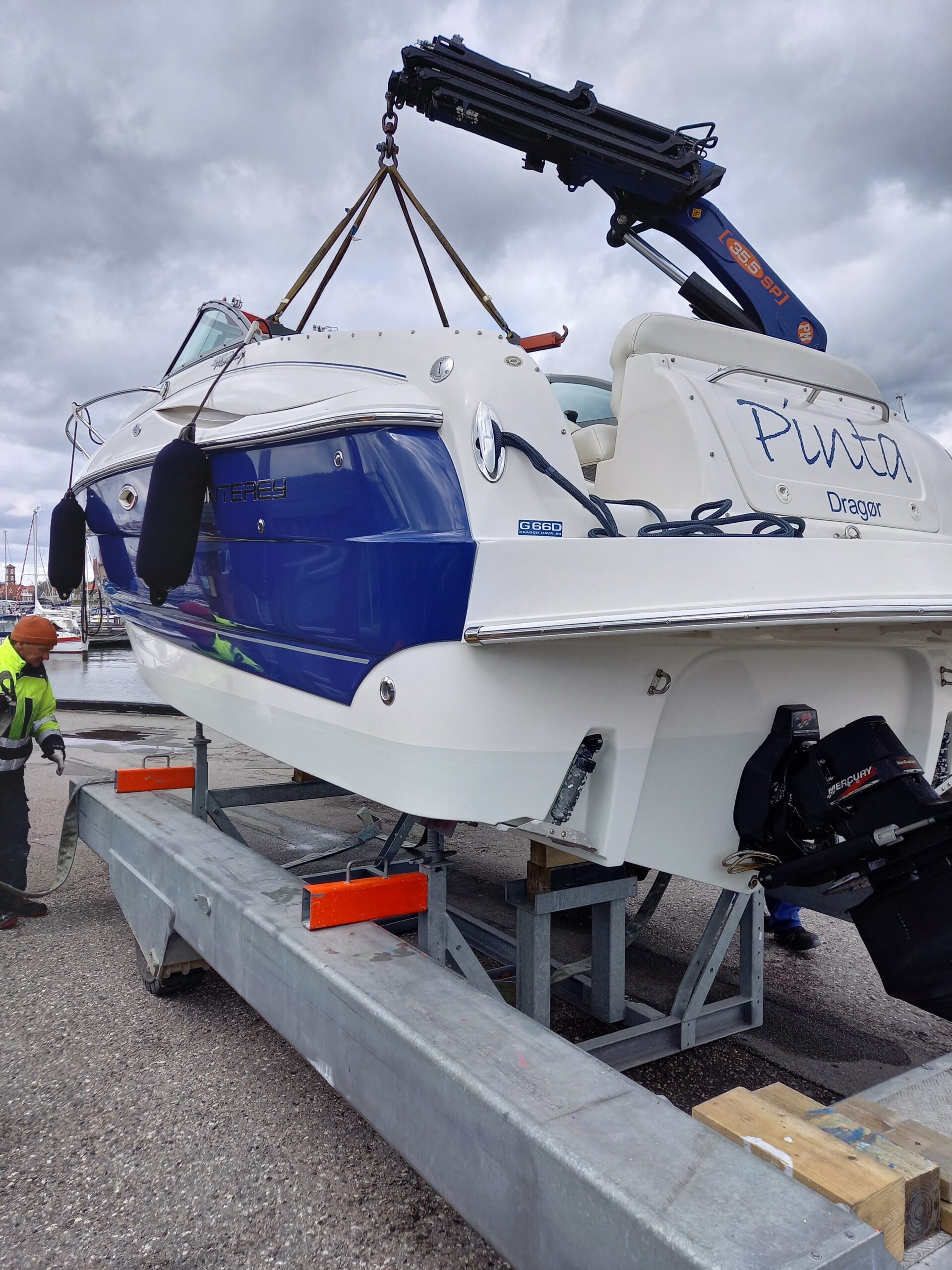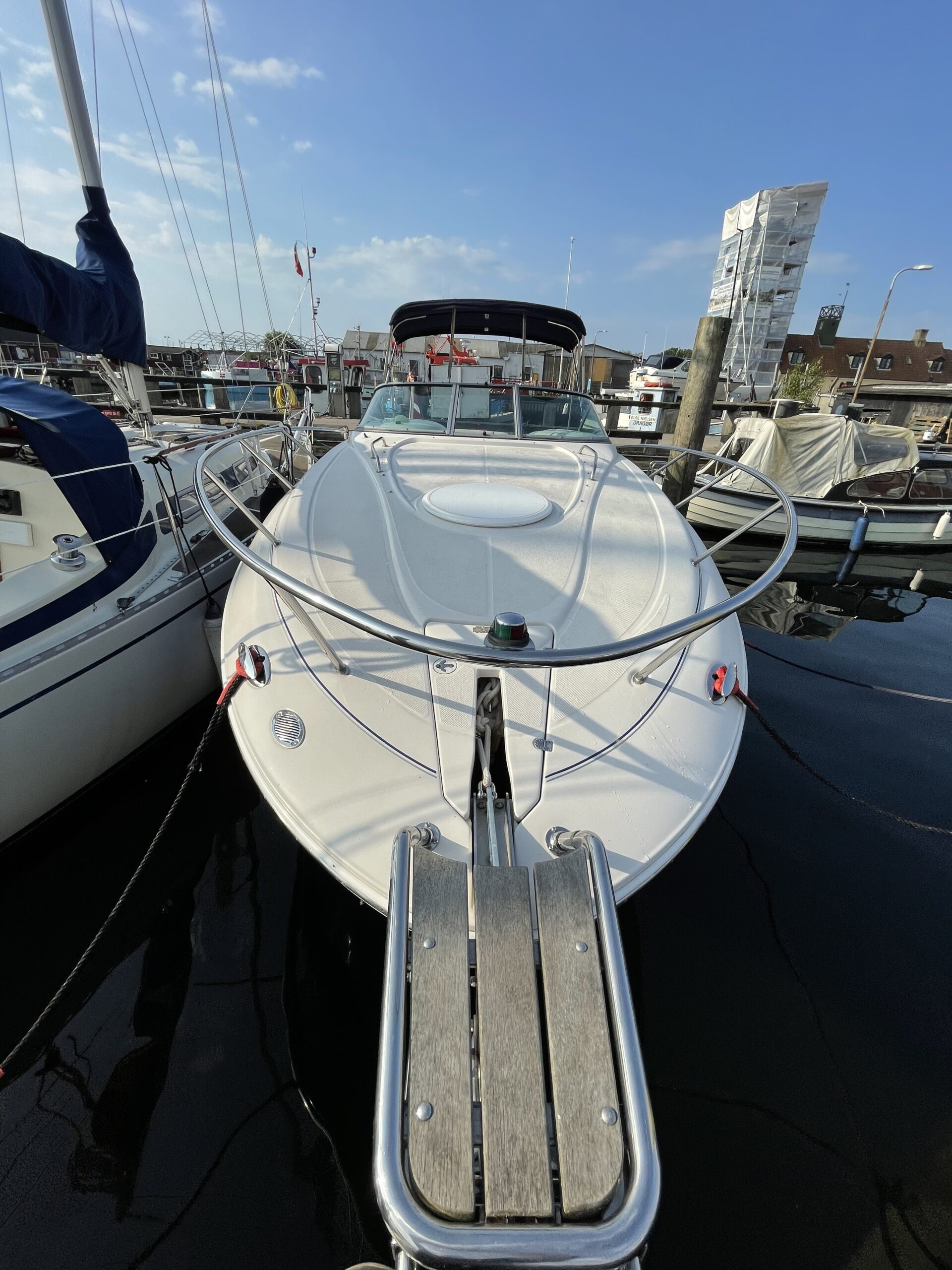 Kvalitetscruiser fra Monterrey – noget af det mest gennemførte,  lækker kvalitet og fine detaljer. Skønt stort cockpit  dejlig badeplatform med badestige. Fin adgang fra badeplatform til cockpit i BB side via gangzone. Sofagruppe med plads til 4-5 voksne. 1 stor køleboks er monteret under vask, bord monteres hurtigt i cockpit således af der kan hygges med en frokost. Trin op til fordækket ved siden af styrestolen. Nedgang til lækker luftig kahyt med U-sofa med bordløsning som kan omgøres til dobbeltkøje rigeligt til 2 voksne og alligevel med plads til junior i midten, Pantry med vask, induktions kogeplade, køleskab og massere af skabsplads. toilet rum med elektrisk toilet, brus og vask. Midt-cabin med dobbeltseng.