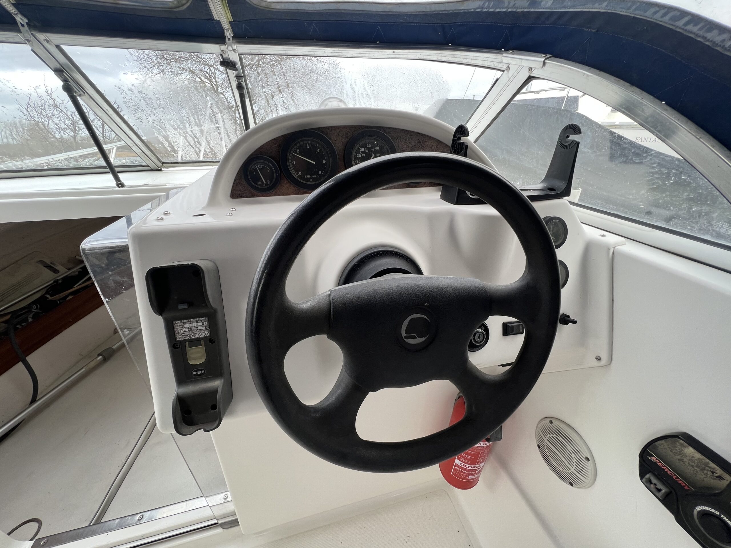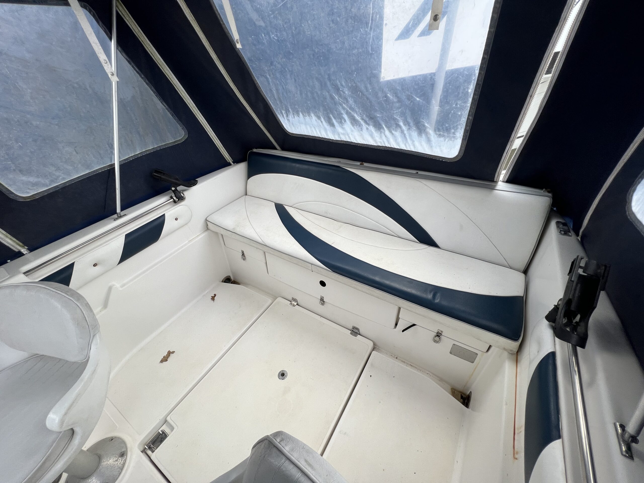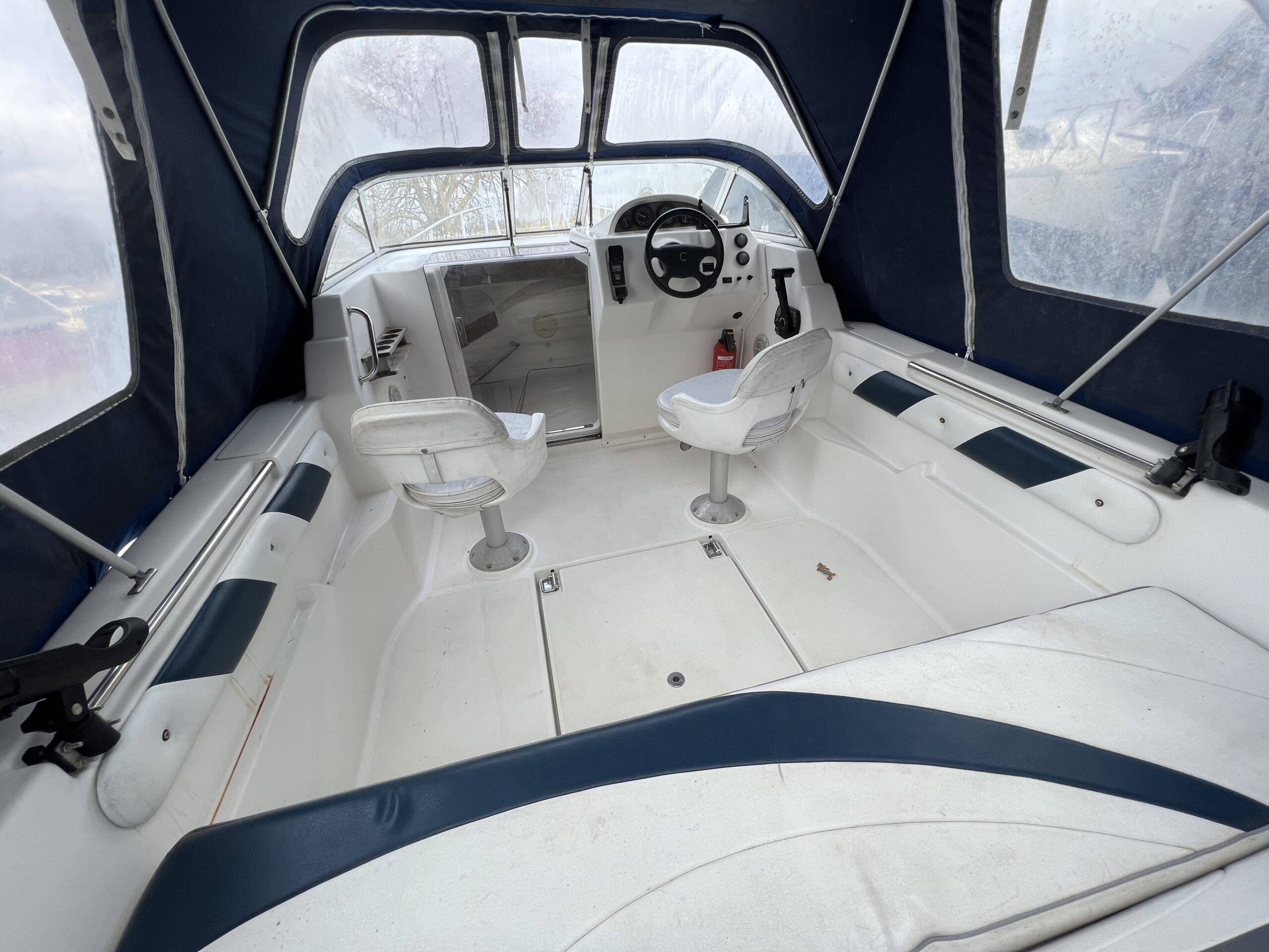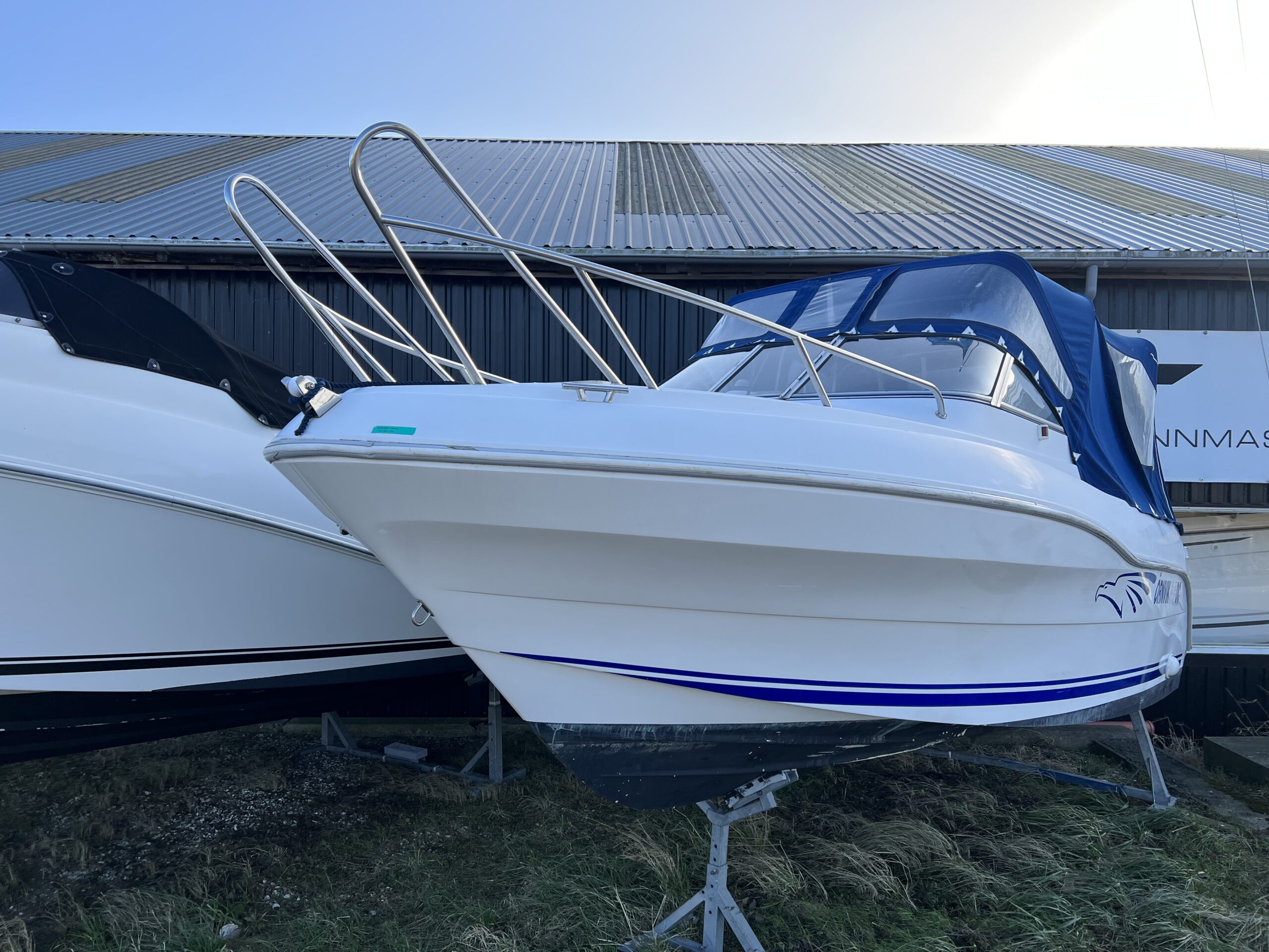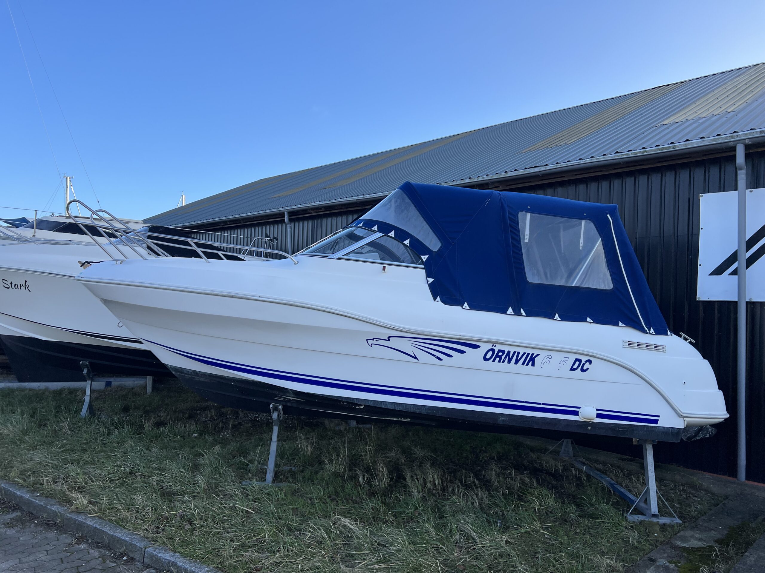 Ørnvik 645 Daycruiser, super rummelig båd med plads op til 5 siddende voksne, med mulighed for bord i midten, ved dårligt vejr kan man sidde i tørvejr under kalechen. bagerste sæder kan ligges ned til en stor solseng der er plads til 2 sovende i kahyt og 2 i cockpit så man kan tage på weekend ture, perfekt til fiskeri og familiehygge. motoren er fra 2017 og er årligt serviceret.