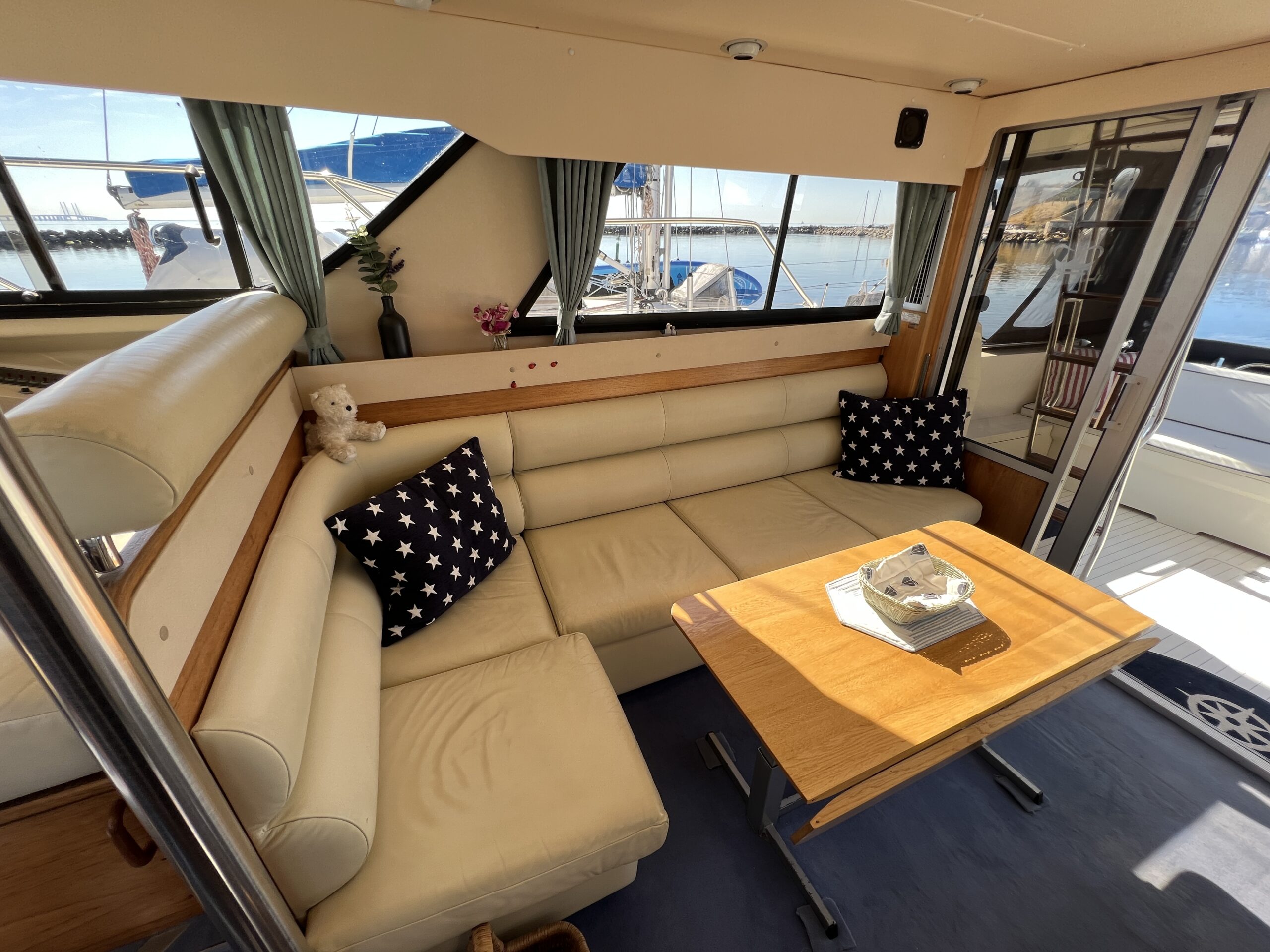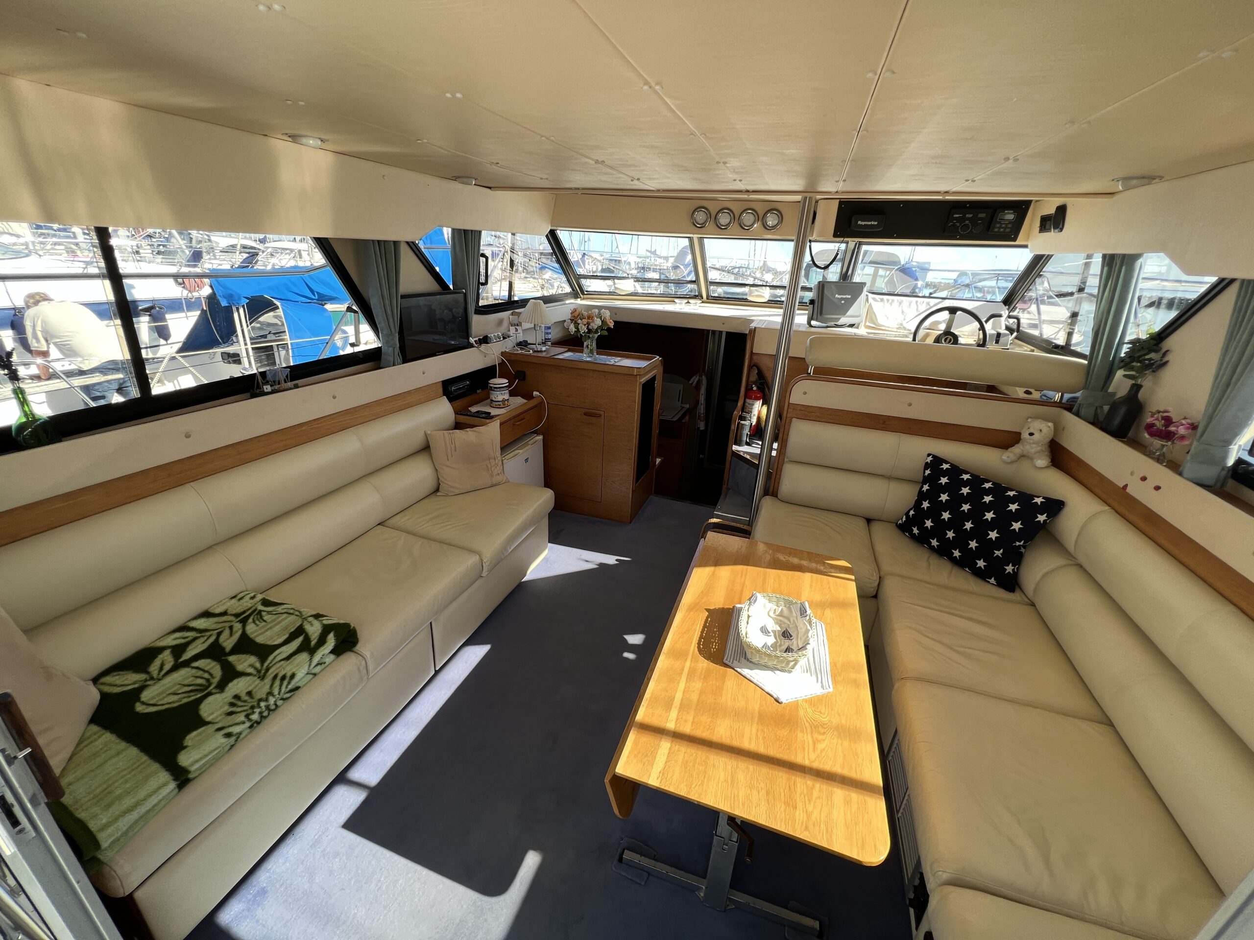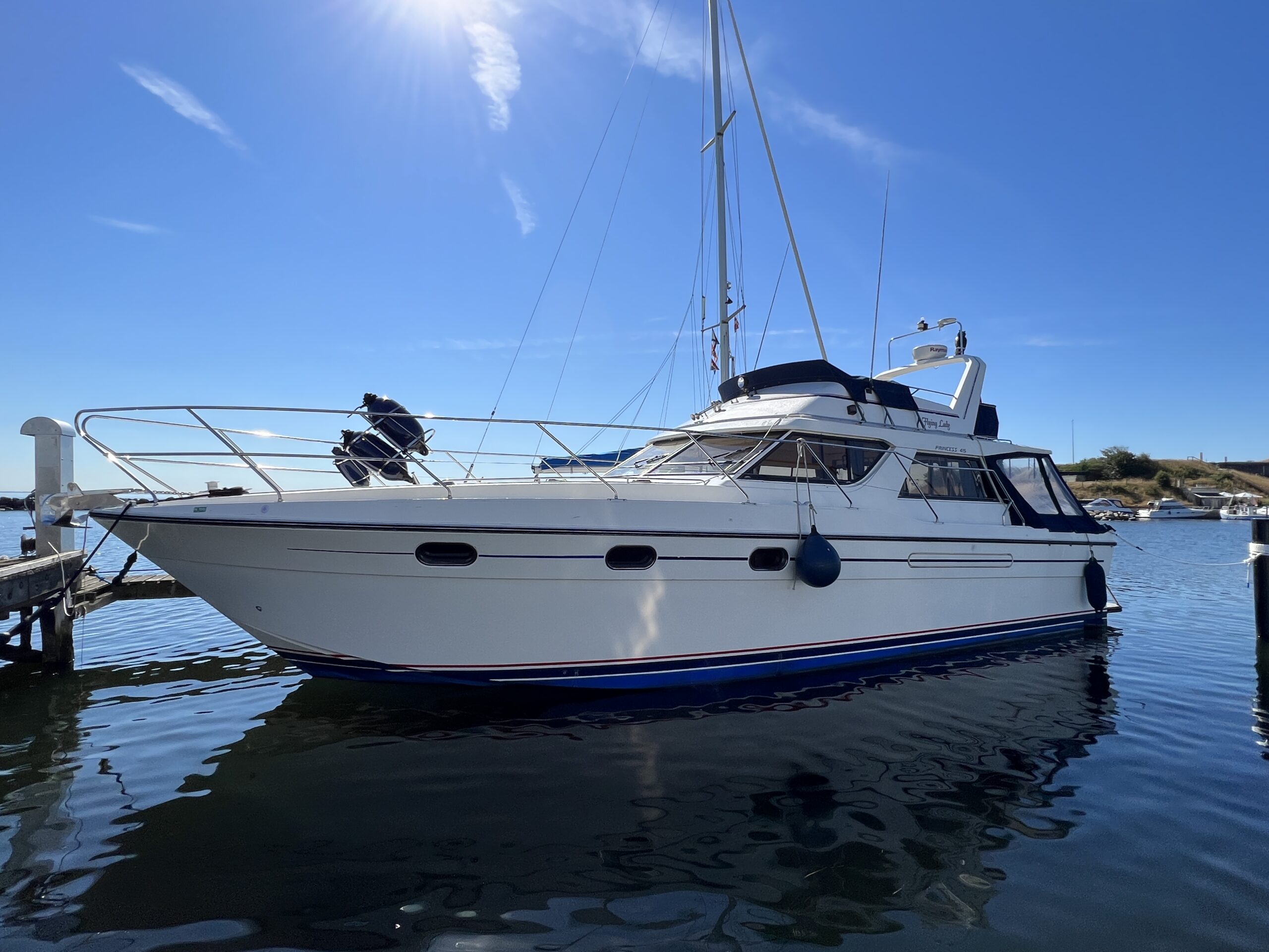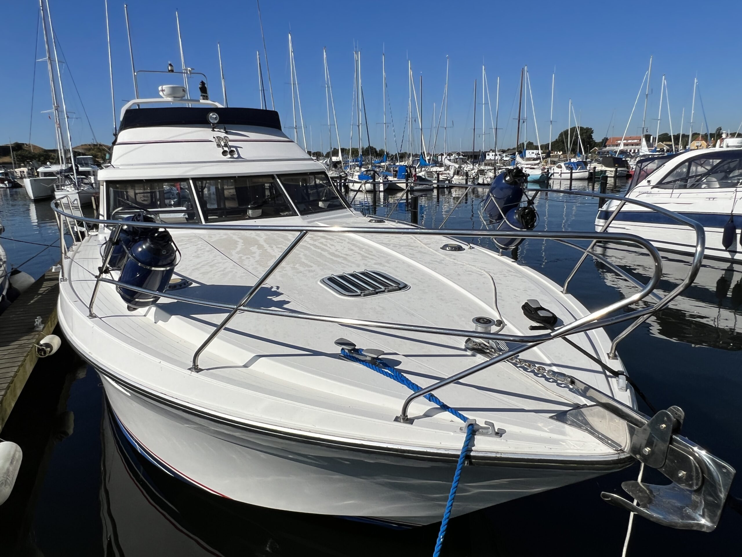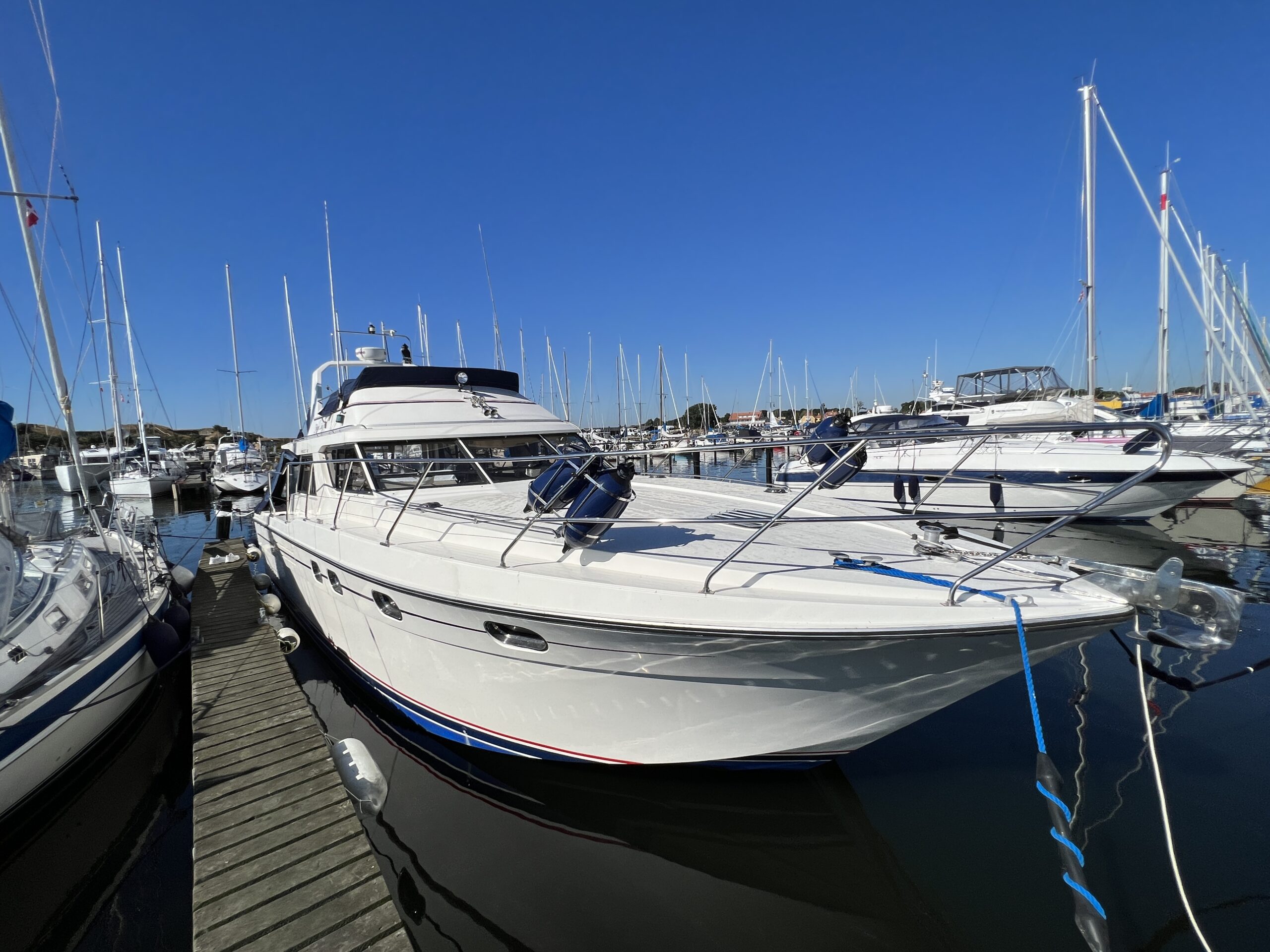 Populær engelsk kvalitetsmotorbåd med god plads og fine sejlegenskaber. Skønt stort agterdæk med gode siddepladser og adgang til badeplatform. Fra agterdæk adgang til flybridge hvor der findes førerplads og passagersæde med vipperyg sålkedes at det kan “deltage” i L-aofaarranementet. Bag skydedørsparti fra agterdæk findes hovedsalon med stor sofagruppe i SB og BB med salonbord. To trin op til dobbelt førerplads med godt udsyn og overblik. Trappe ned til “åben” pantrysektion med alt hvad der skal være. Fordelingsgang til sidekahyt med to enkeltkøjer. Toiletrum med brus og vaskmodul og fremme ownerskahyt med stor dobbeltseng og eget toiletrum med brus og vaskmodul. Masser af skabsplads og stuvrum i hele båden – virkelig fin kvalitetsaptering og gode gennemtænkte løsninger. Båden er velholdt, der er nyere kaleche, Bemærk med Agter og bow truster