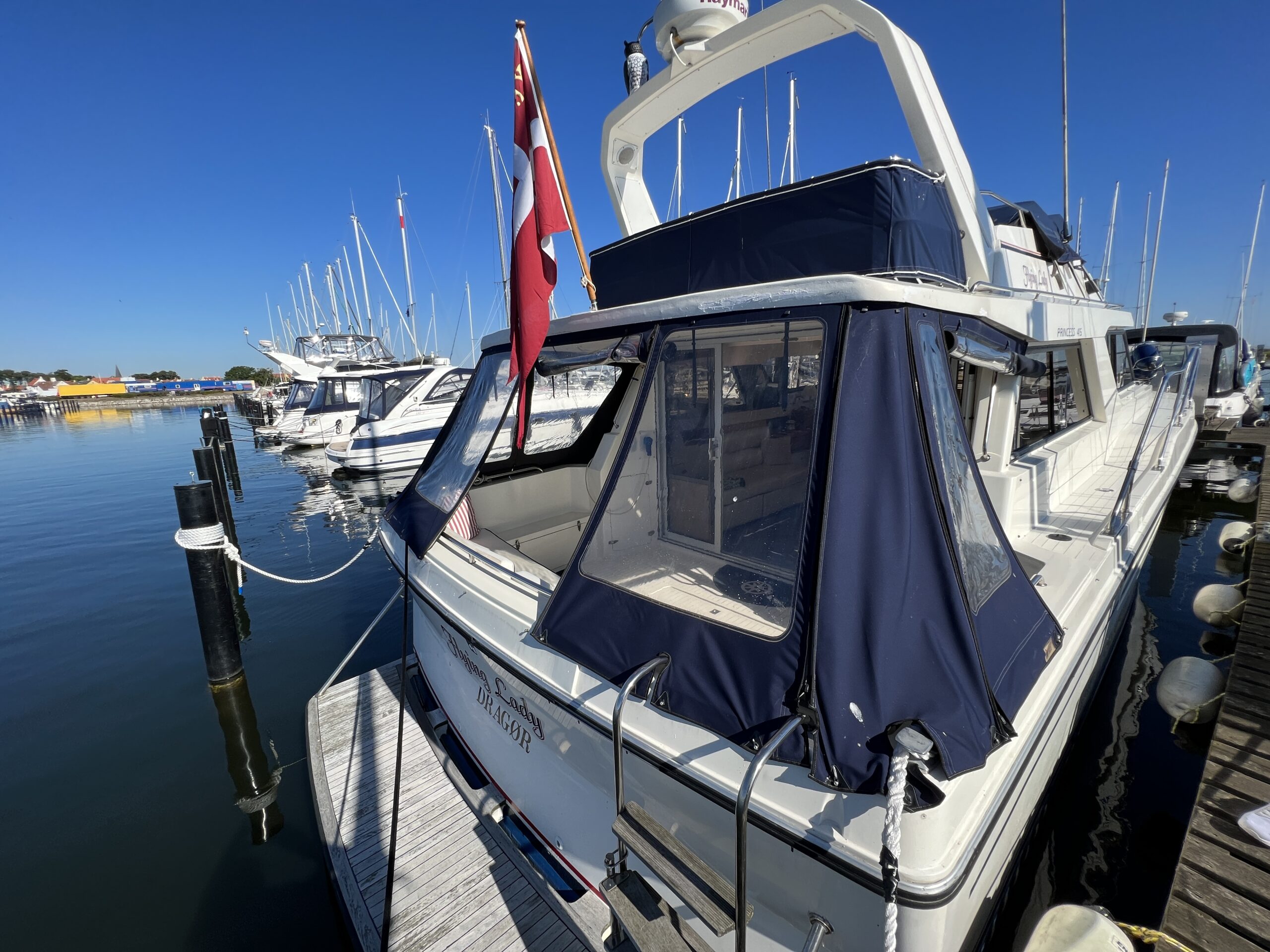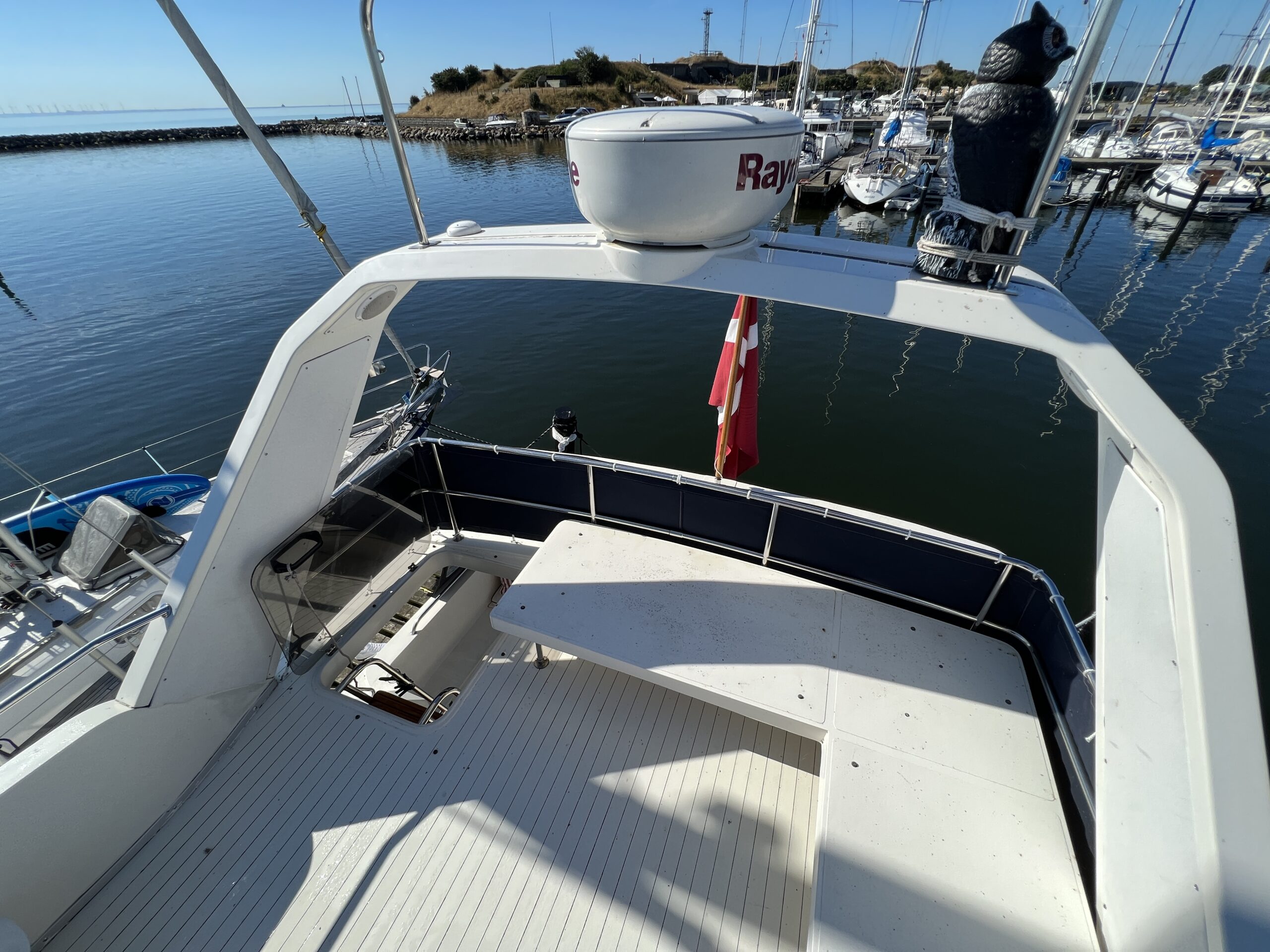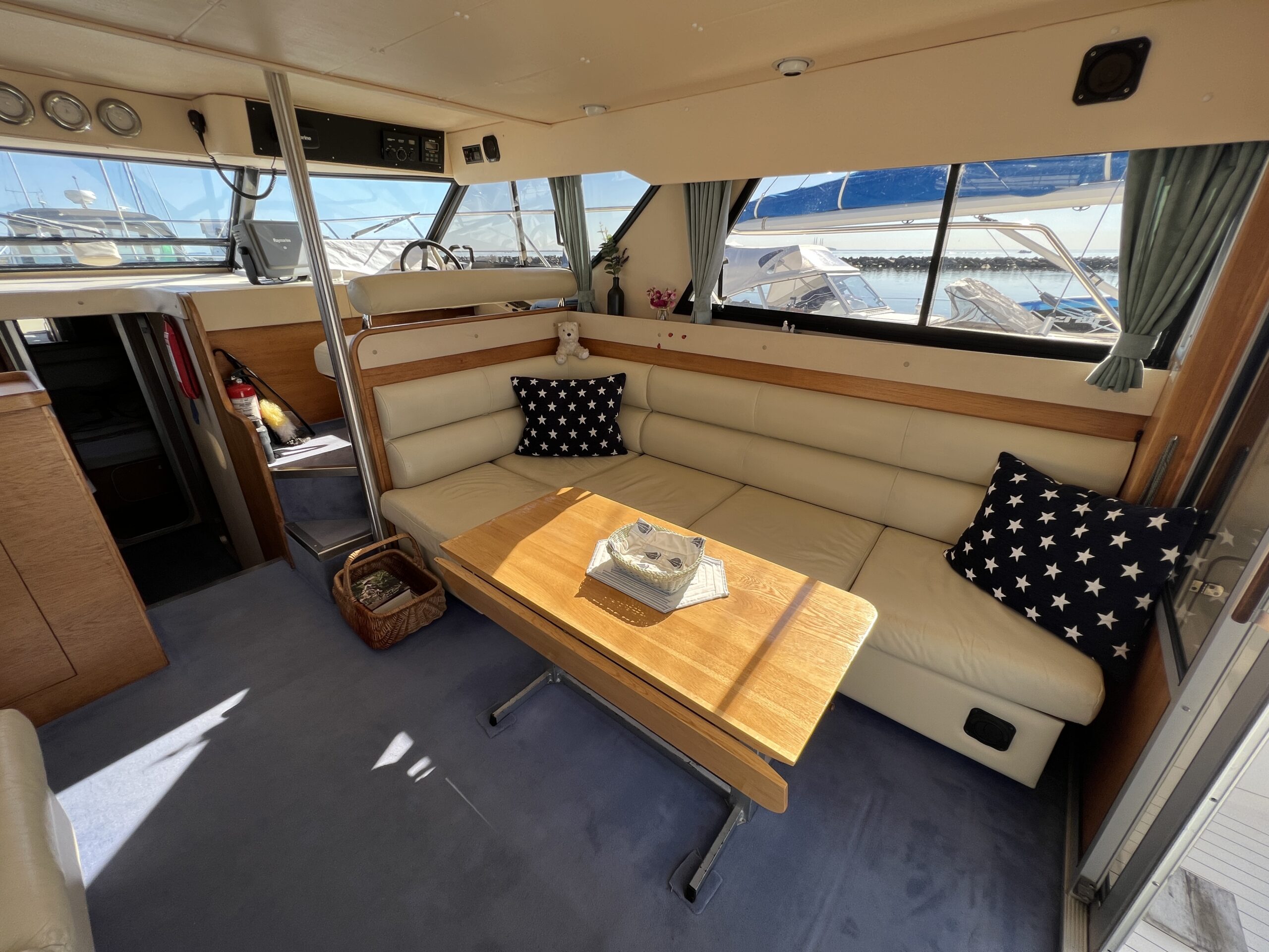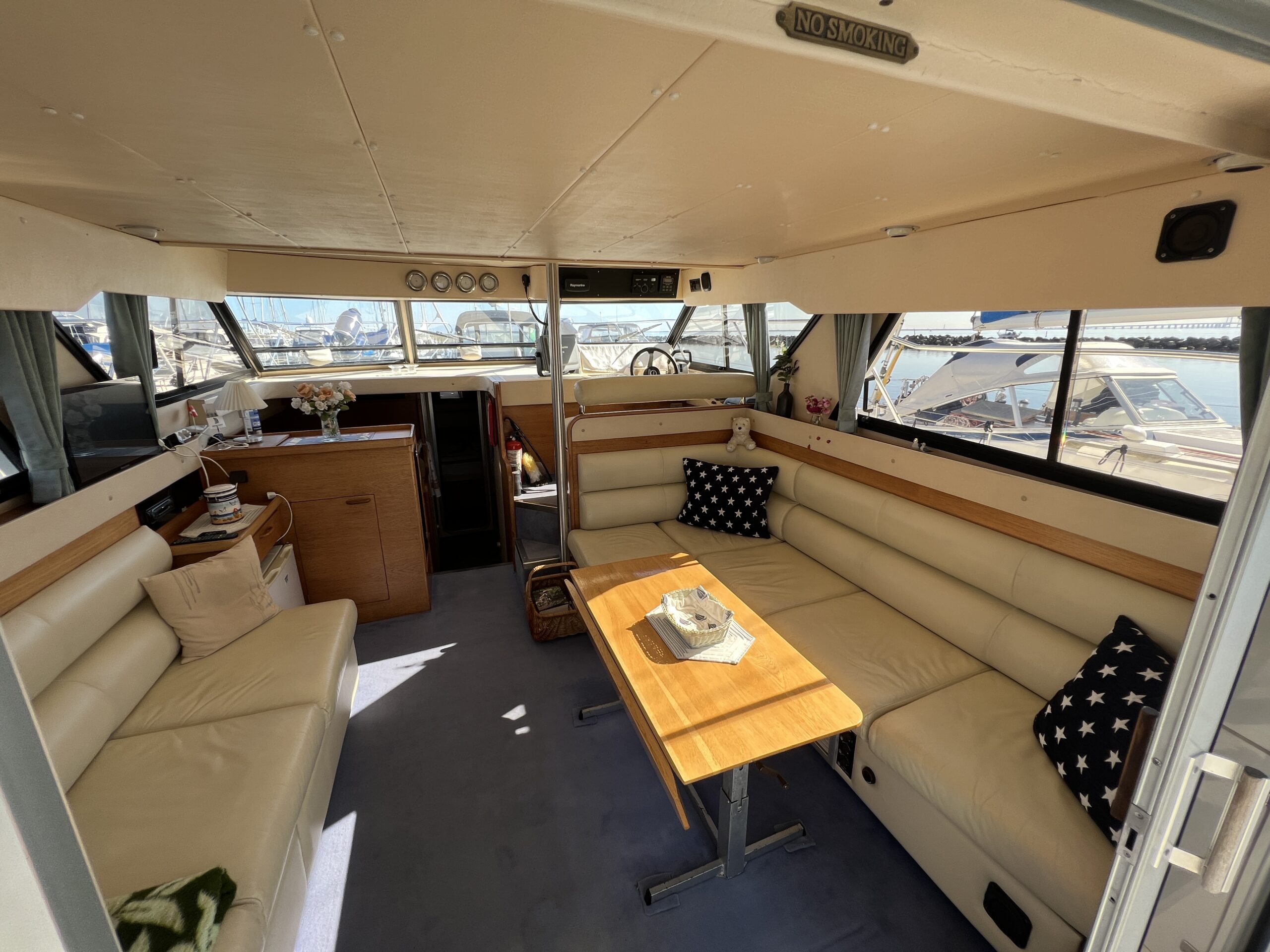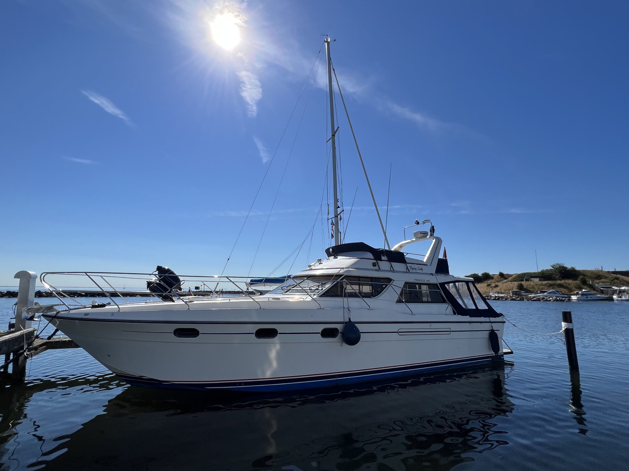 Populær engelsk kvalitetsmotorbåd med god plads og fine sejlegenskaber. Skønt stort agterdæk med gode siddepladser og adgang til badeplatform. Fra agterdæk adgang til flybridge hvor der findes førerplads og passagersæde med vipperyg sålkedes at det kan “deltage” i L-aofaarranementet. Bag skydedørsparti fra agterdæk findes hovedsalon med stor sofagruppe i SB og BB med salonbord. To trin op til dobbelt førerplads med godt udsyn og overblik. Trappe ned til “åben” pantrysektion med alt hvad der skal være. Fordelingsgang til sidekahyt med to enkeltkøjer. Toiletrum med brus og vaskmodul og fremme ownerskahyt med stor dobbeltseng og eget toiletrum med brus og vaskmodul. Masser af skabsplads og stuvrum i hele båden – virkelig fin kvalitetsaptering og gode gennemtænkte løsninger. Båden er velholdt, der er nyere kaleche, Bemærk med Agter og bow truster