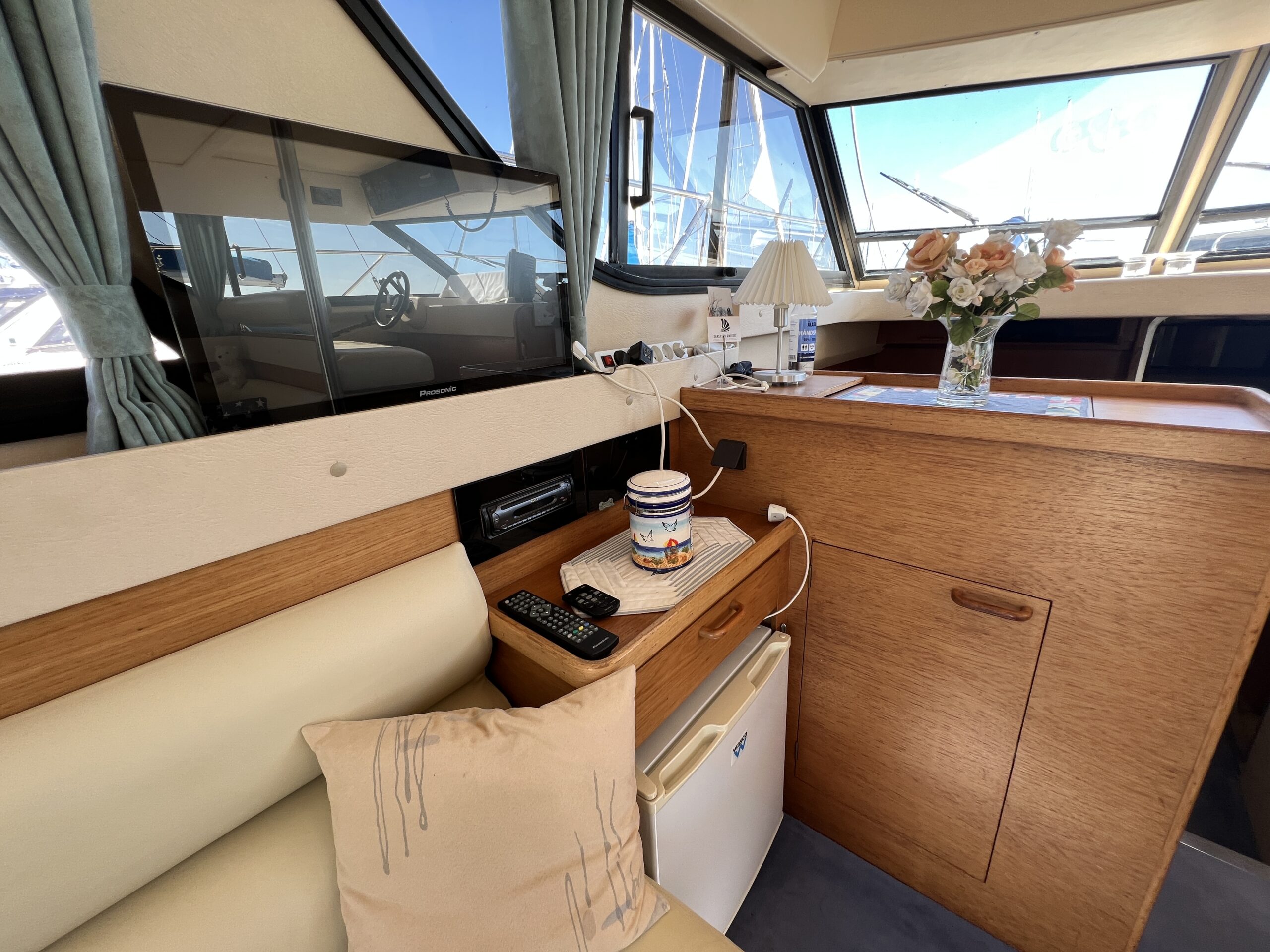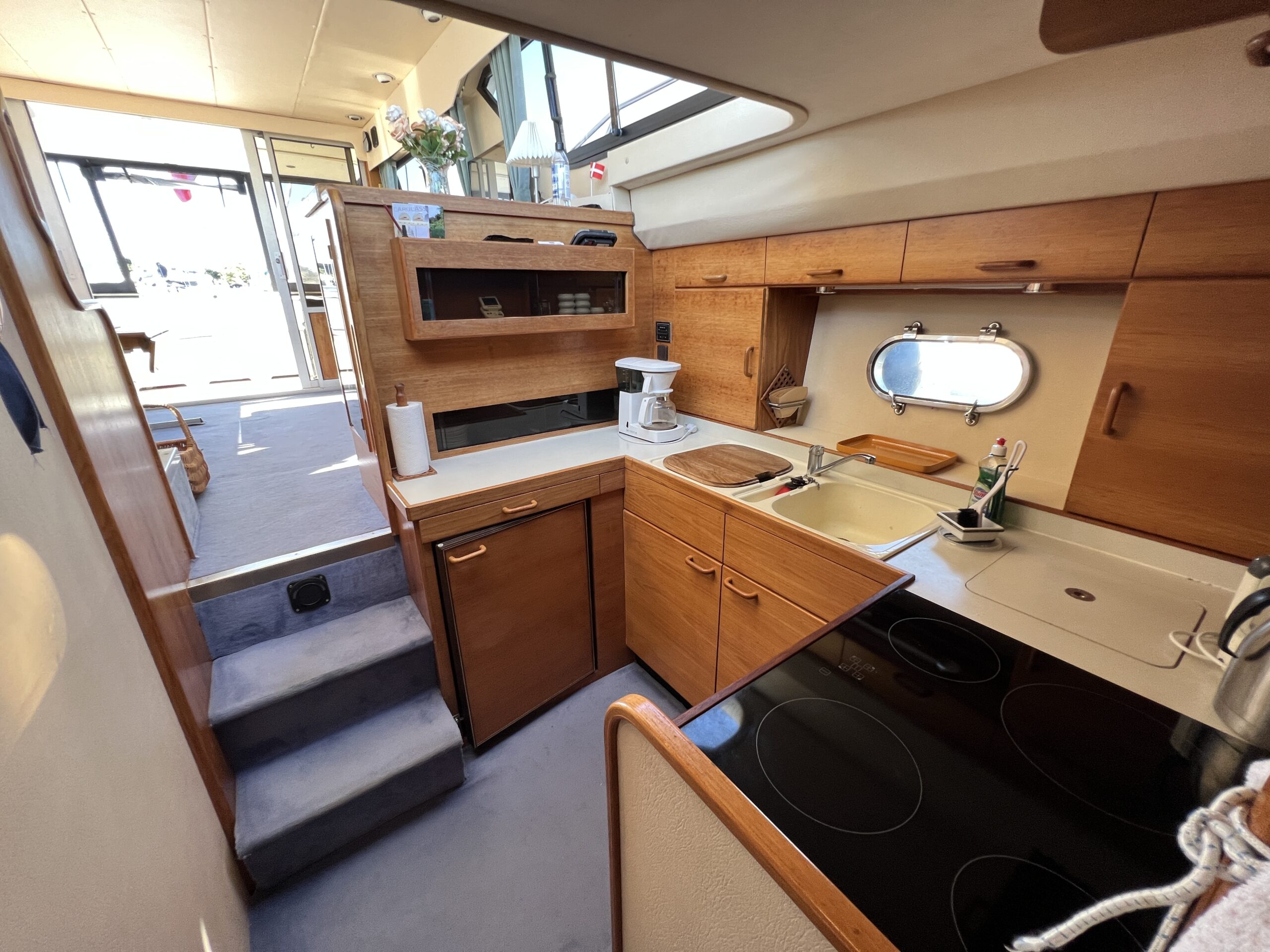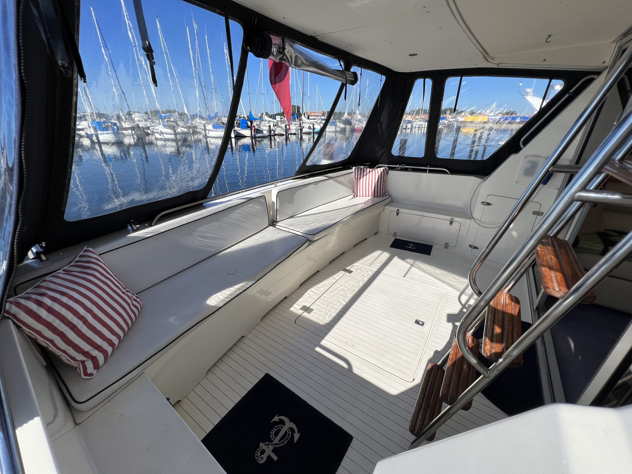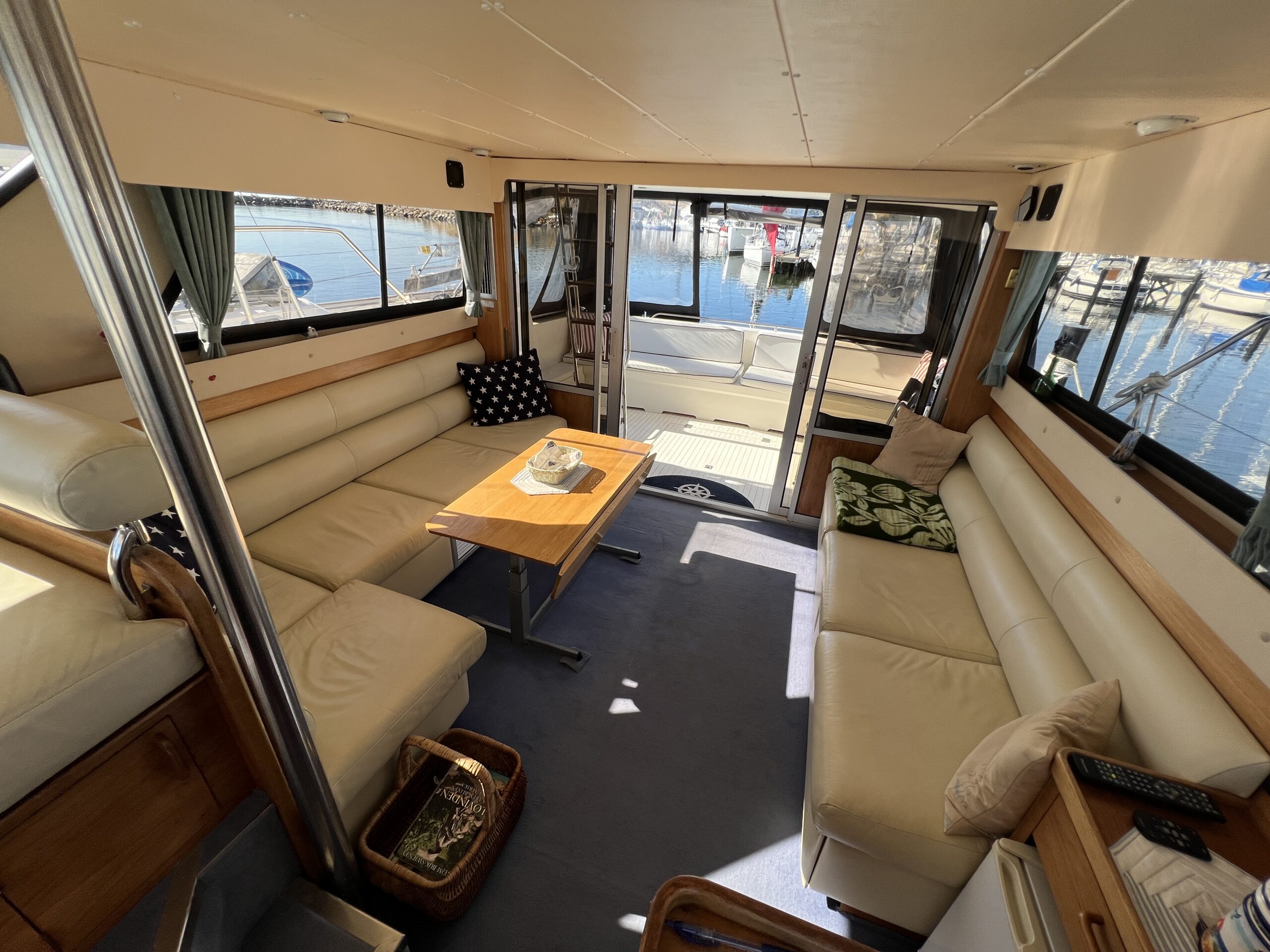 Populær engelsk kvalitetsmotorbåd med god plads og fine sejlegenskaber. Skønt stort agterdæk med gode siddepladser og adgang til badeplatform. Fra agterdæk adgang til flybridge hvor der findes førerplads og passagersæde med vipperyg sålkedes at det kan “deltage” i L-aofaarranementet. Bag skydedørsparti fra agterdæk findes hovedsalon med stor sofagruppe i SB og BB med salonbord. To trin op til dobbelt førerplads med godt udsyn og overblik. Trappe ned til “åben” pantrysektion med alt hvad der skal være. Fordelingsgang til sidekahyt med to enkeltkøjer. Toiletrum med brus og vaskmodul og fremme ownerskahyt med stor dobbeltseng og eget toiletrum med brus og vaskmodul. Masser af skabsplads og stuvrum i hele båden – virkelig fin kvalitetsaptering og gode gennemtænkte løsninger. Båden er velholdt, der er nyere kaleche, Bemærk med Agter og bow truster