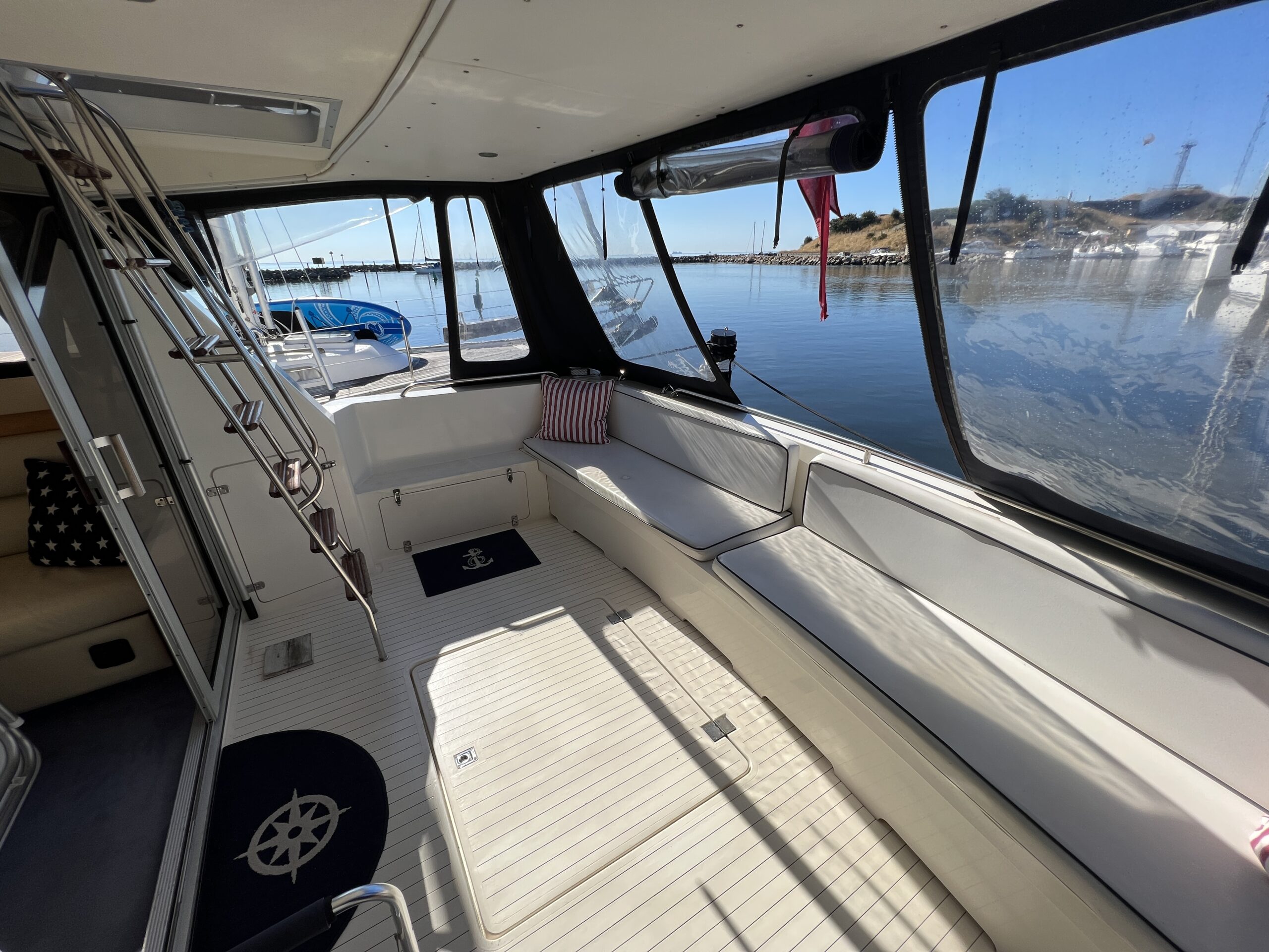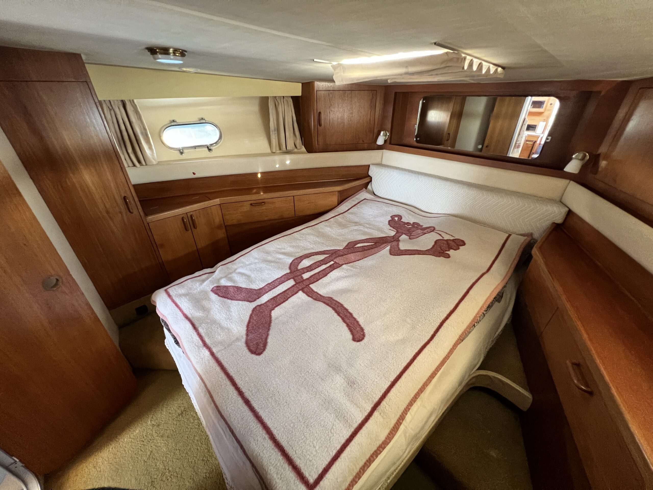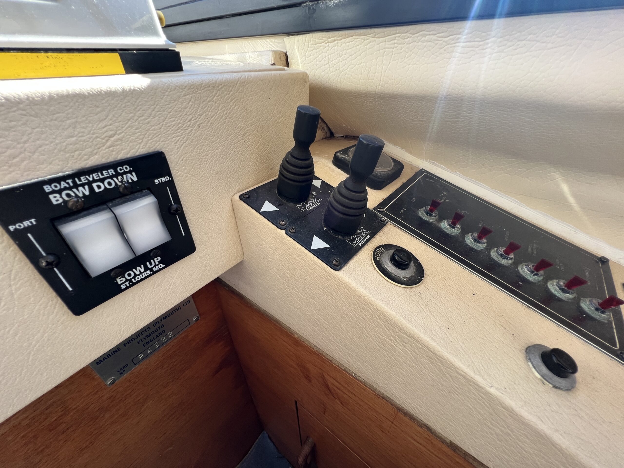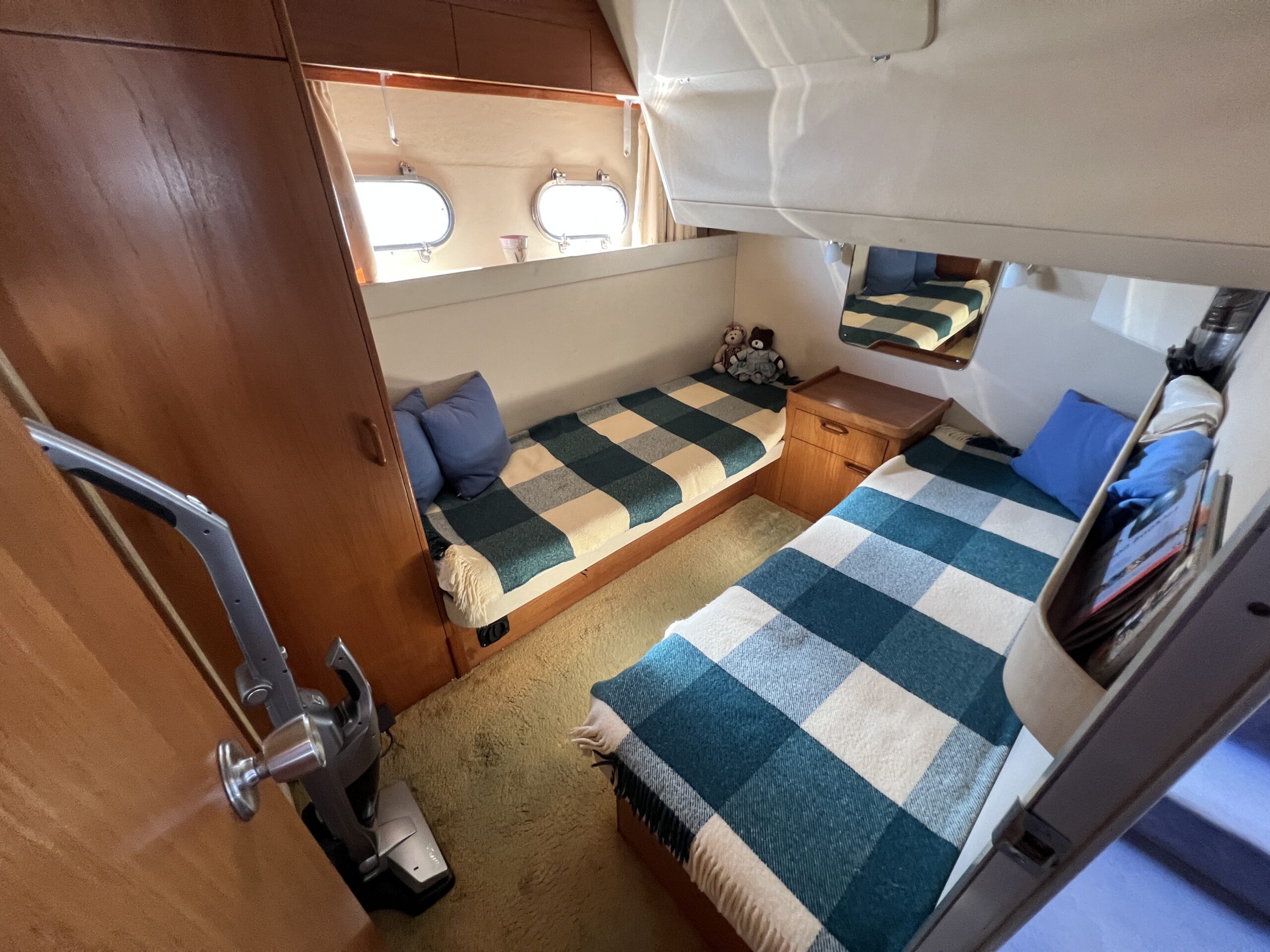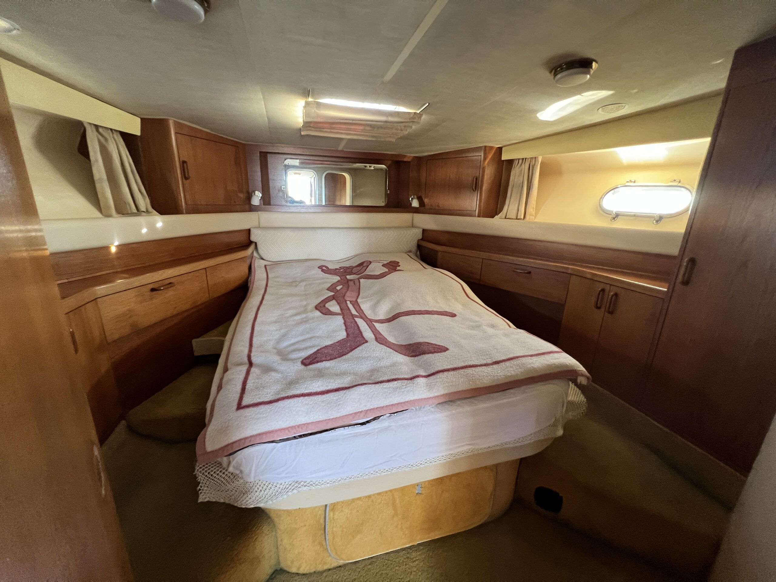 Populær engelsk kvalitetsmotorbåd med god plads og fine sejlegenskaber. Skønt stort agterdæk med gode siddepladser og adgang til badeplatform. Fra agterdæk adgang til flybridge hvor der findes førerplads og passagersæde med vipperyg sålkedes at det kan “deltage” i L-aofaarranementet. Bag skydedørsparti fra agterdæk findes hovedsalon med stor sofagruppe i SB og BB med salonbord. To trin op til dobbelt førerplads med godt udsyn og overblik. Trappe ned til “åben” pantrysektion med alt hvad der skal være. Fordelingsgang til sidekahyt med to enkeltkøjer. Toiletrum med brus og vaskmodul og fremme ownerskahyt med stor dobbeltseng og eget toiletrum med brus og vaskmodul. Masser af skabsplads og stuvrum i hele båden – virkelig fin kvalitetsaptering og gode gennemtænkte løsninger. Båden er velholdt, der er nyere kaleche, Bemærk med Agter og bow truster