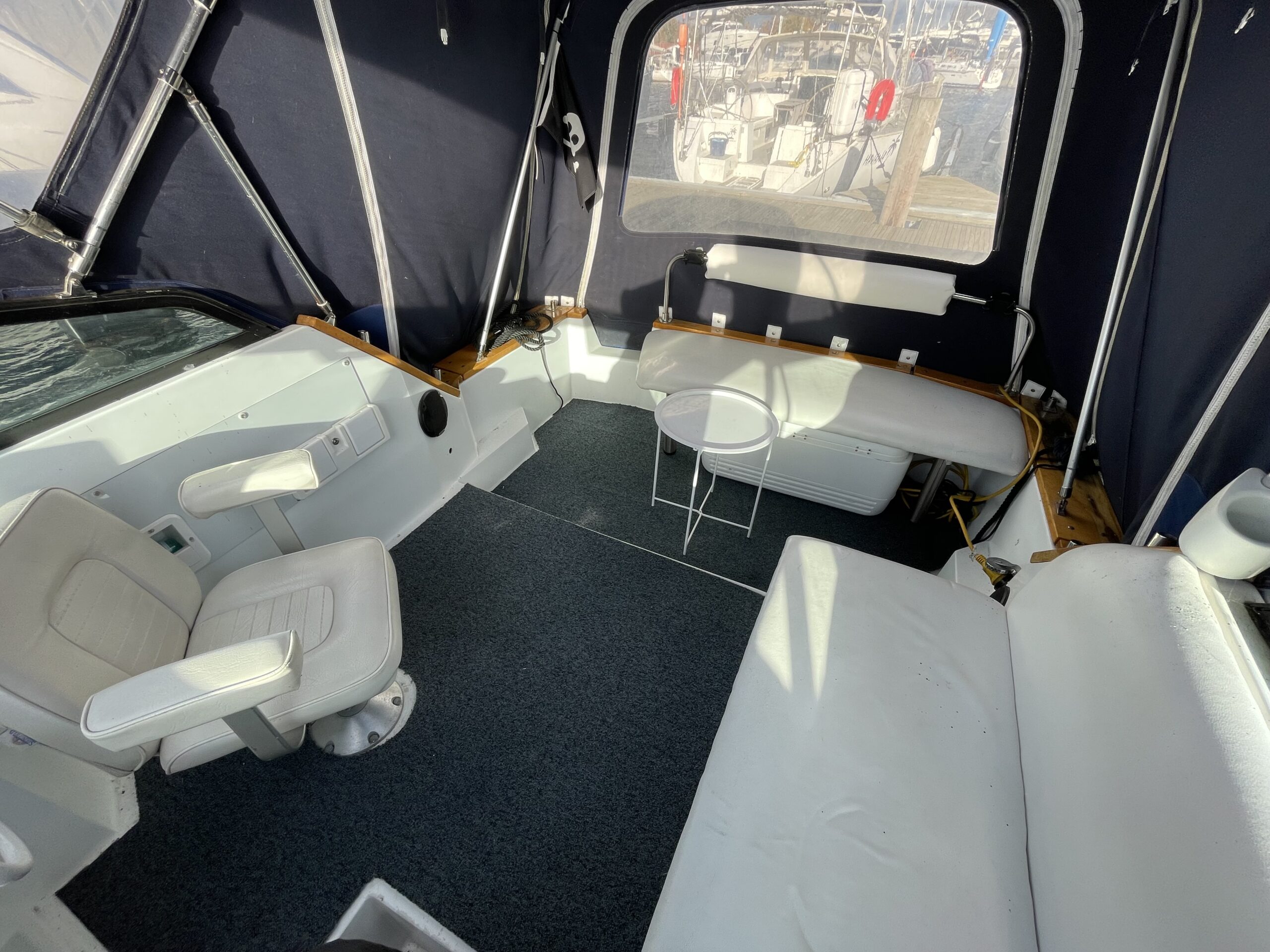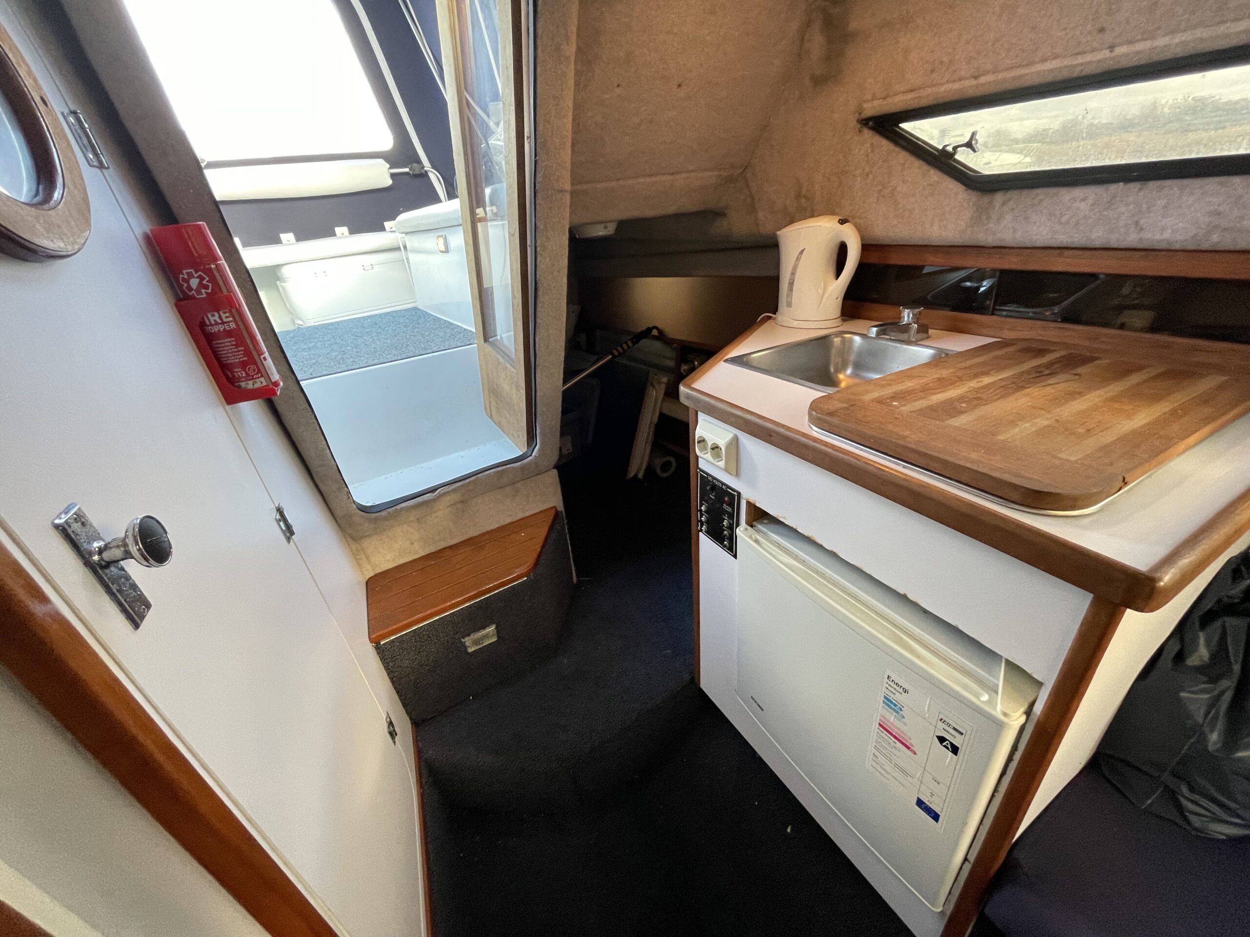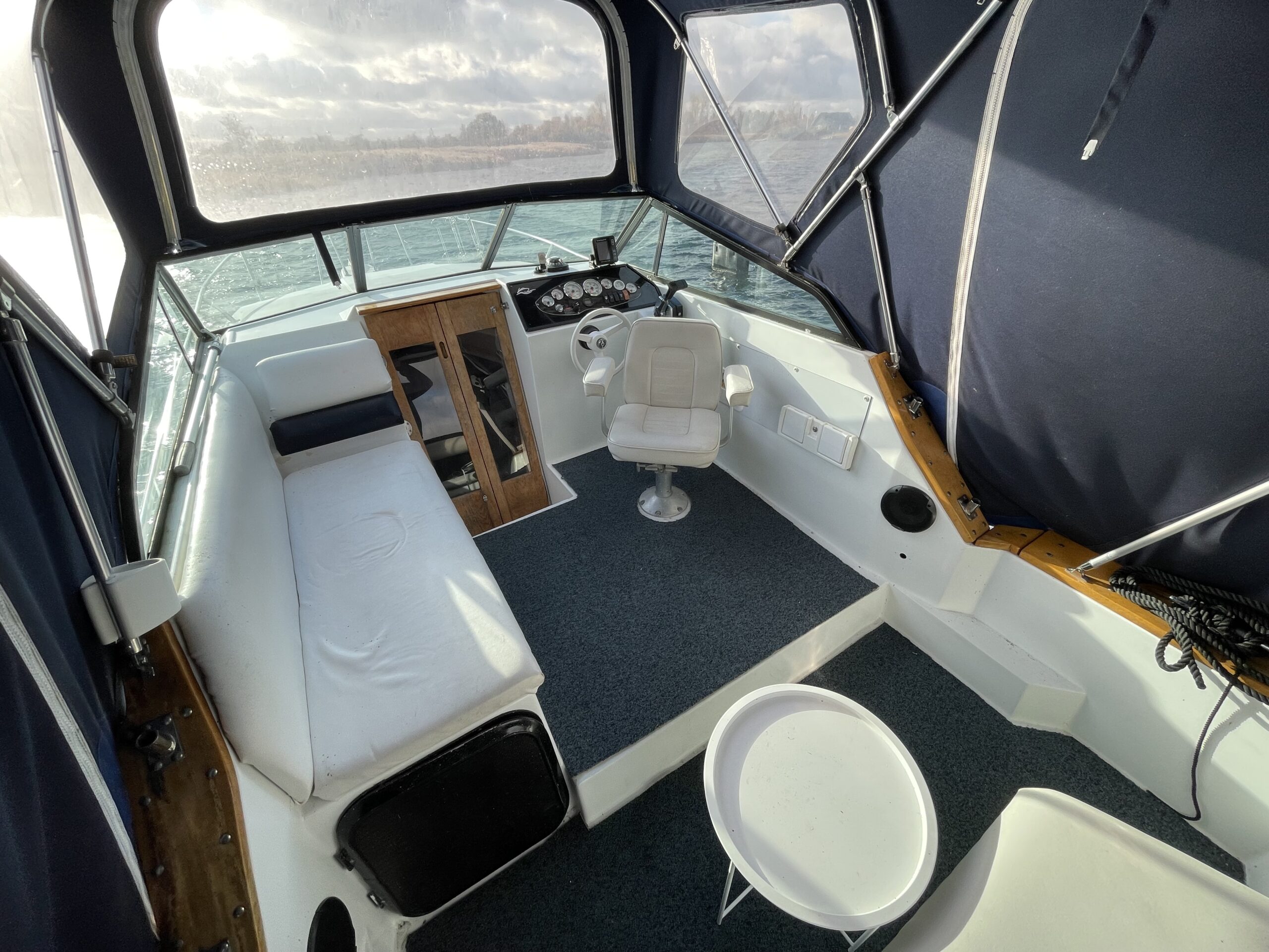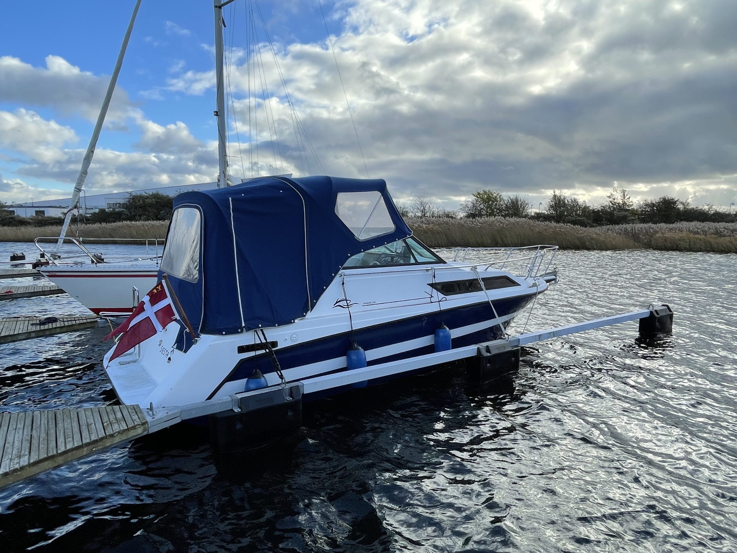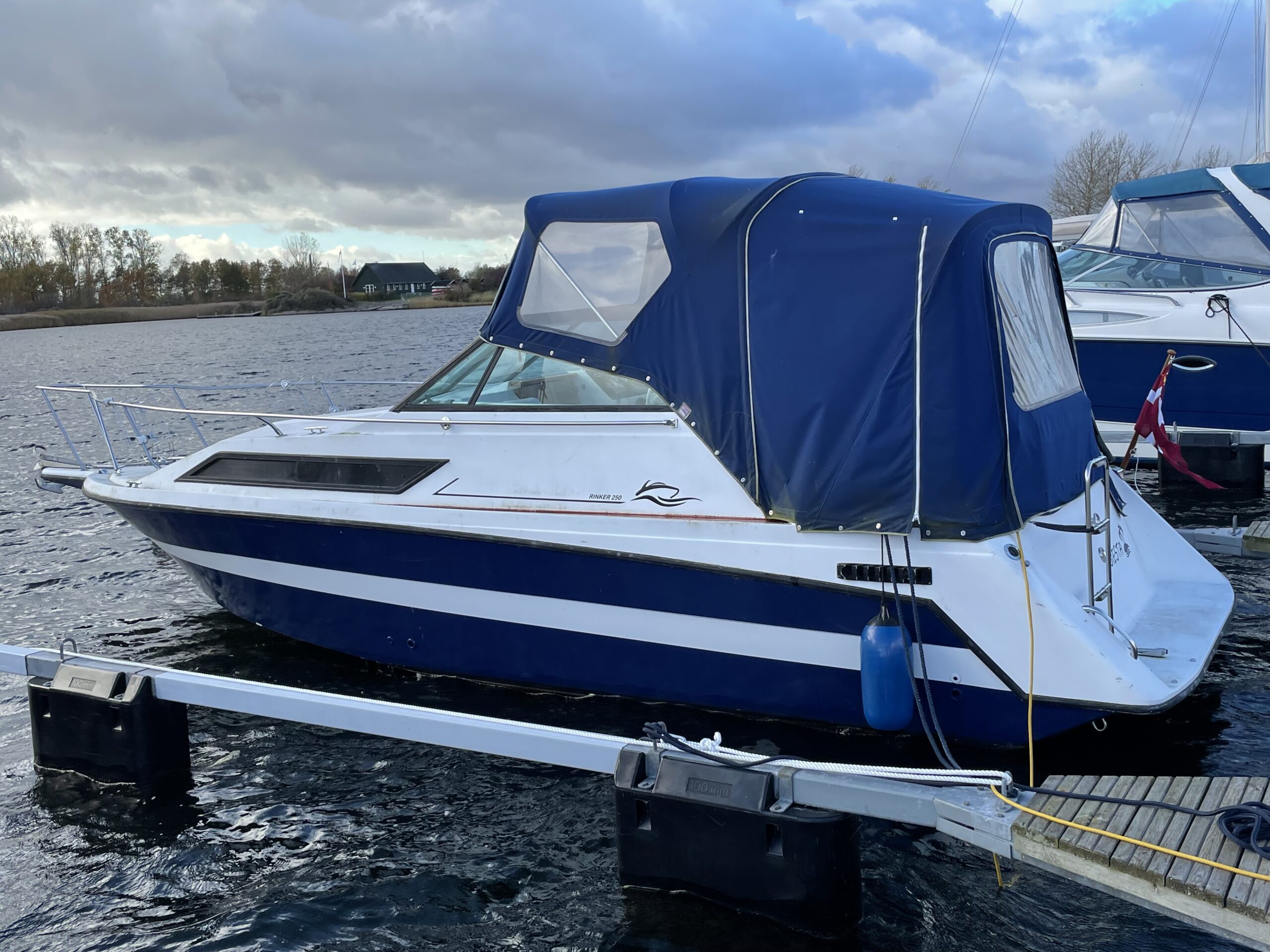 Rinker 250 Fiesta med velfungerende motor. Cockpit med agter sofabænk og sofaarrangement med bord samt førestol. Stor camperkaleche. Kahyt med sofagruppe med bord som kan omgøres til dobbeltkøje. Dobbeltkøje under cockpit. Pantrysektion med vask og køleskab . Toiletrum med vaskemodul.