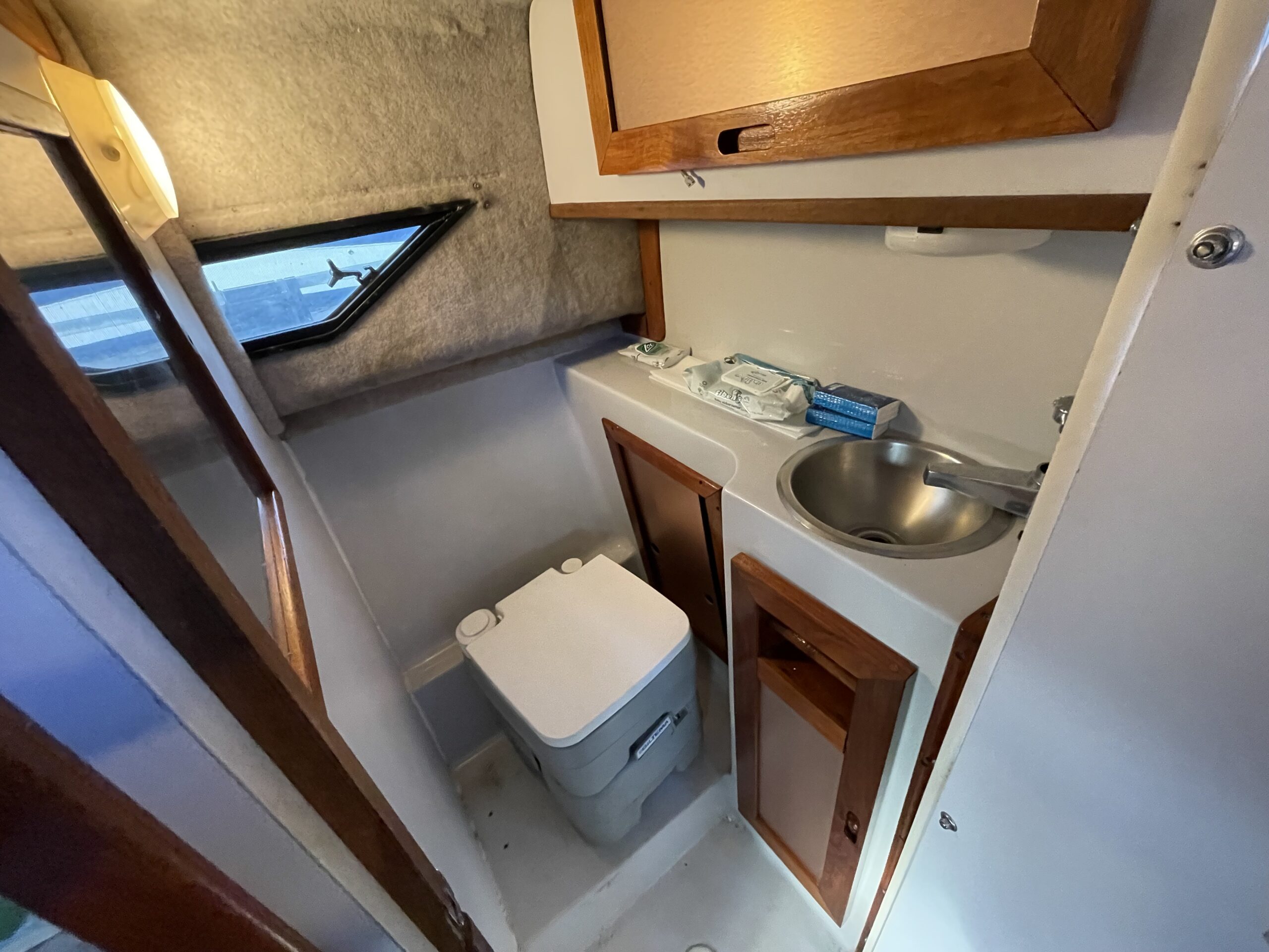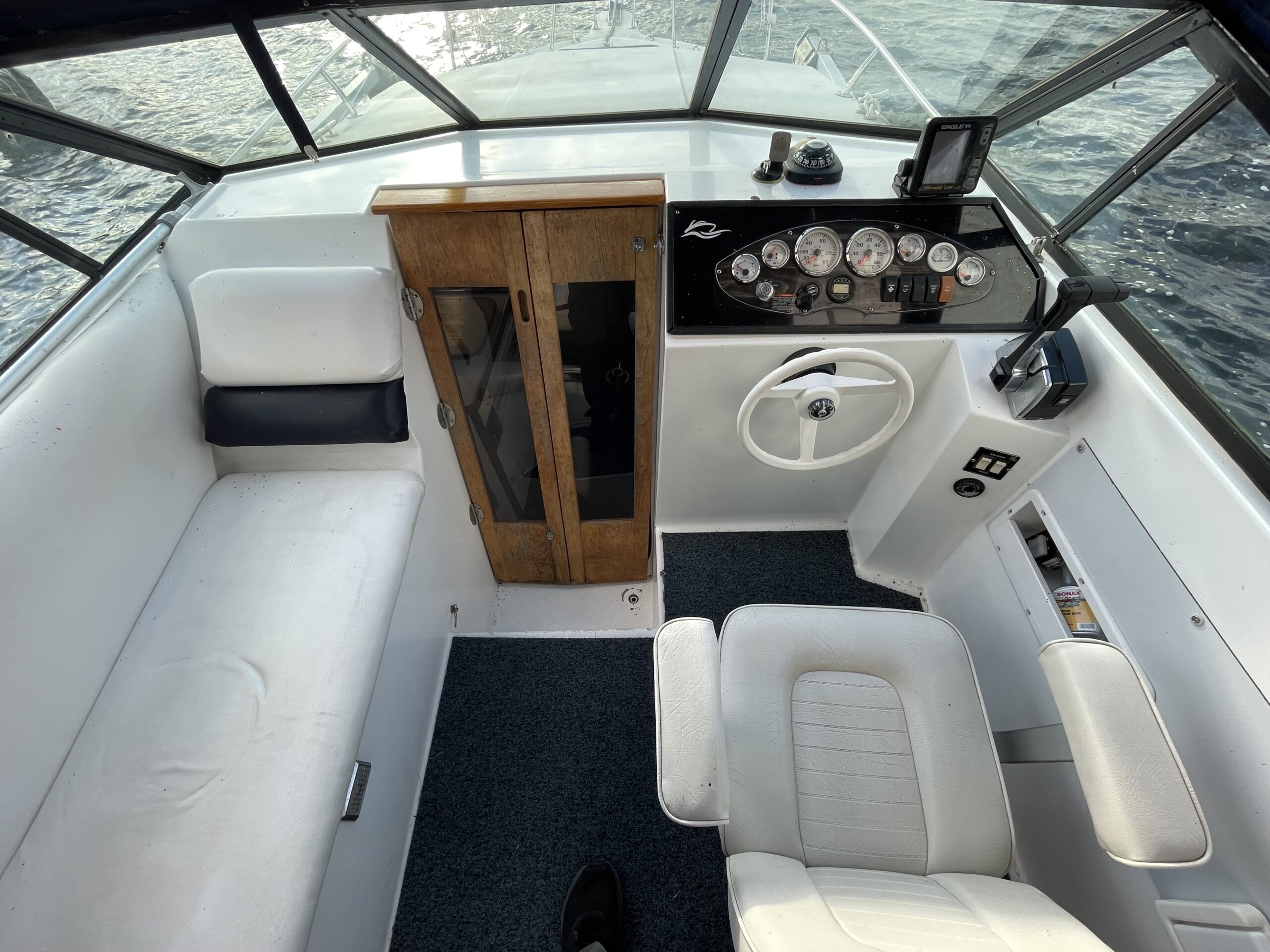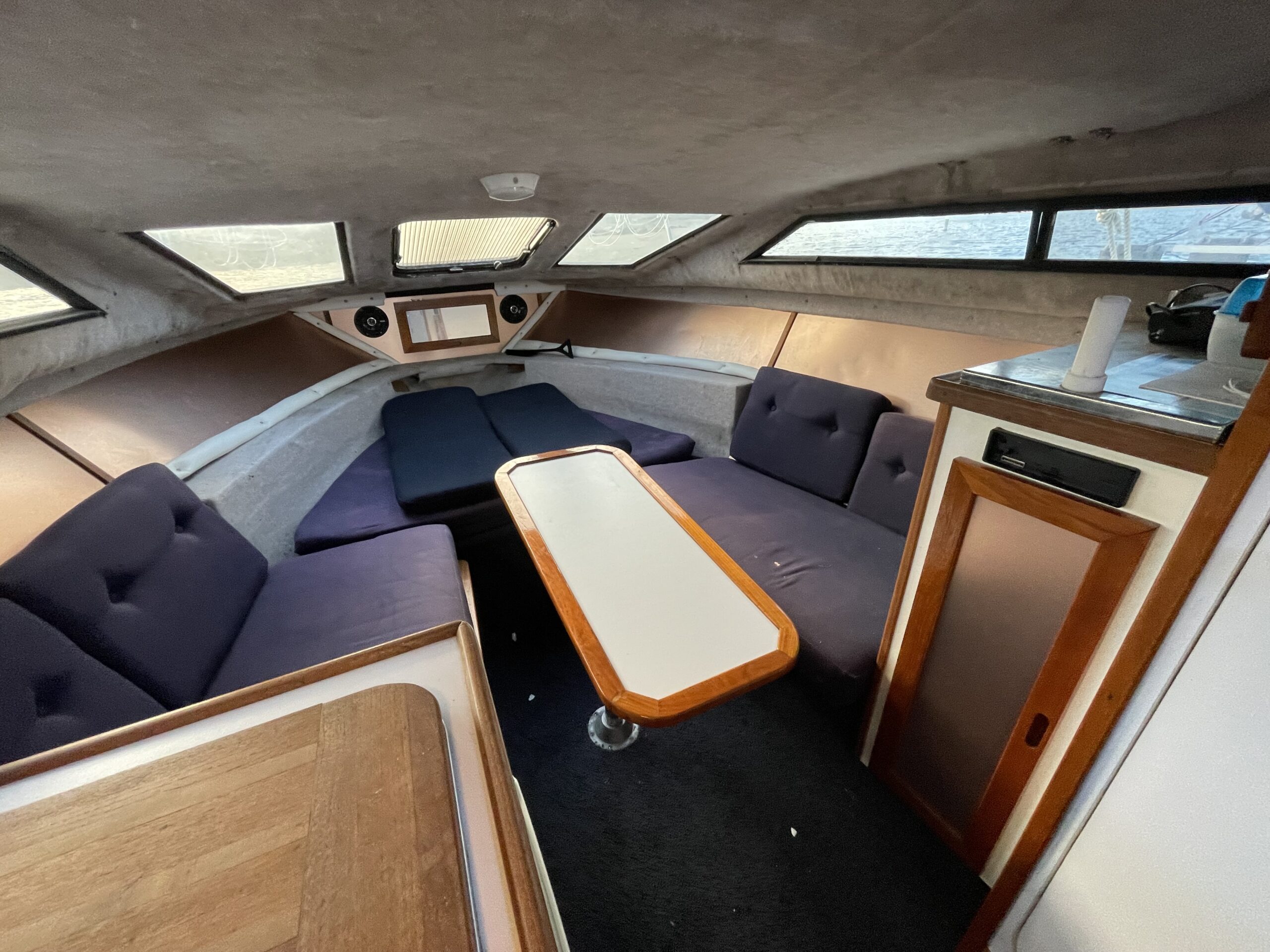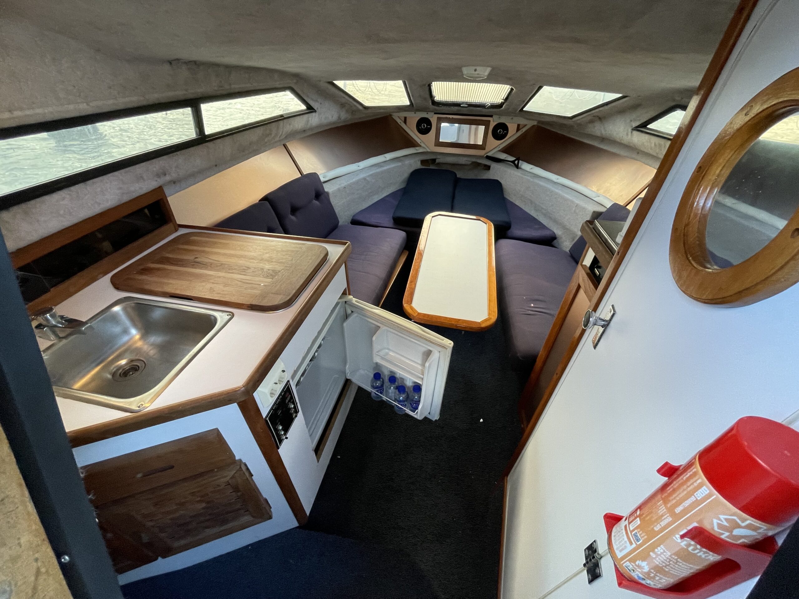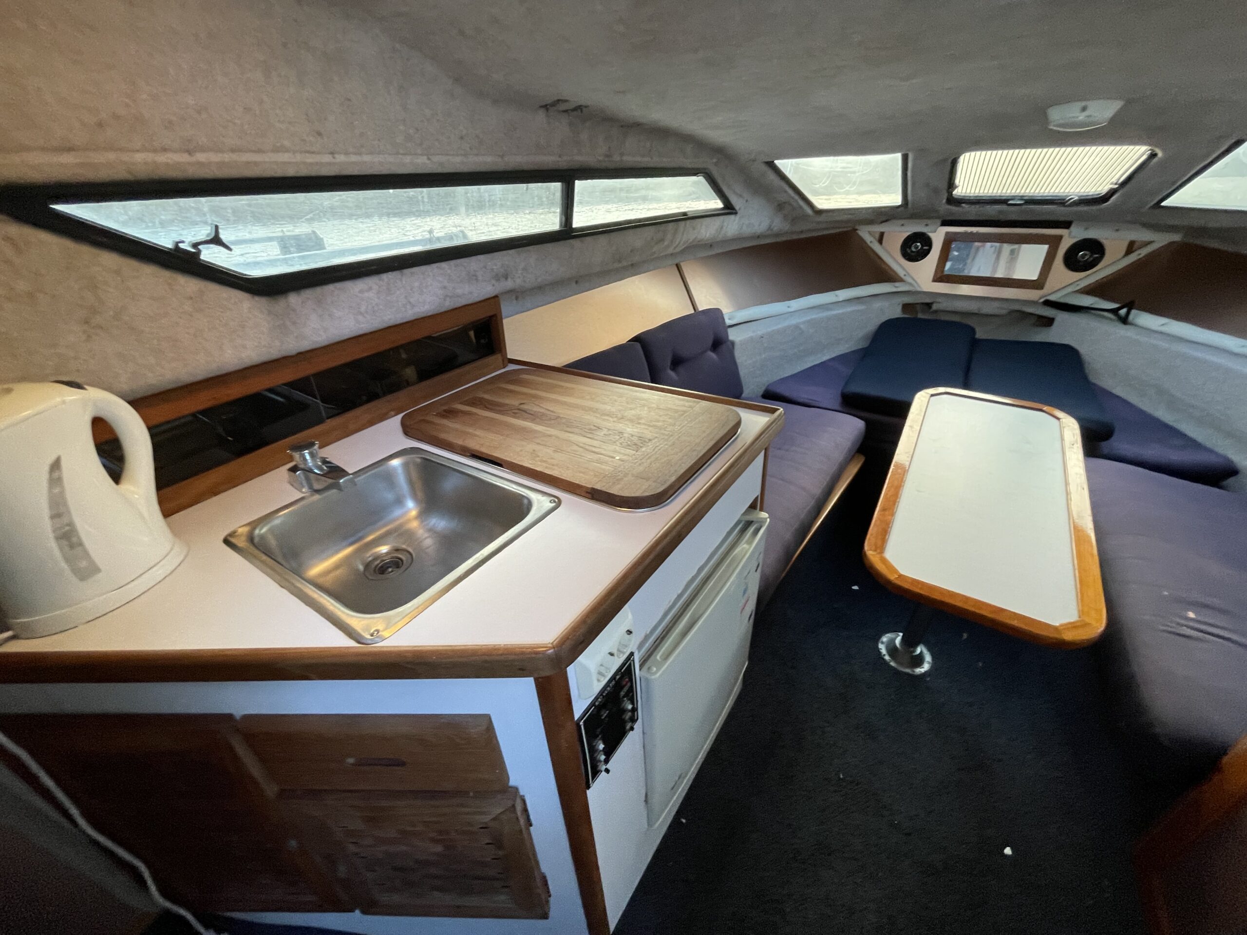 Rinker 250 Fiesta med velfungerende motor. Cockpit med agter sofabænk og sofaarrangement med bord samt førestol. Stor camperkaleche. Kahyt med sofagruppe med bord som kan omgøres til dobbeltkøje. Dobbeltkøje under cockpit. Pantrysektion med vask og køleskab . Toiletrum med vaskemodul.
