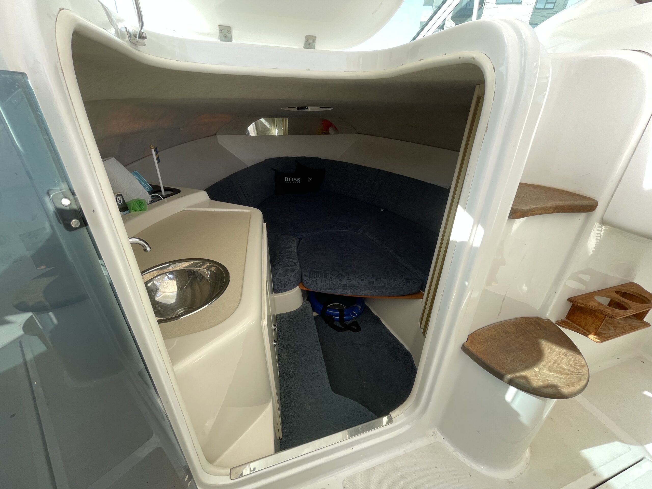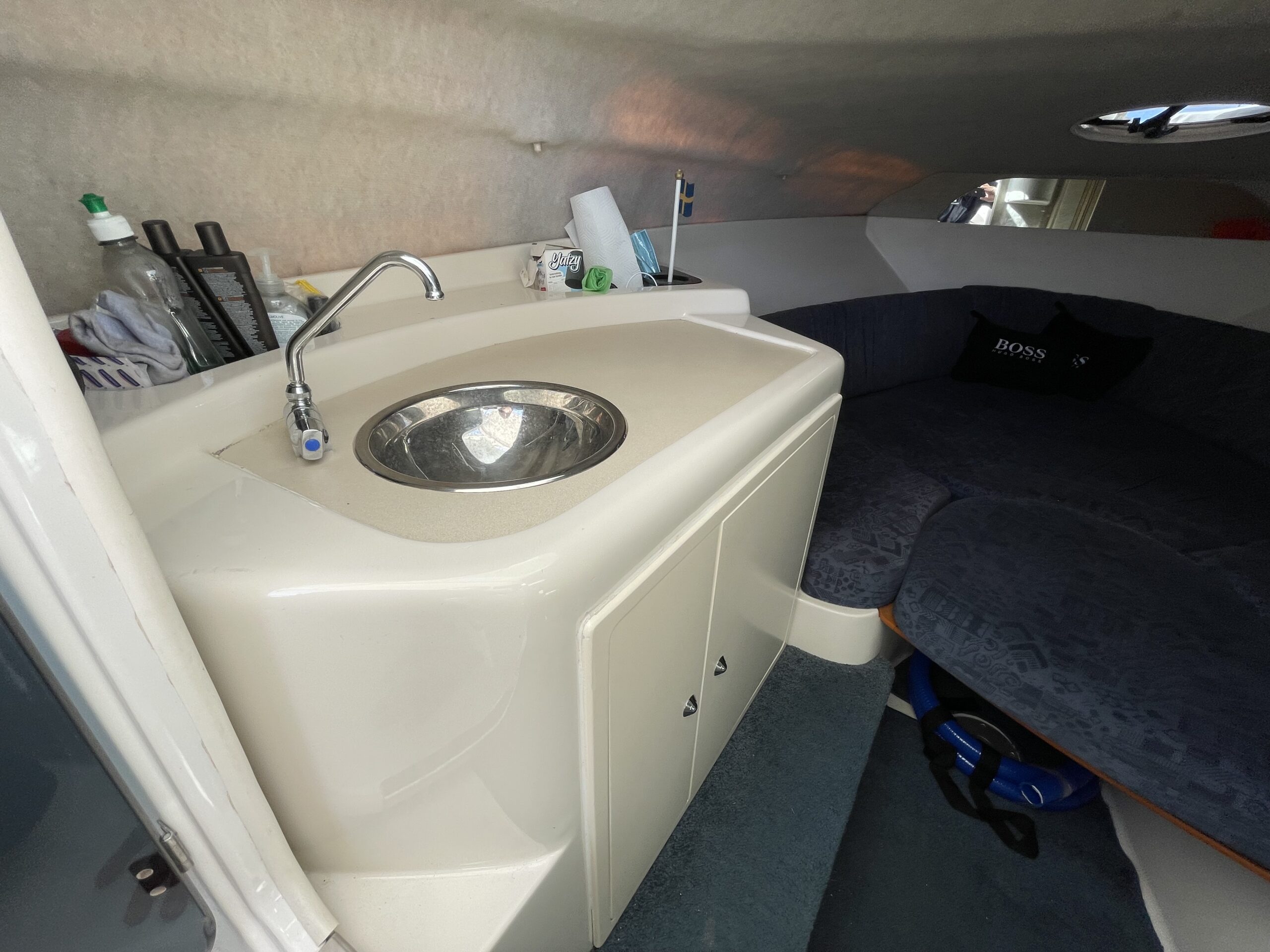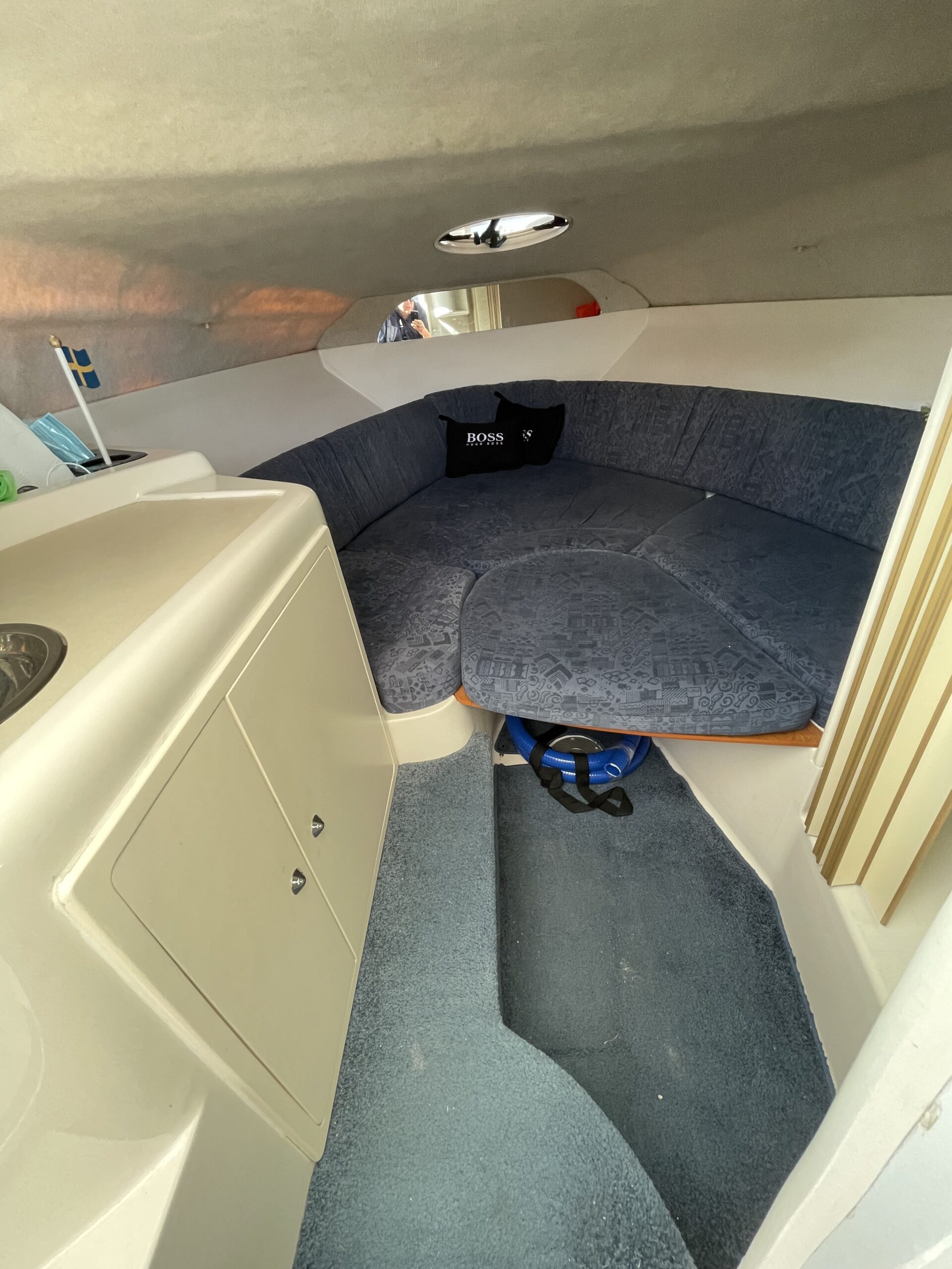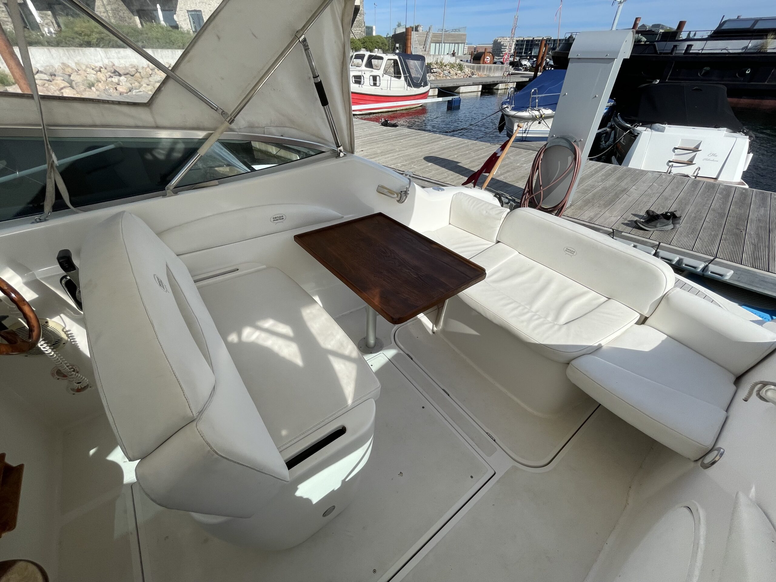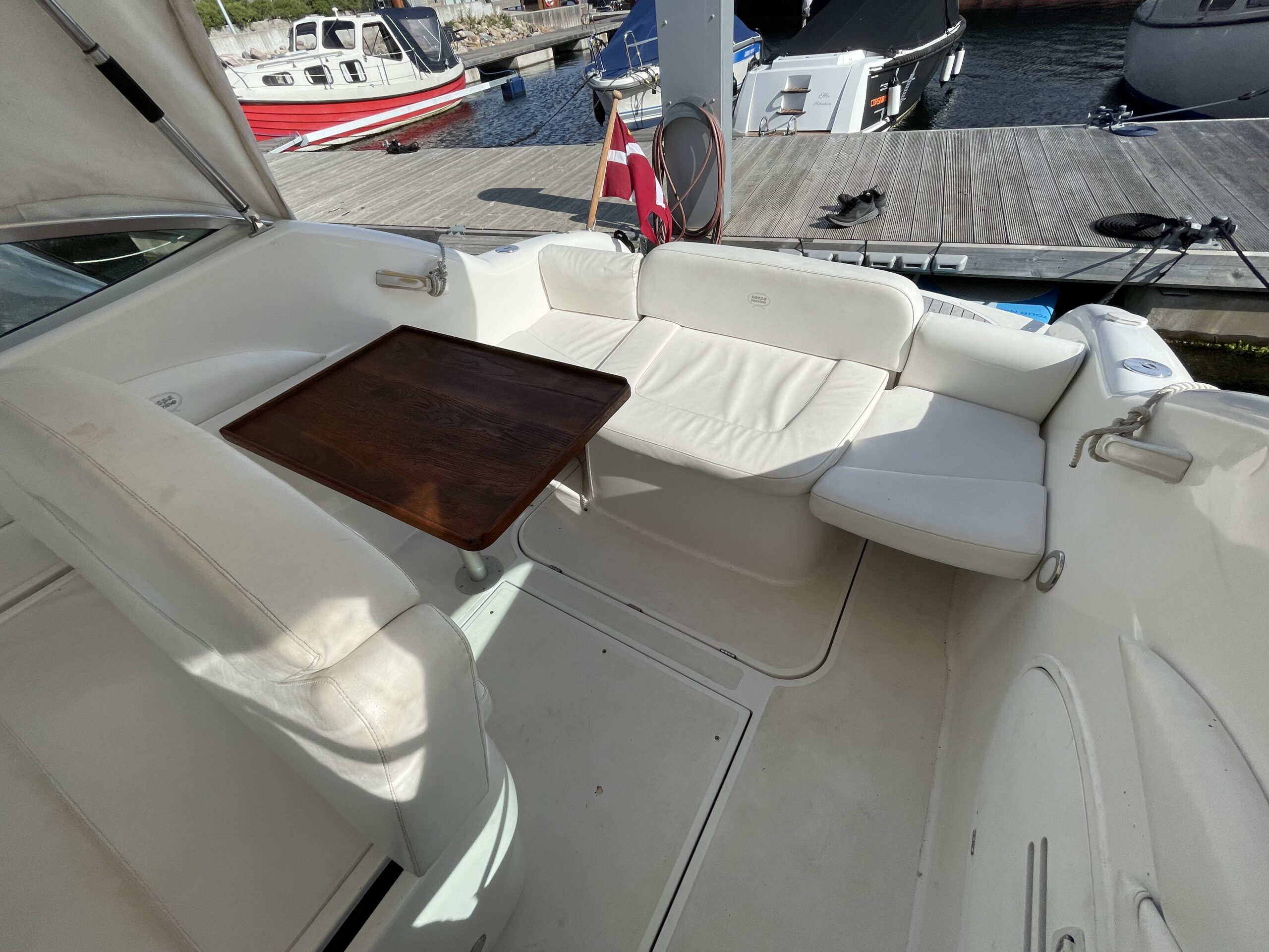 Rummeligt cockpit med bord løsning og gode siddepladser, dobbelt førerplads, på fronten soldæk, nedgang til kahyt med lille køkken, håndvask med koldvand og skabsplads, toilet og rigtig god størrelse soveplads til to voksne