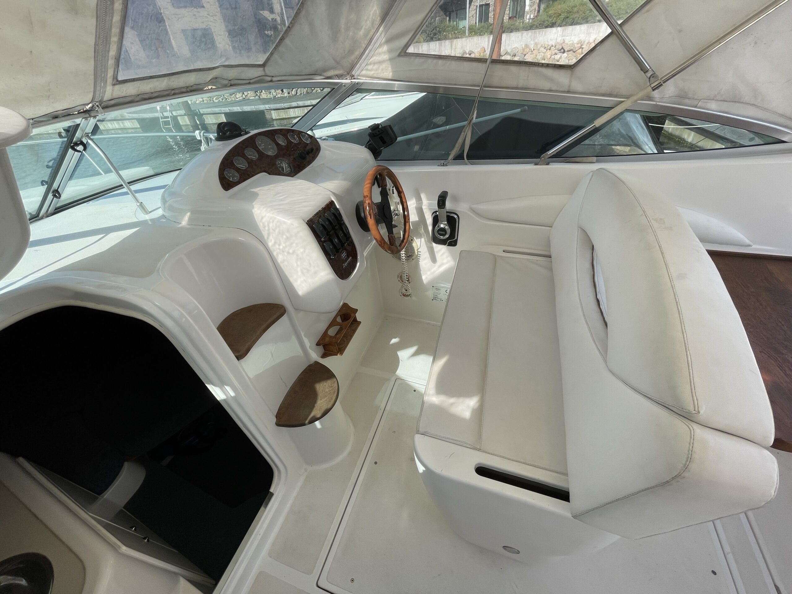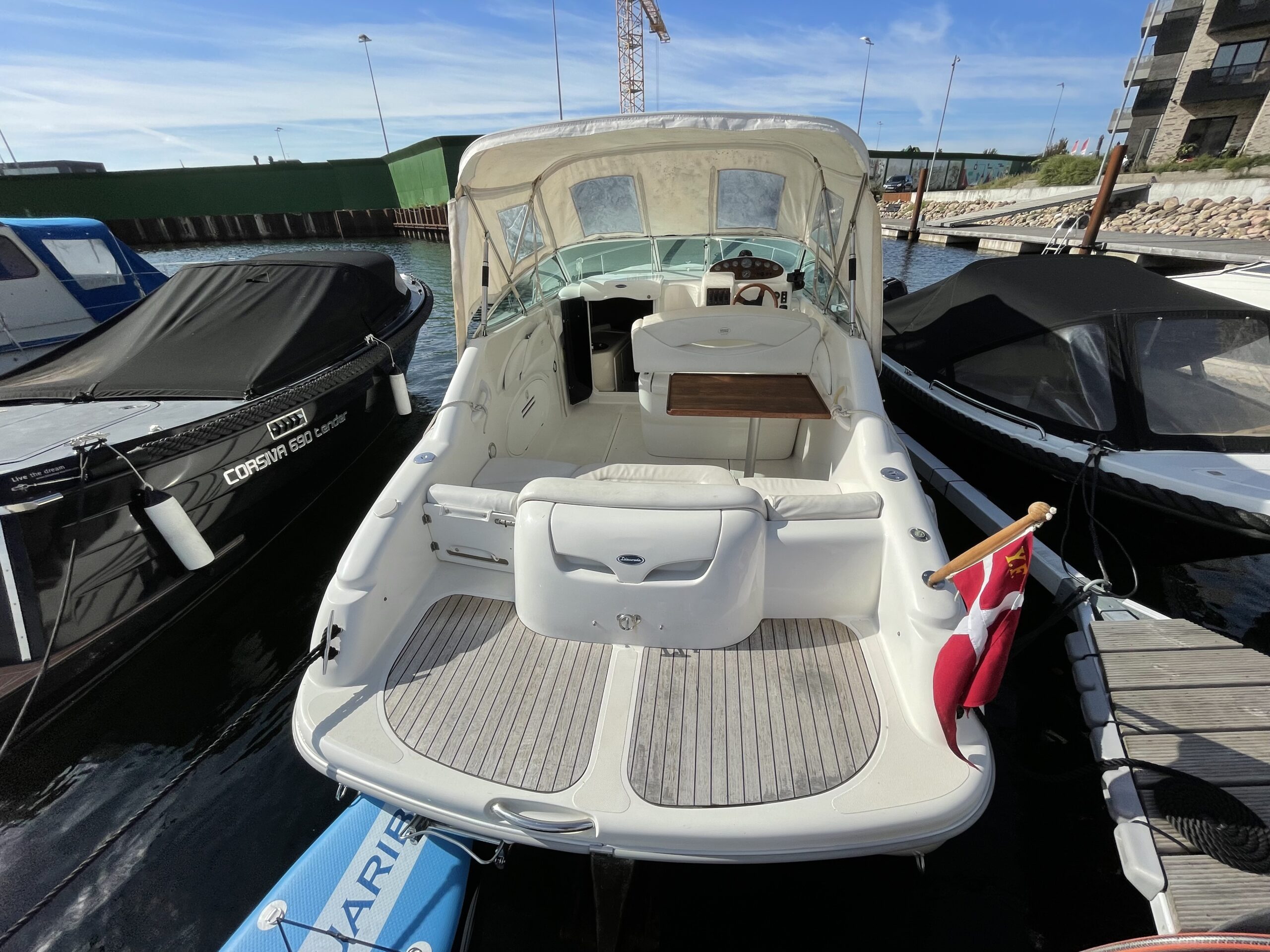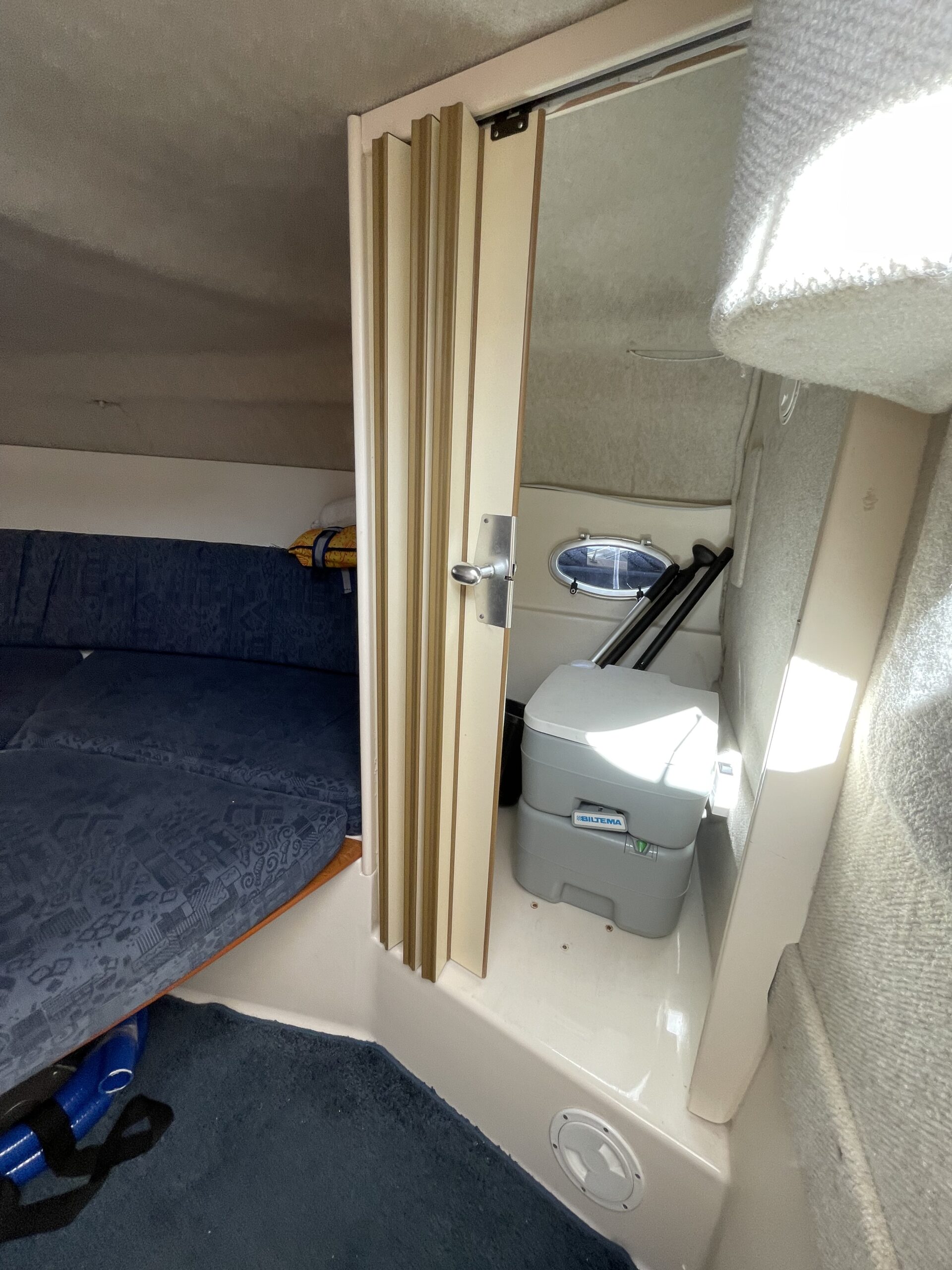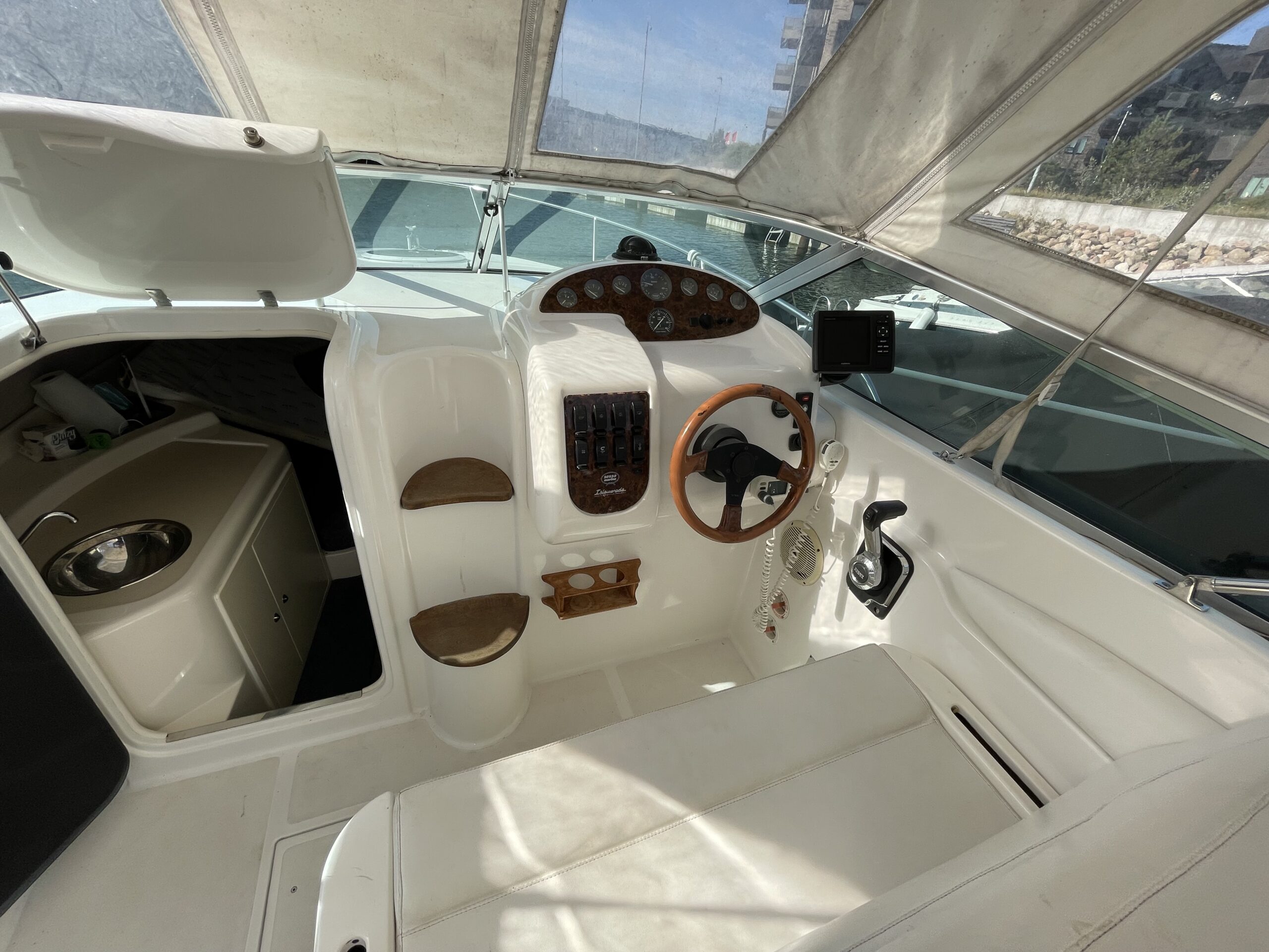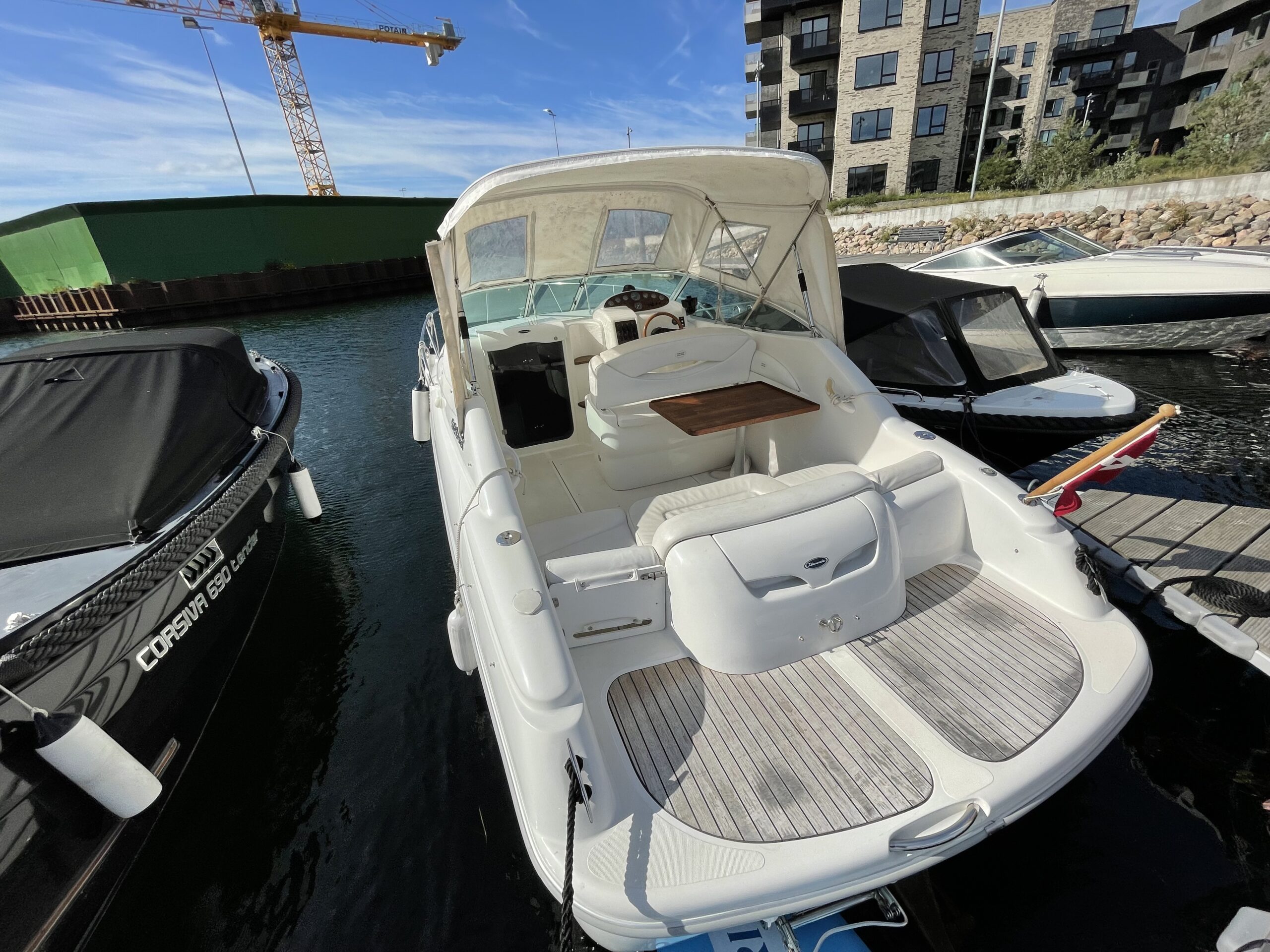 Rummeligt cockpit med bord løsning og gode siddepladser, dobbelt førerplads, på fronten soldæk, nedgang til kahyt med lille køkken, håndvask med koldvand og skabsplads, toilet og rigtig god størrelse soveplads til to voksne