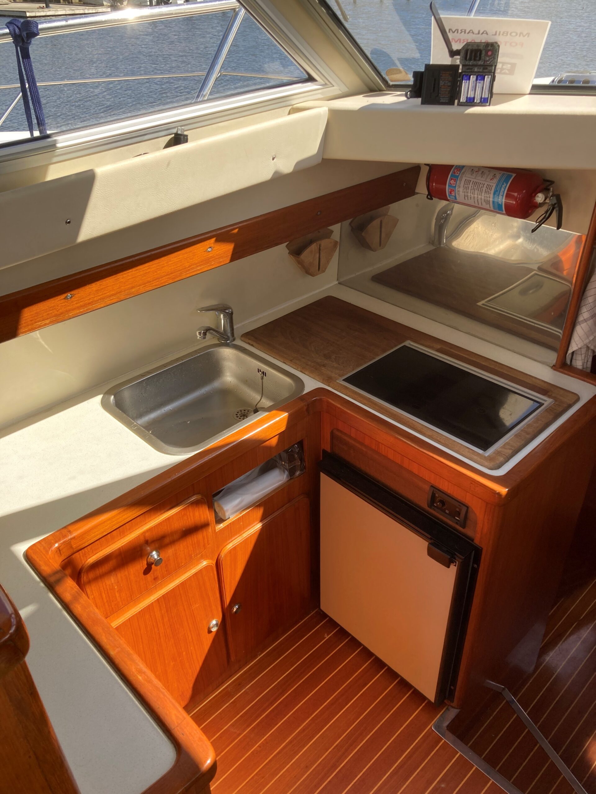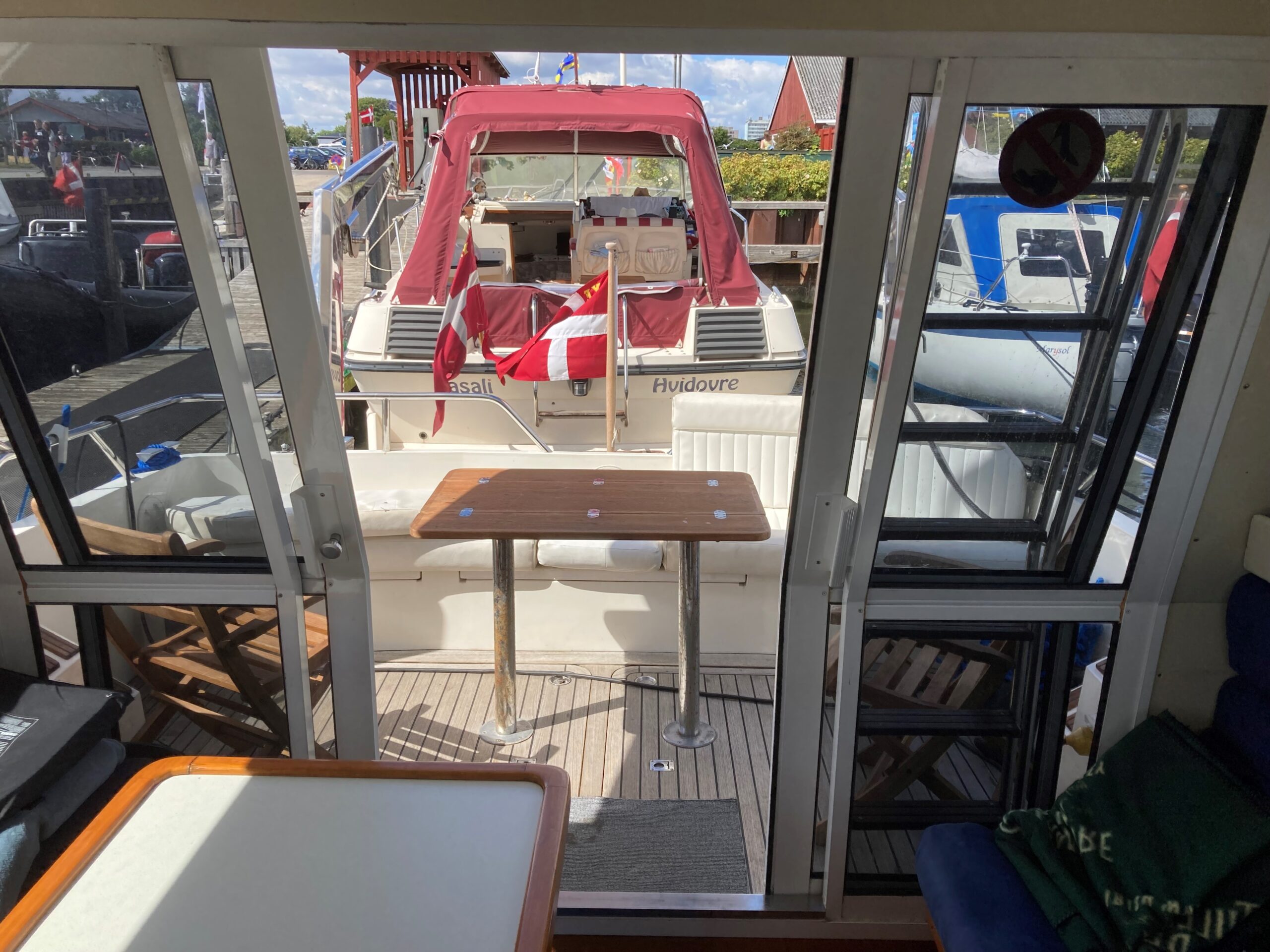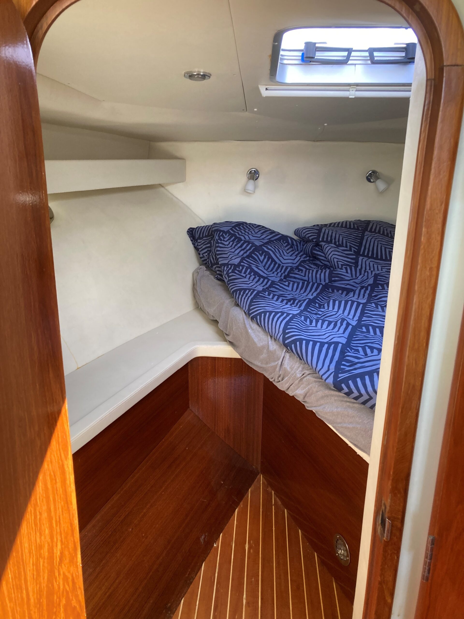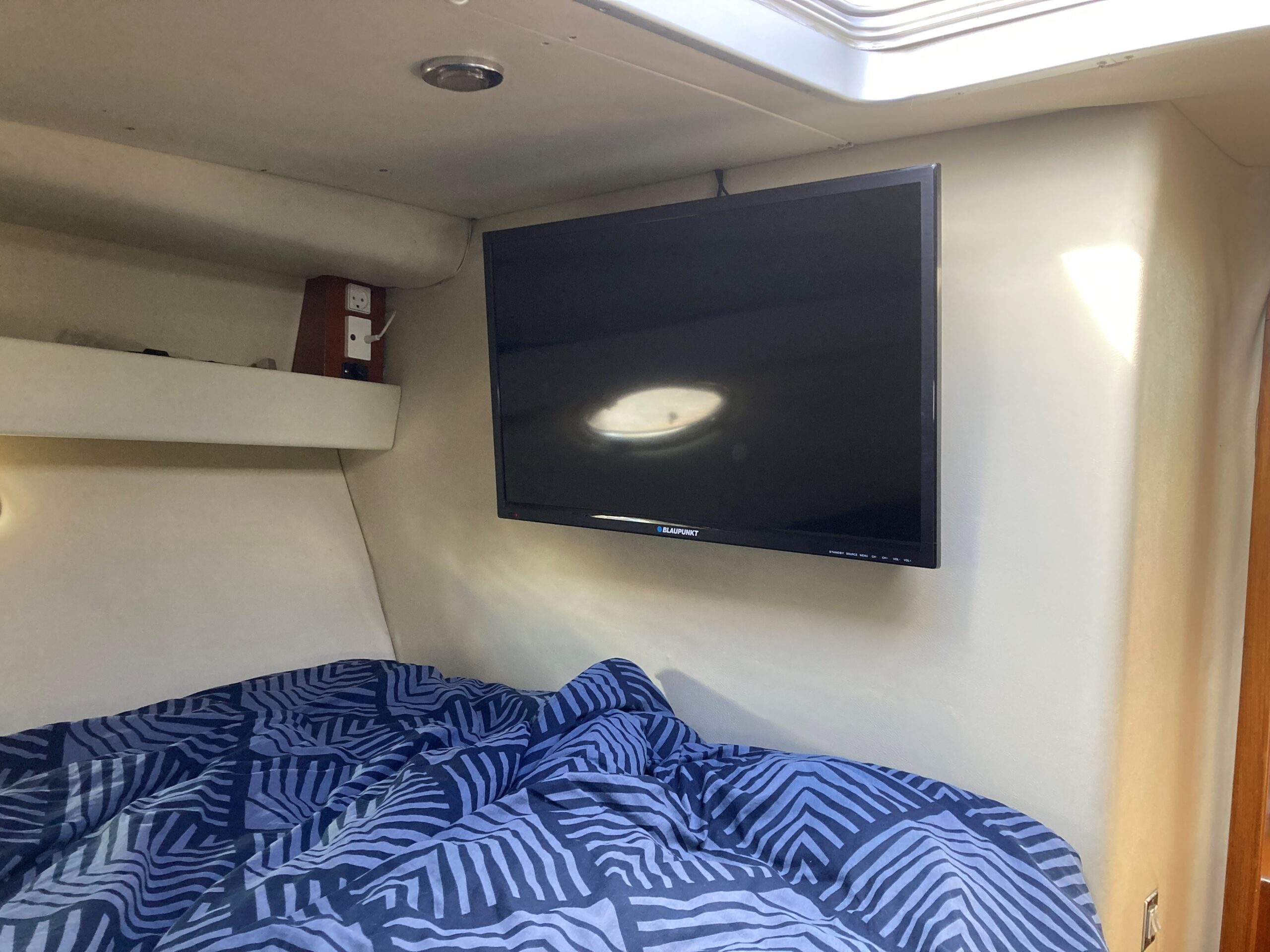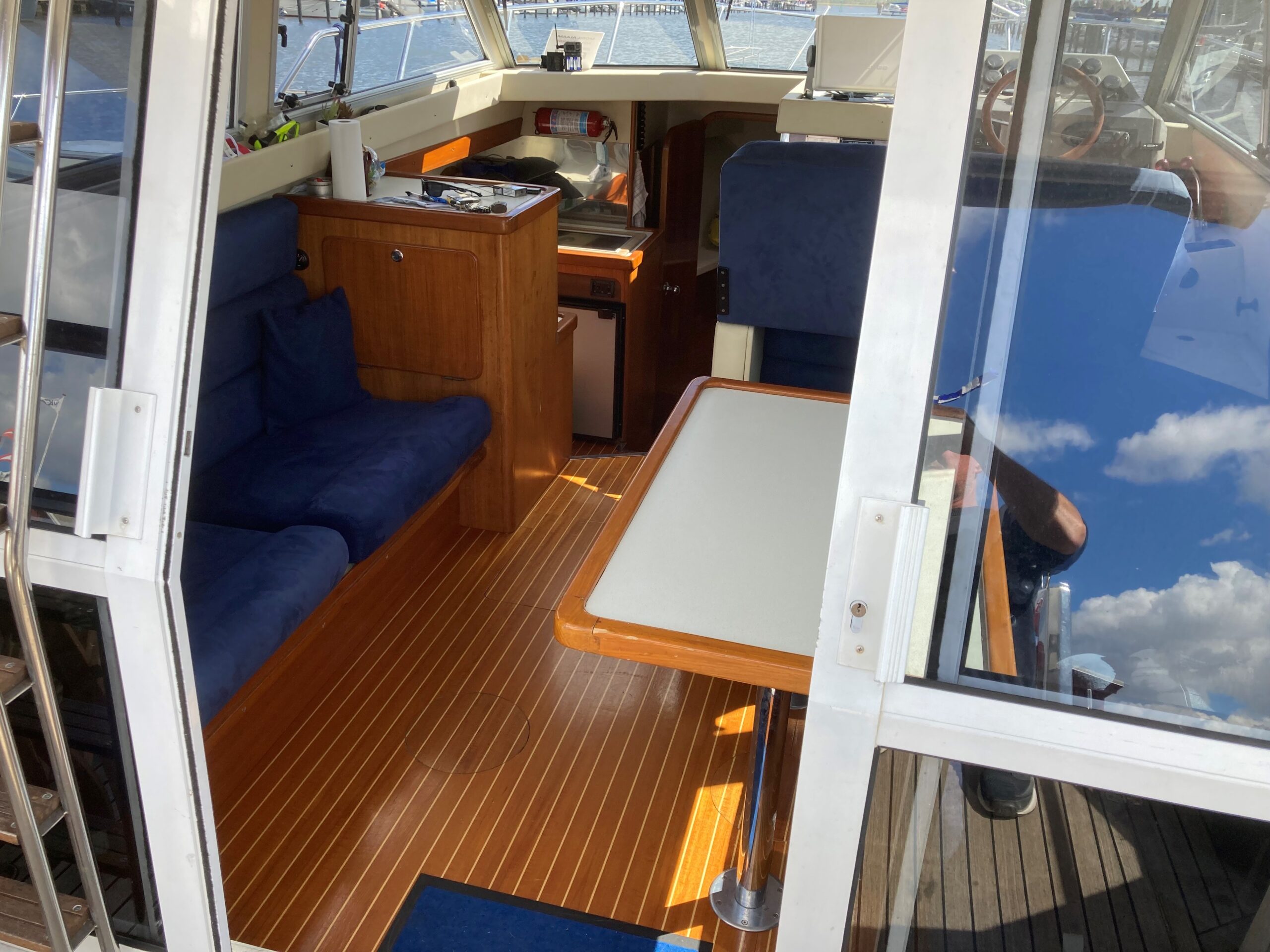 Via skydedør fra agterdæk adgang til lys og flot velindrettet salon med sofagruppe med bordløsning som kan omgøres til stor dobbeltkøje. Styreplads med godt udsyn og overblik. nedgang til pantrysektion med køle/fryseskab. kogeplade, microovn og masser af skabsplads. Midt cabin, stor dobbeltkøje. ved siden af, Toliet rum med elektrisk toilet. Fremme endnu en dobbelt køje med Tv.