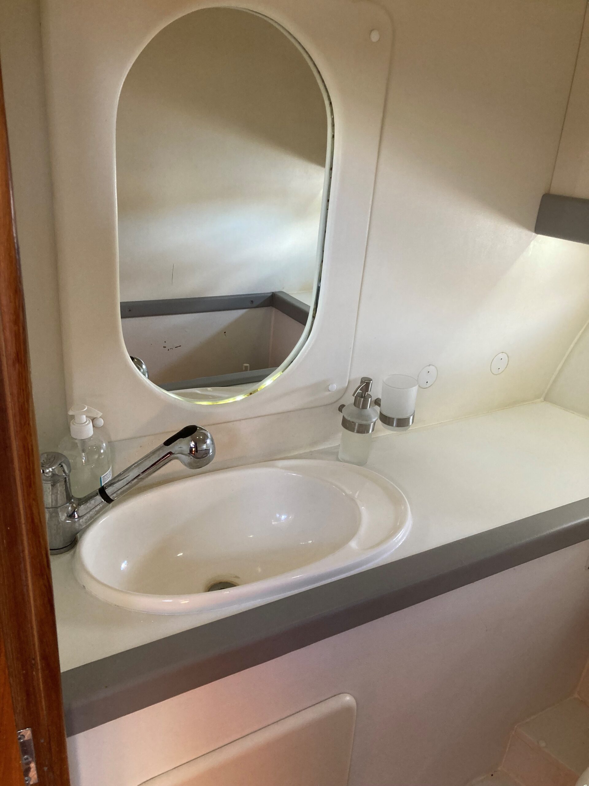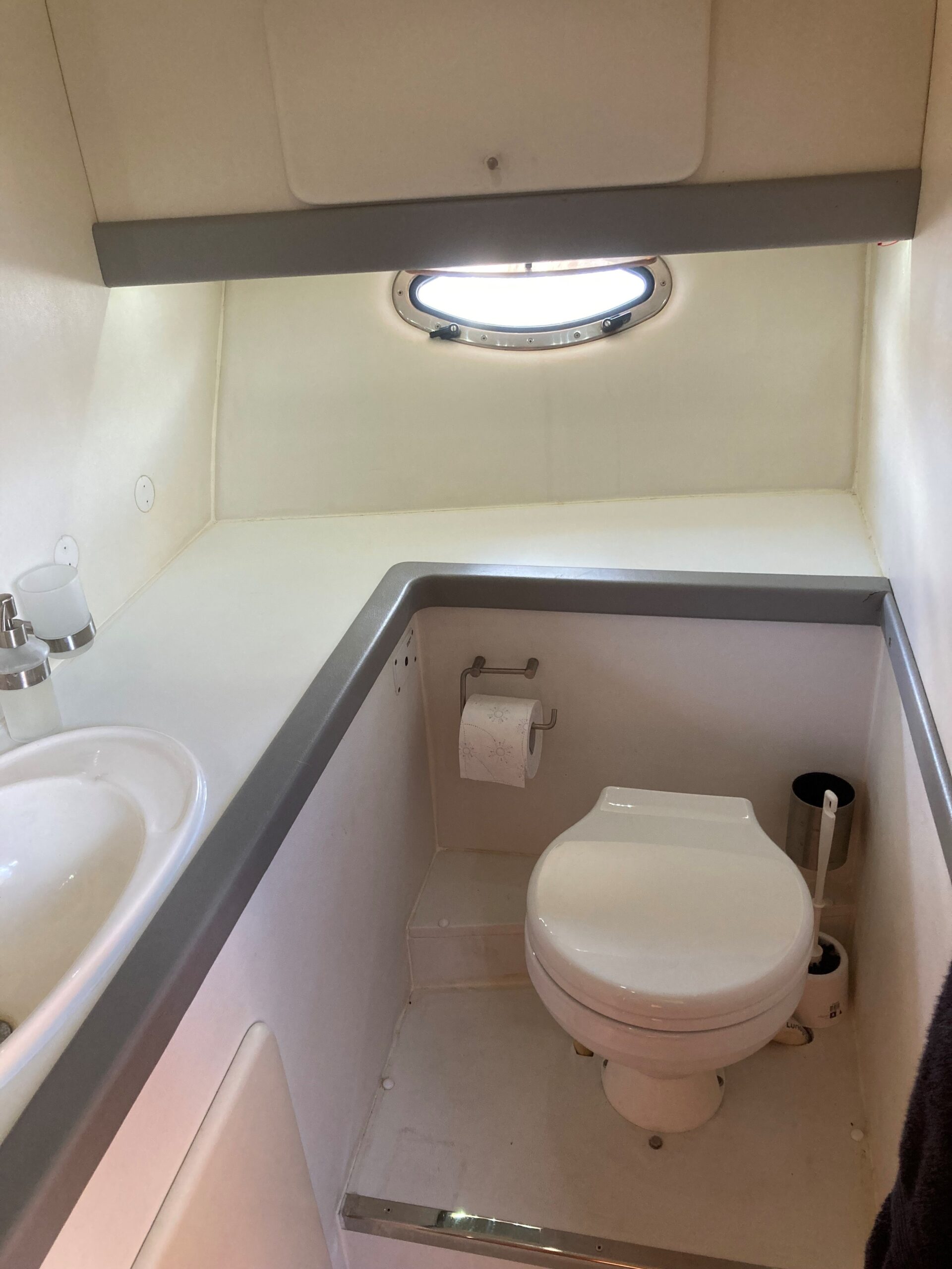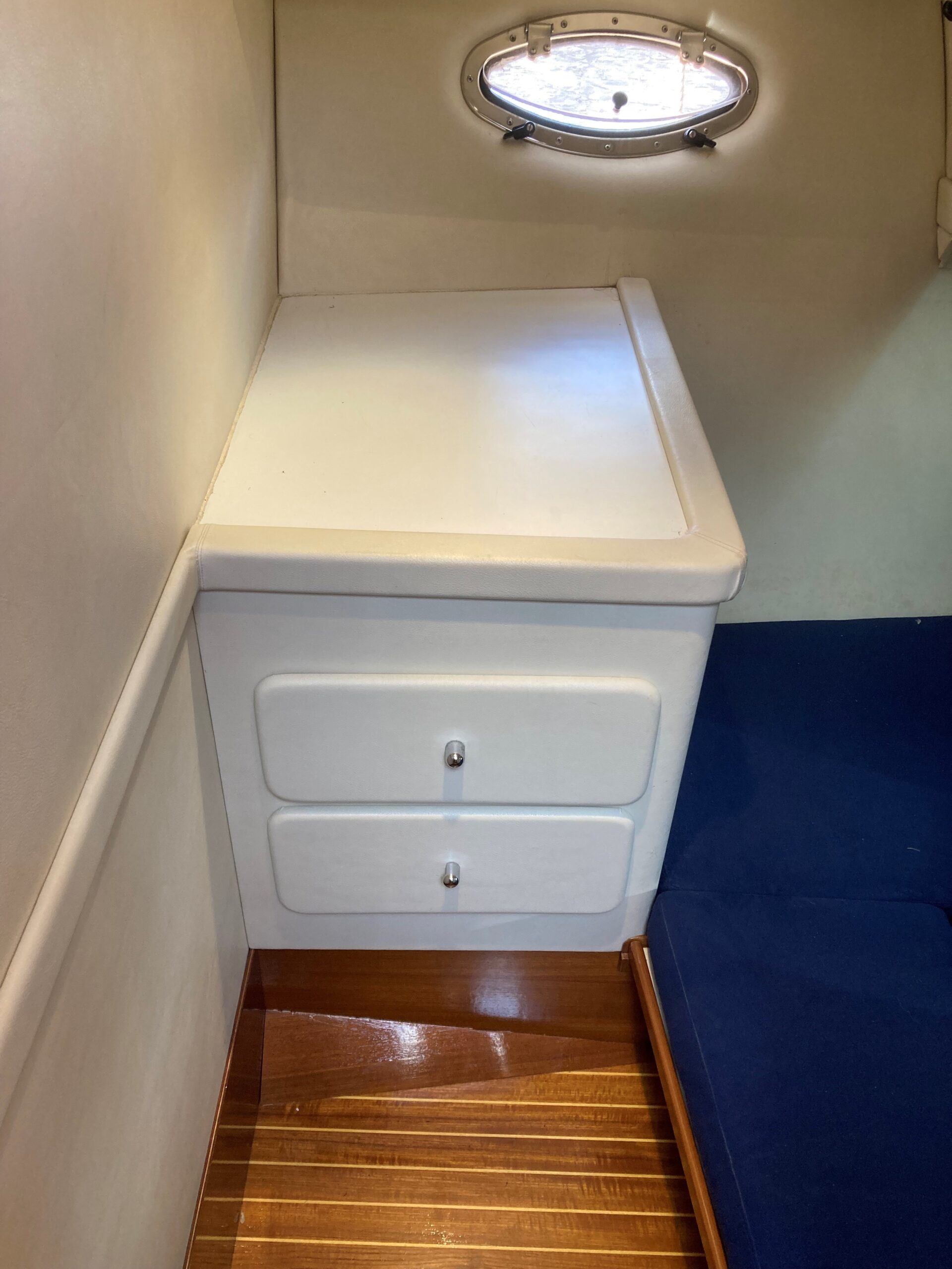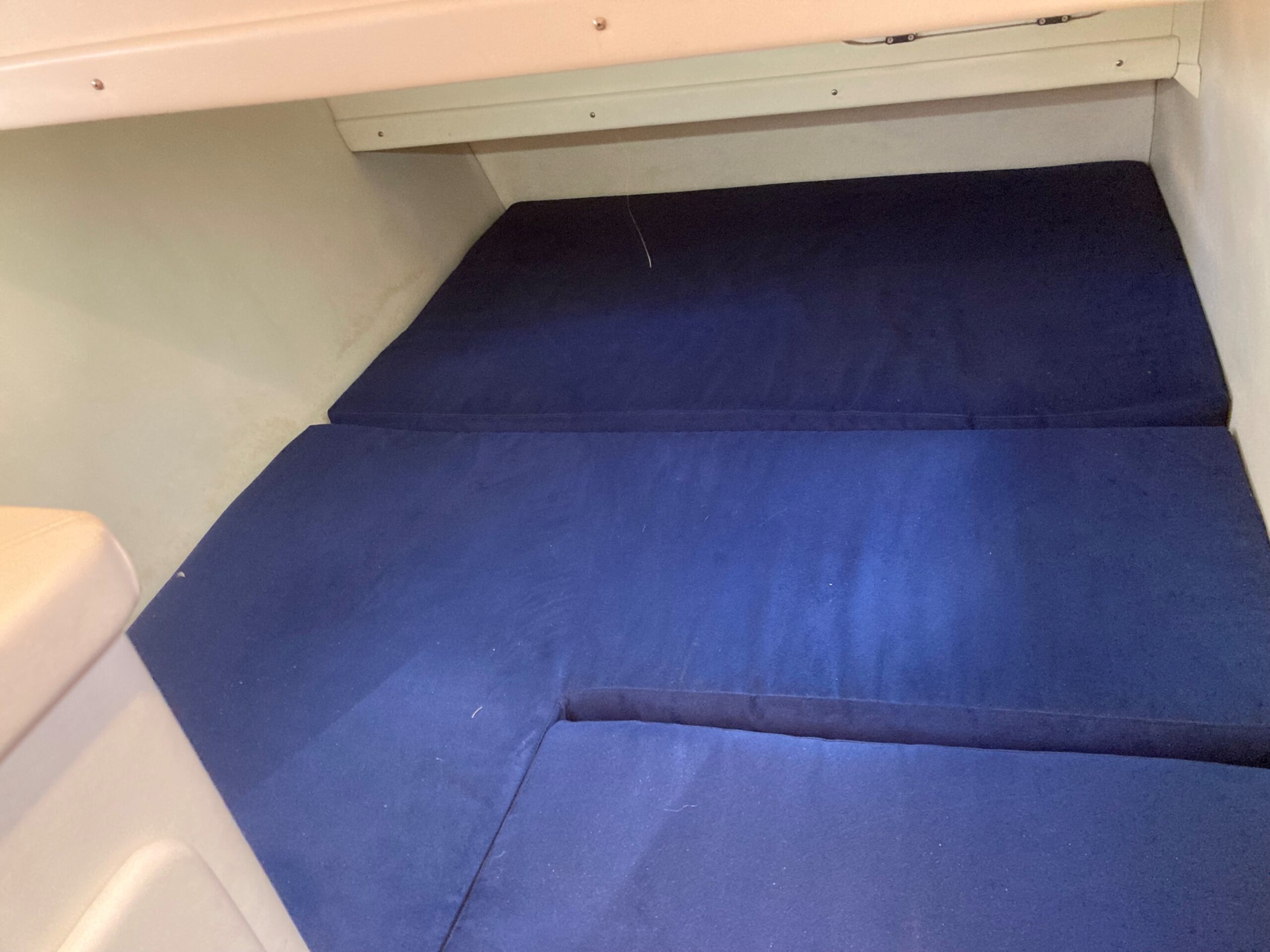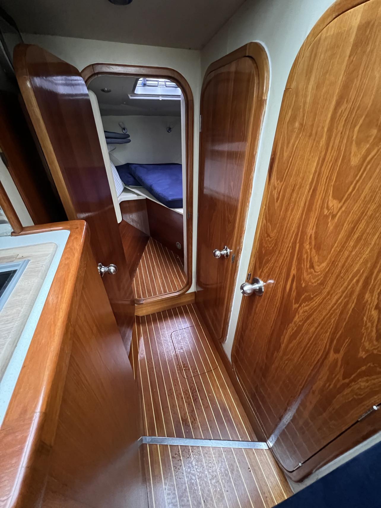 Via skydedør fra agterdæk adgang til lys og flot velindrettet salon med sofagruppe med bordløsning som kan omgøres til stor dobbeltkøje. Styreplads med godt udsyn og overblik. nedgang til pantrysektion med køle/fryseskab. kogeplade, microovn og masser af skabsplads. Midt cabin, stor dobbeltkøje. ved siden af, Toliet rum med elektrisk toilet. Fremme endnu en dobbelt køje med Tv.