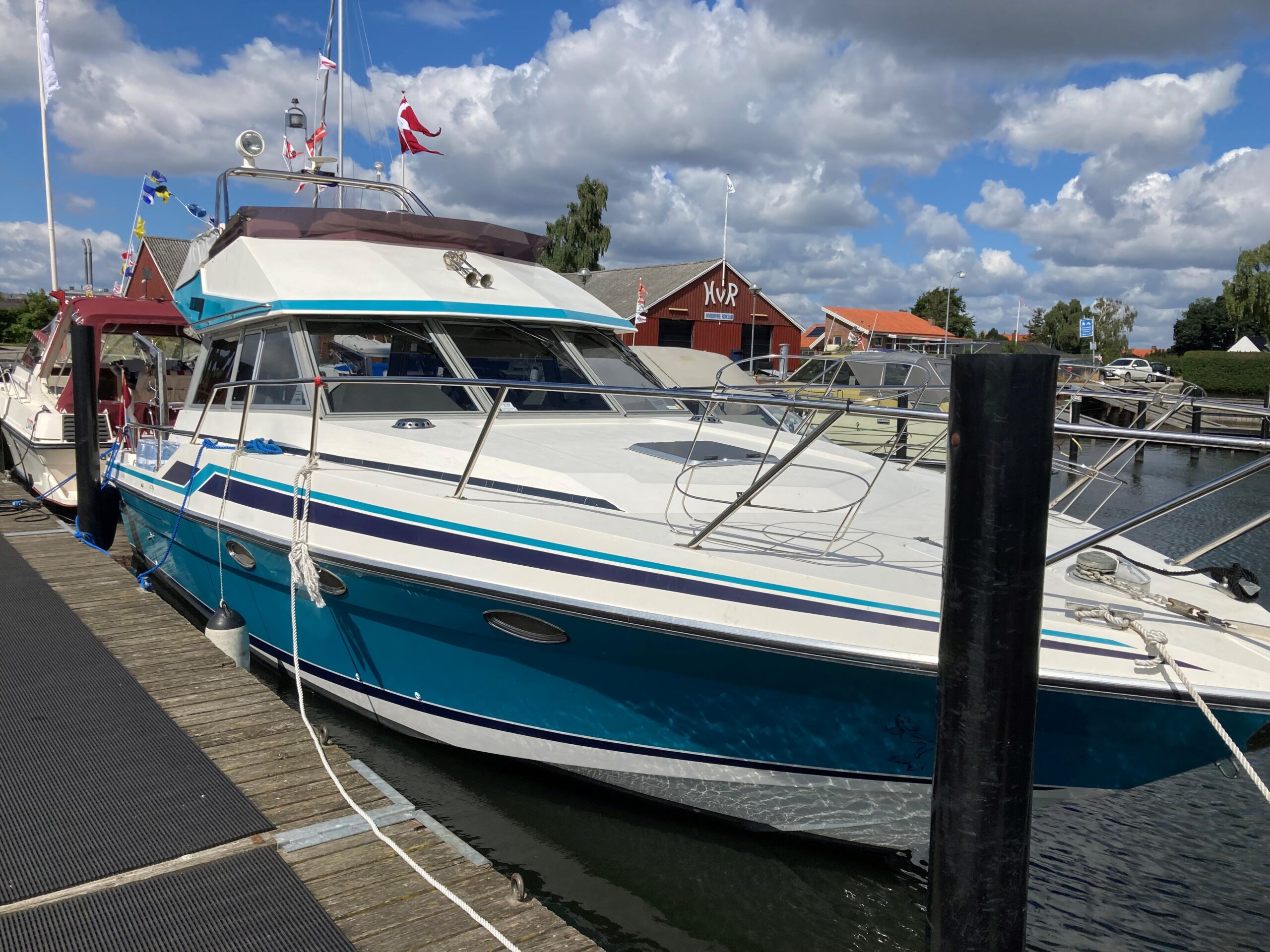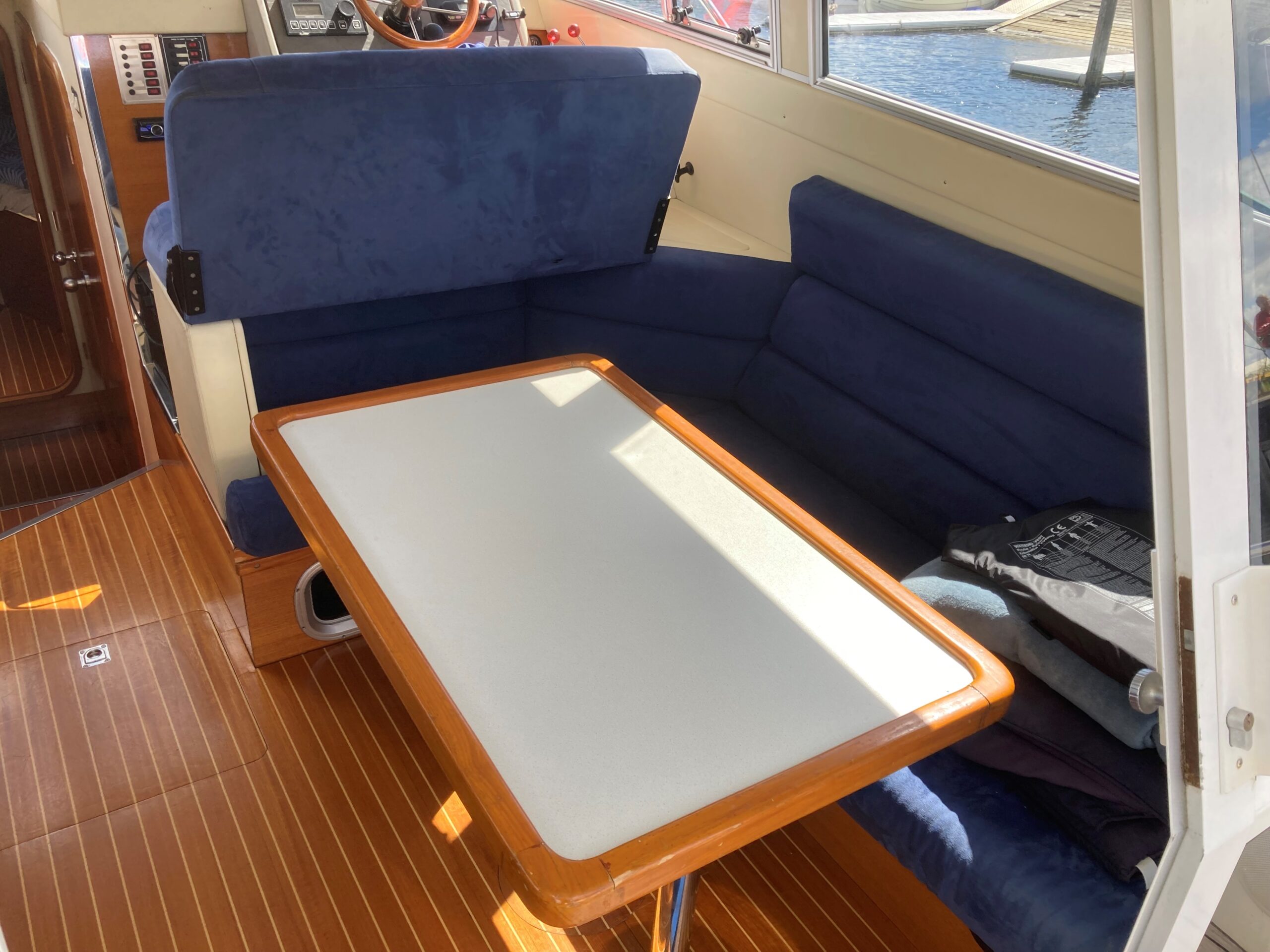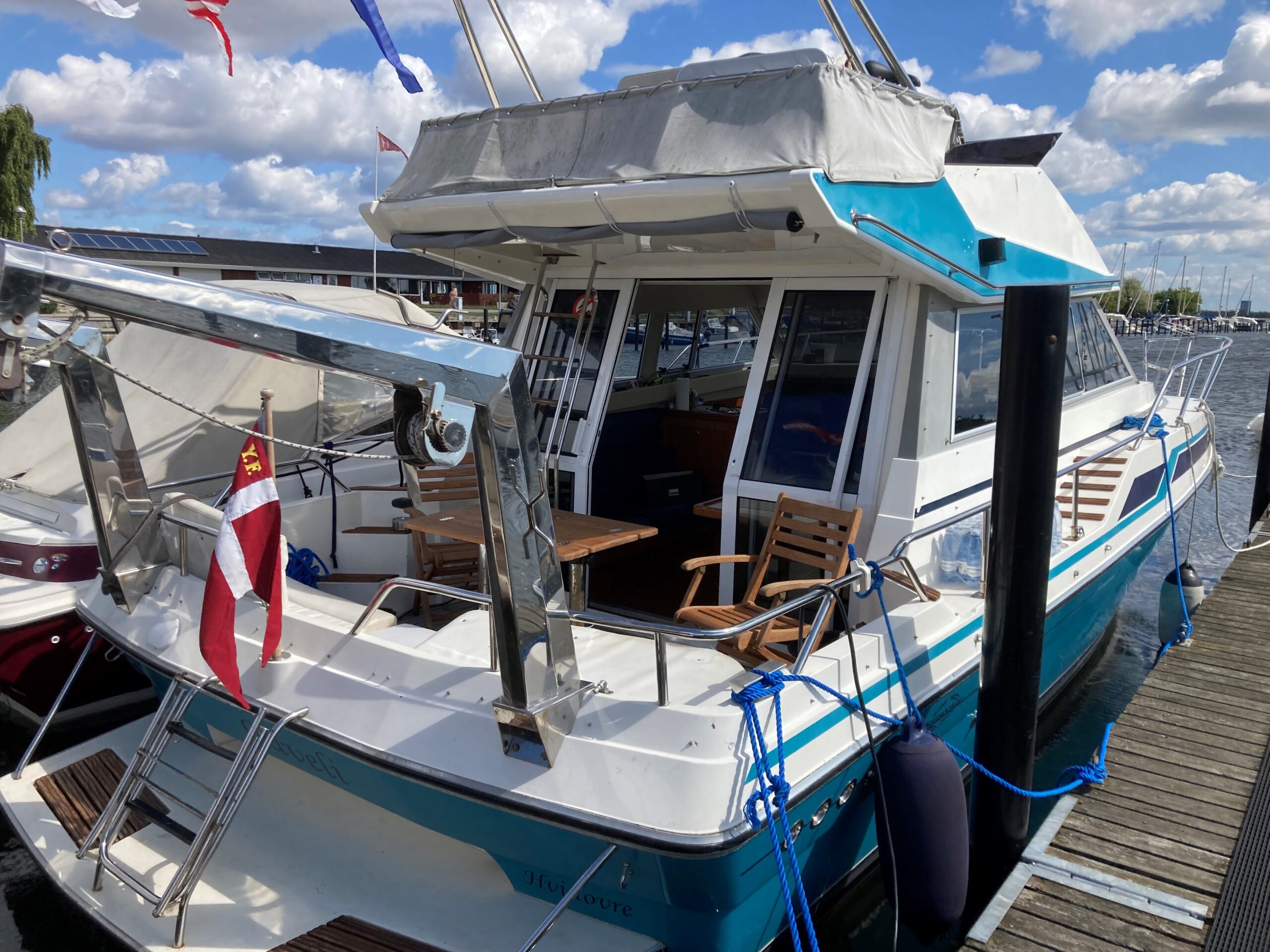 Velbygget rummelig og med masser af plads og komfort. Stort agterdæk med plads til bord og stole arrangement. Cover over Agterdæk sikre god udnyttelse også i dårligt vejr. Adgang via stige til flybridge med styreplads med siddeplads til 4 personer.