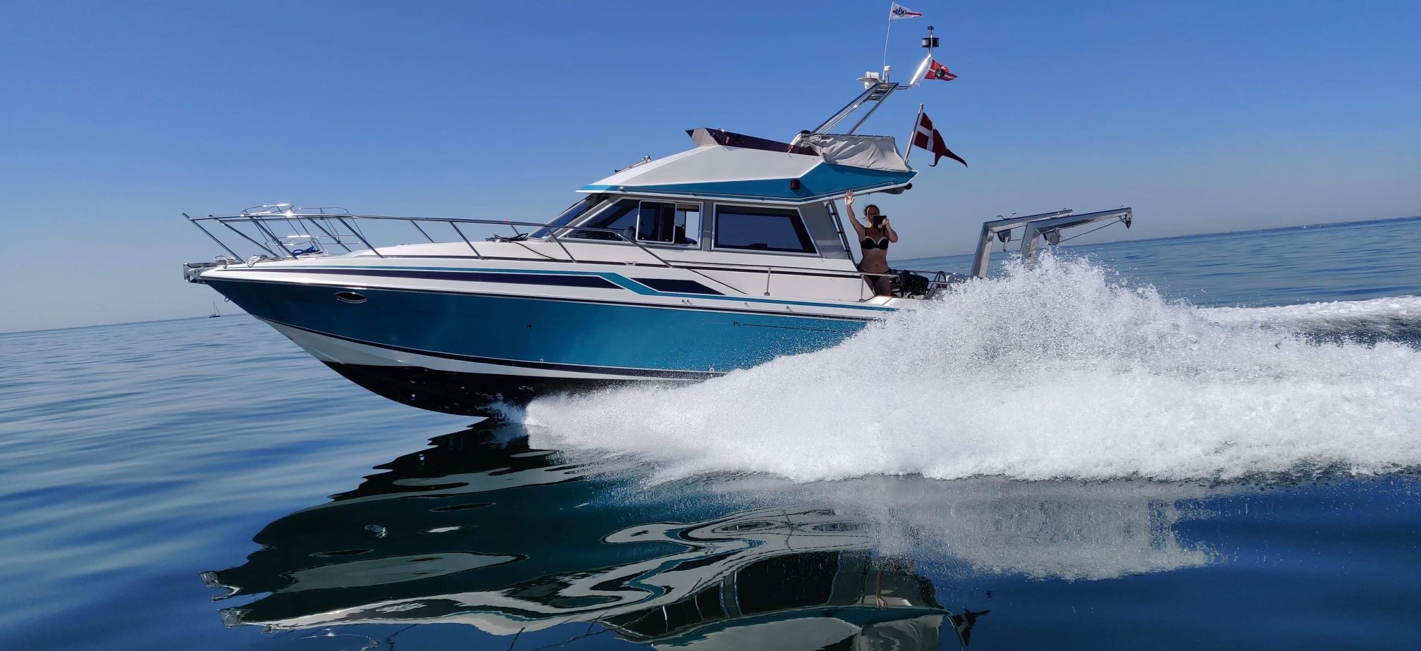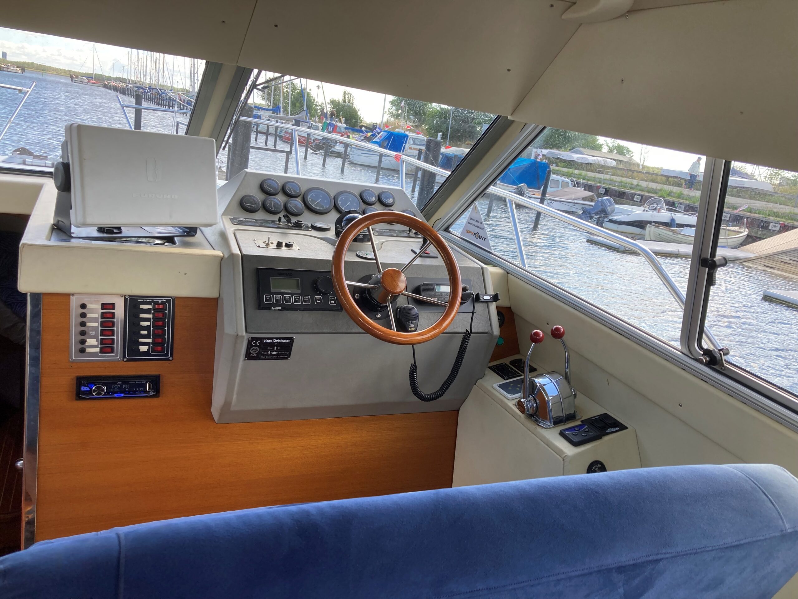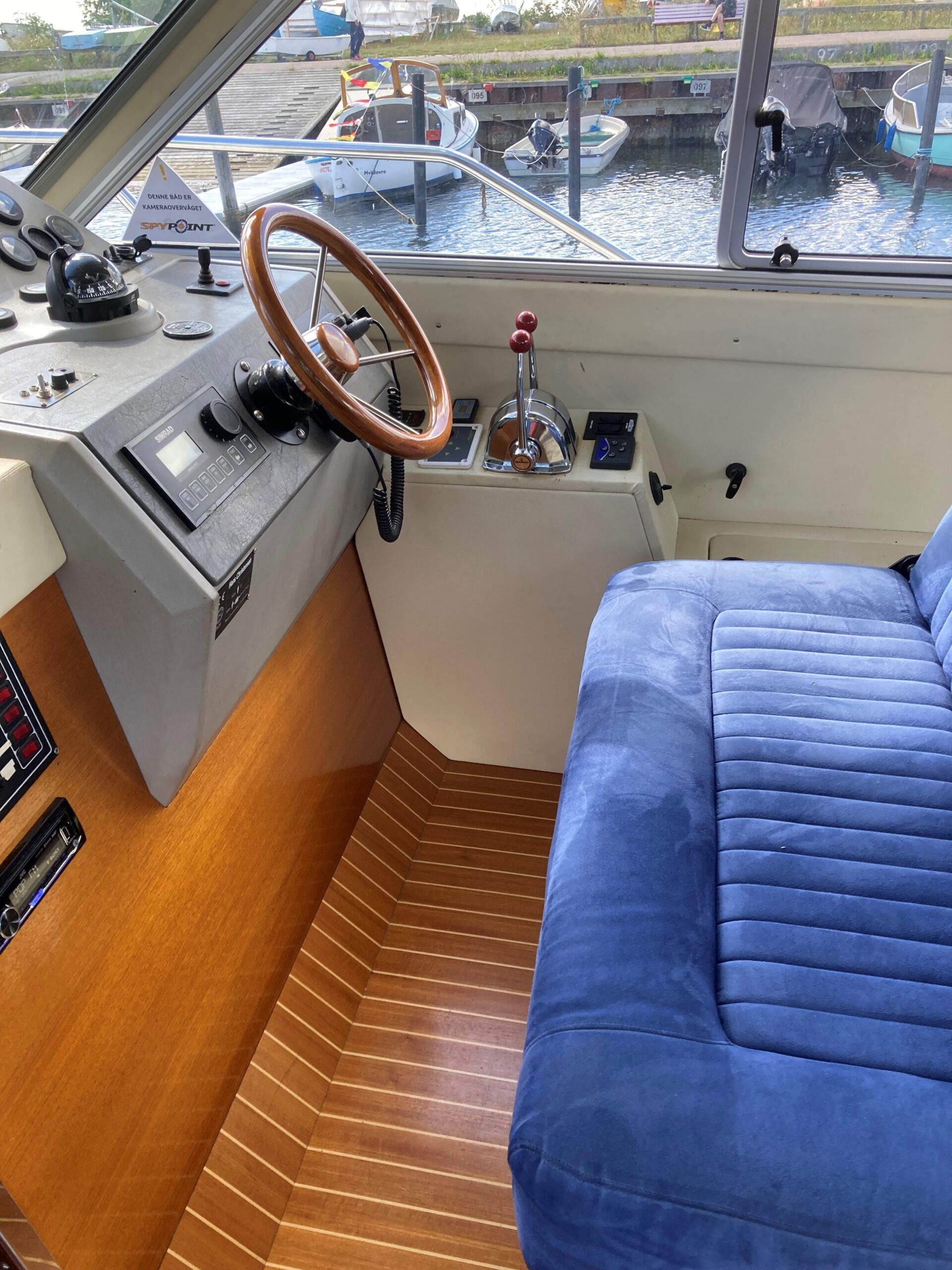 Velbygget rummelig og med masser af plads og komfort. Stort agterdæk med plads til bord og stole arrangement. Cover over Agterdæk sikre god udnyttelse også i dårligt vejr. Adgang via stige til flybridge med styreplads med siddeplads til 4 personer.