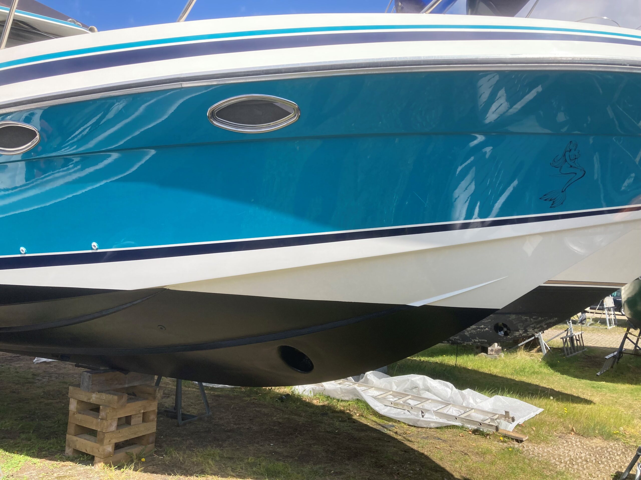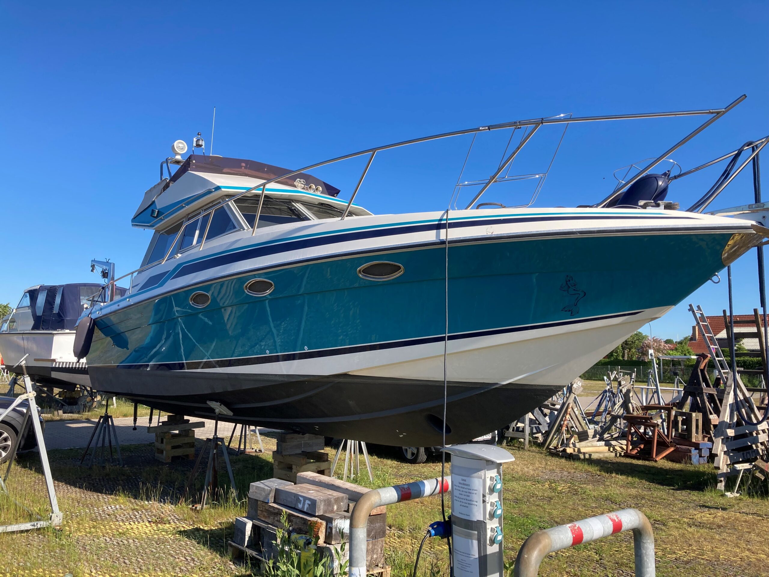 To fine Mercruiser Diesel maskiner giver fin fart og er økonomiske. Hele båden står flot og velholdt. i 2022 blev alt bundmaling skrabet, og der blev lagt ny primer og bundmaling. begge drev er Total renoveret i 2023.
