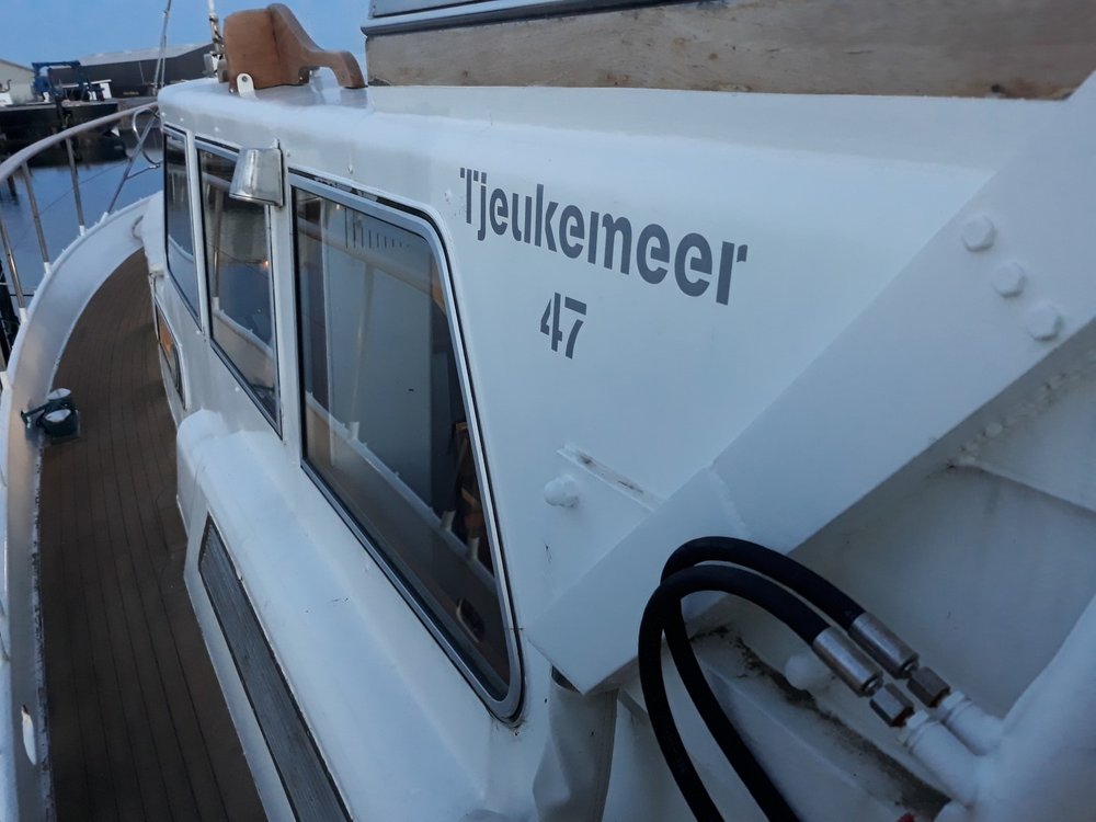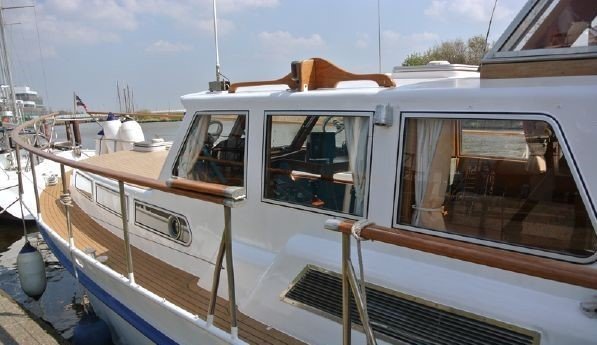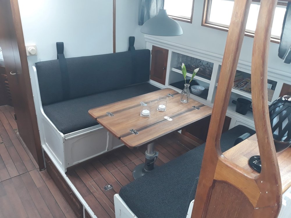 Stålbåd fra Tjeukemeer værftet i Holland med masser af plads og 6 Sovepladser med nye 12cm. koldskumshynder betrukket med microfiber stof i elegant lys grå.