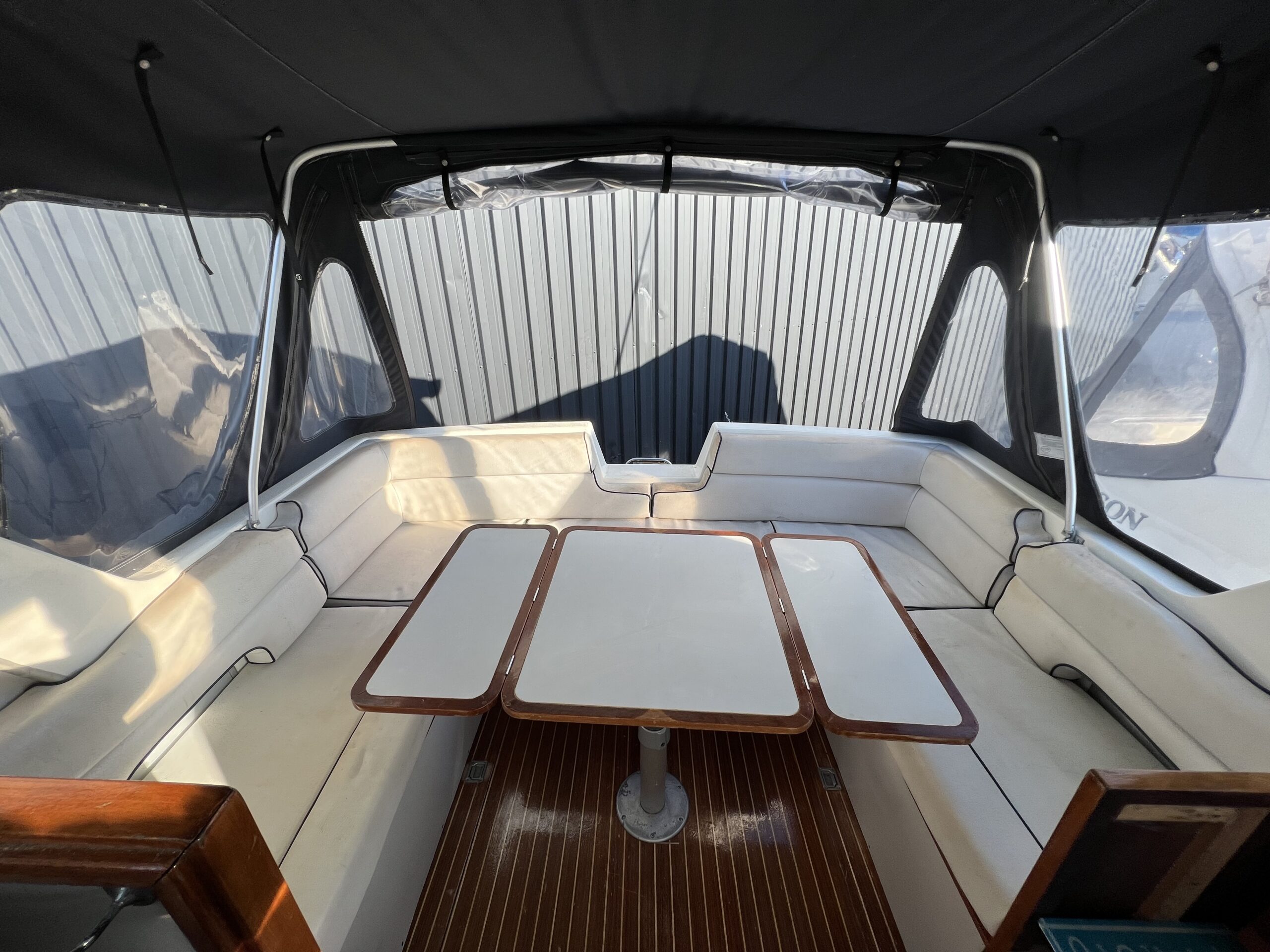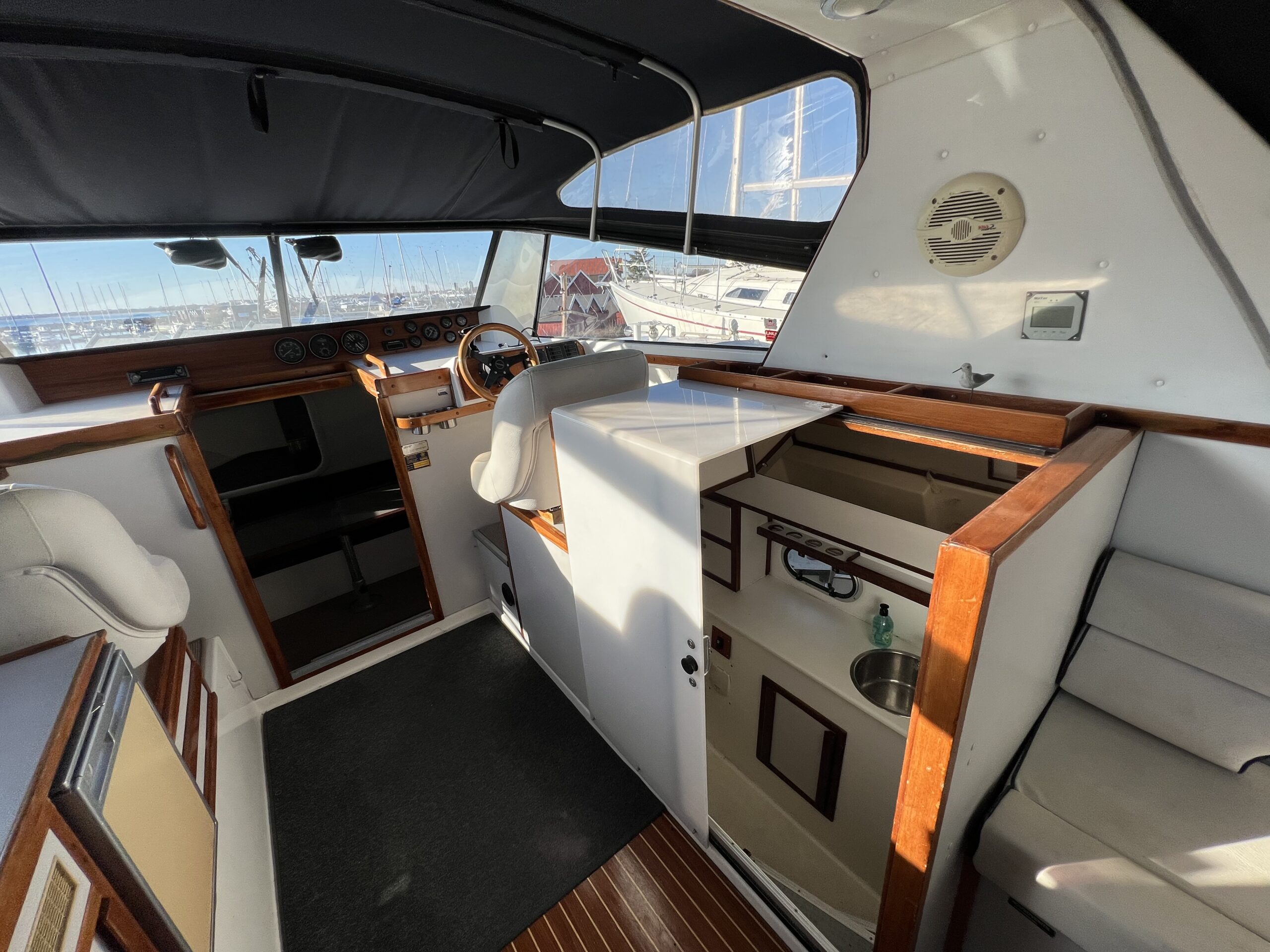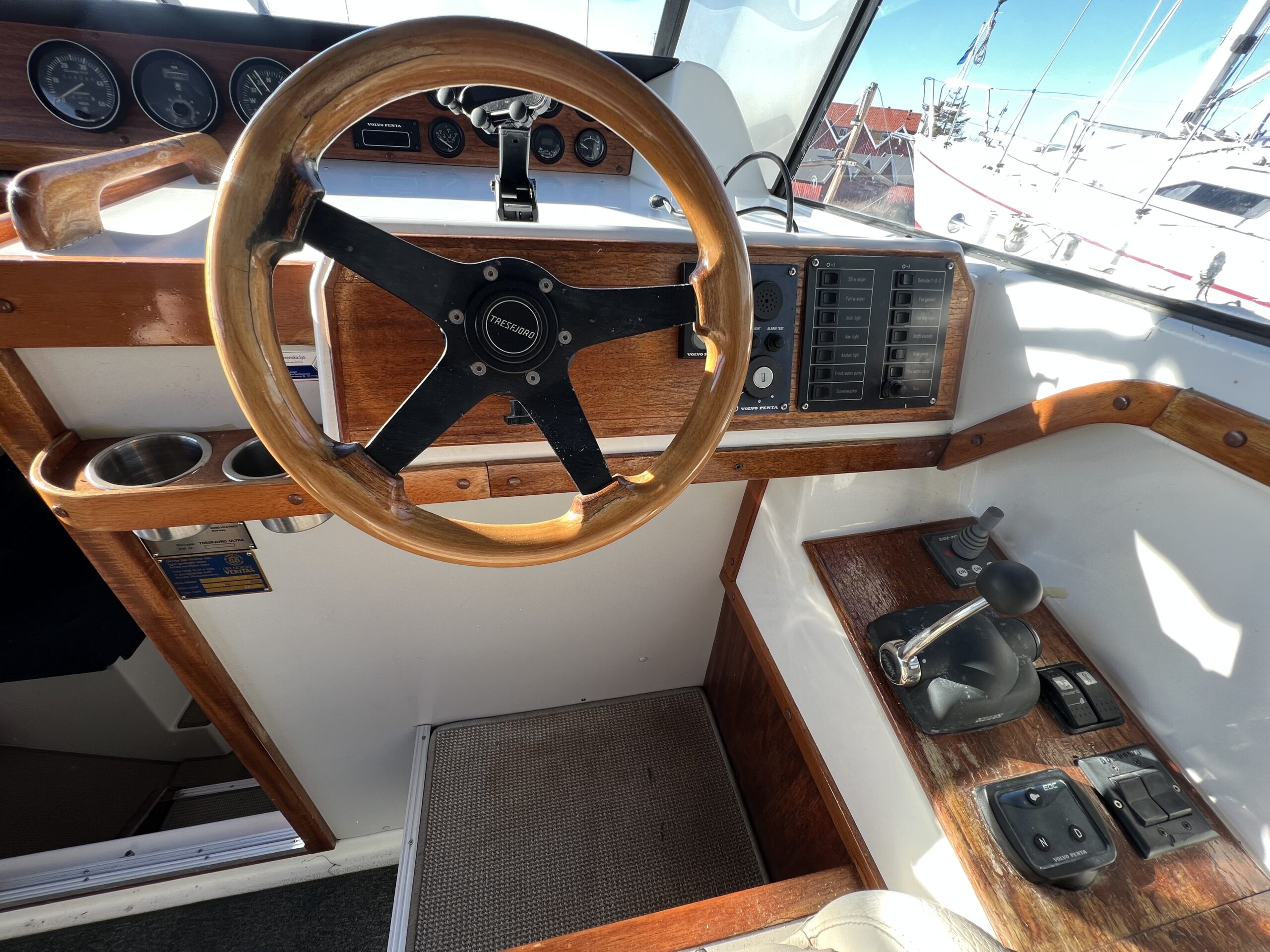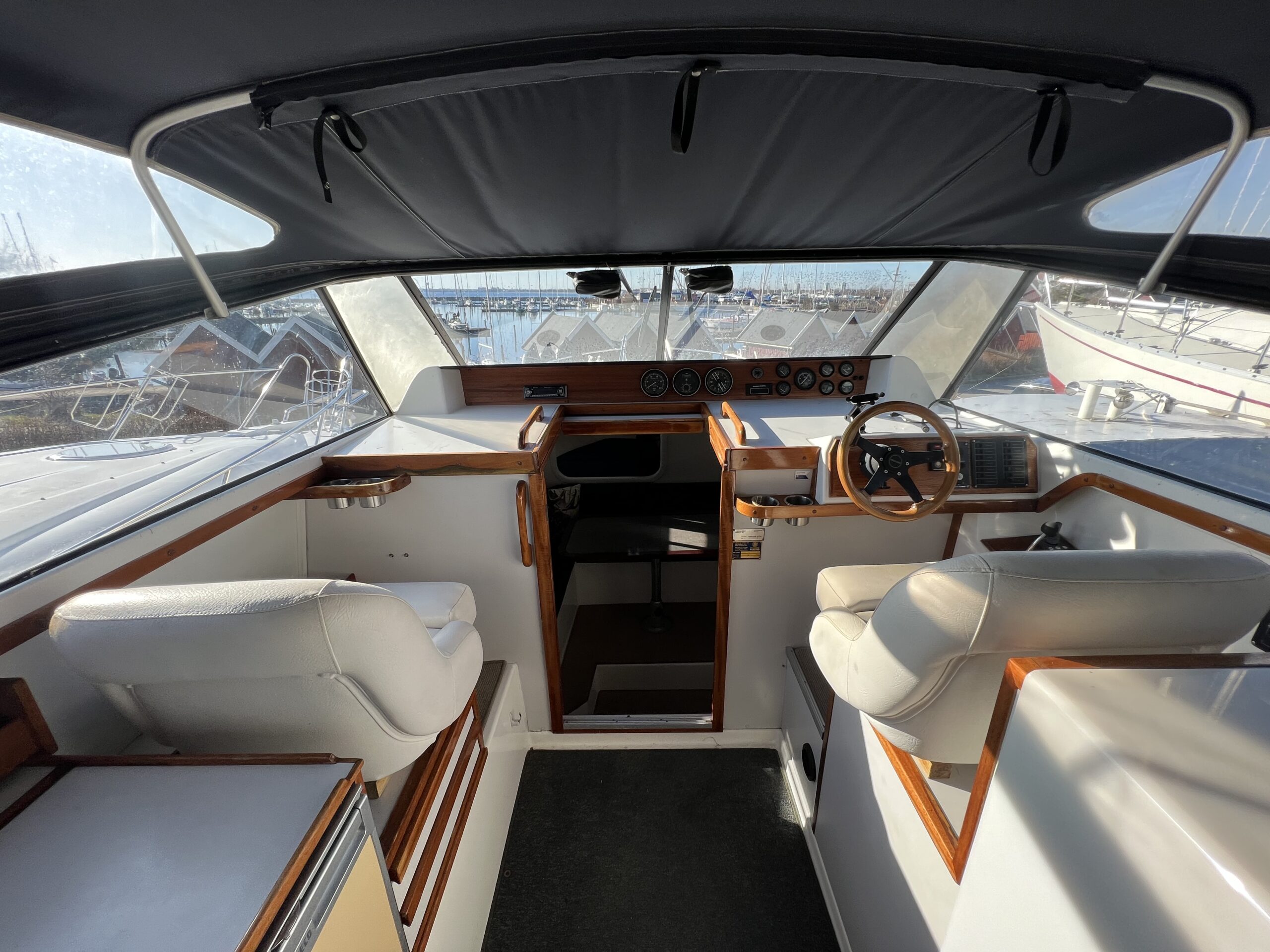 Skøn familie turbåd med nyere dieselmaskine som sikre god økonomi og alligevel med fart nok til at komme hjem til tiden. Cockpit med pantrysektion. førerplads og passagerstol, Stor siddegruppe med bord, Adgang til stort toilet rum fra cockpit, Fremme er kahyt med stor sofagruppe med bordløsning som kan omgøres til stor dobbeltkøje. Yderligere fin dobbelt soveplads midt under cockpit, og en mindre køje helt i front som kan lukkes af, det giver båden hele 8 rigtig fine sovepladser. Bådens stand er rimelig men med plads til kosmetiske forbedringer, bla. hynder i cockpit står snart til udskiftning. Kalechen har fået nye vinduer, Motoren er passet og plejet og sammen med Bovpropel er båden nem og sejle.