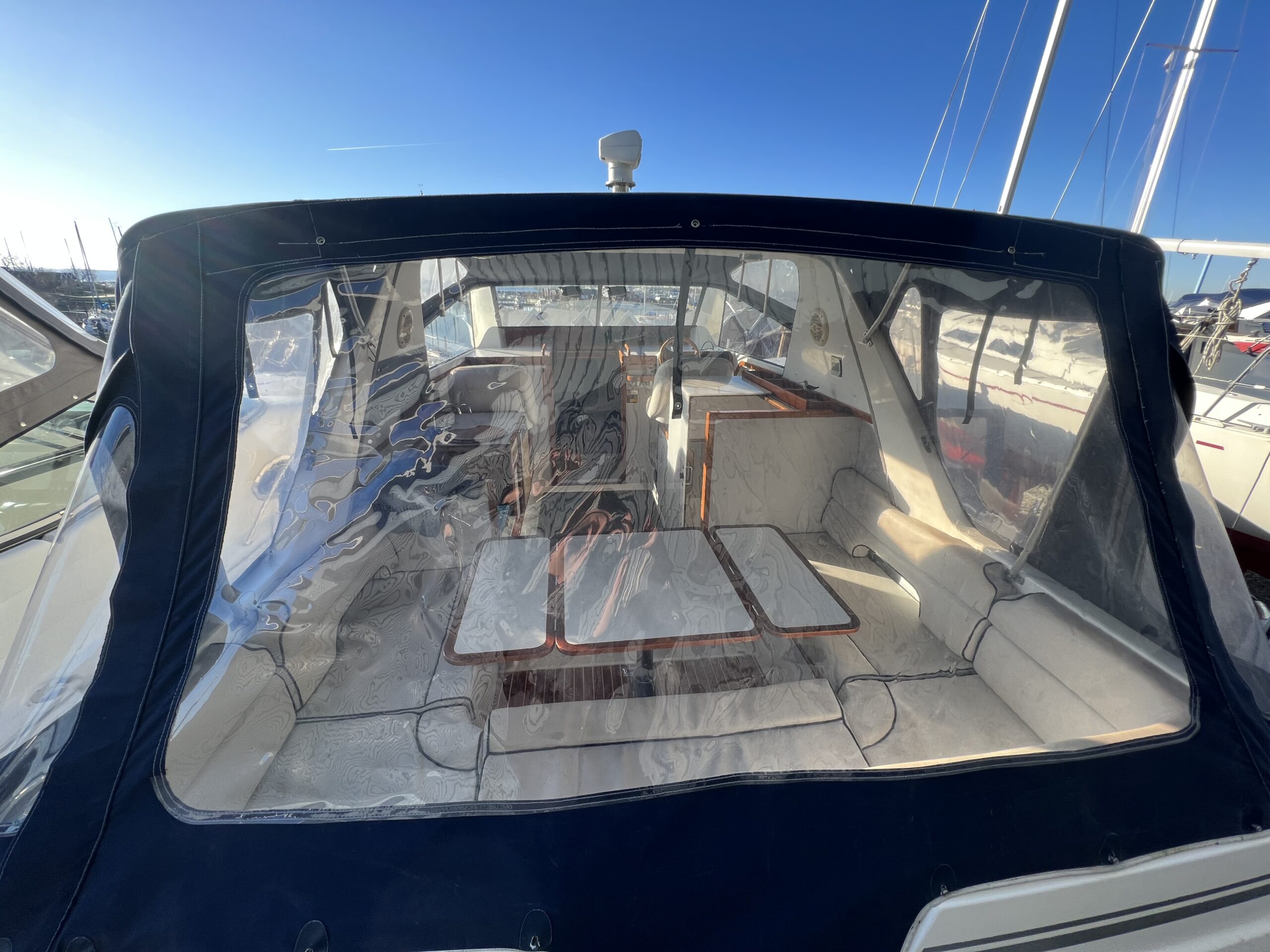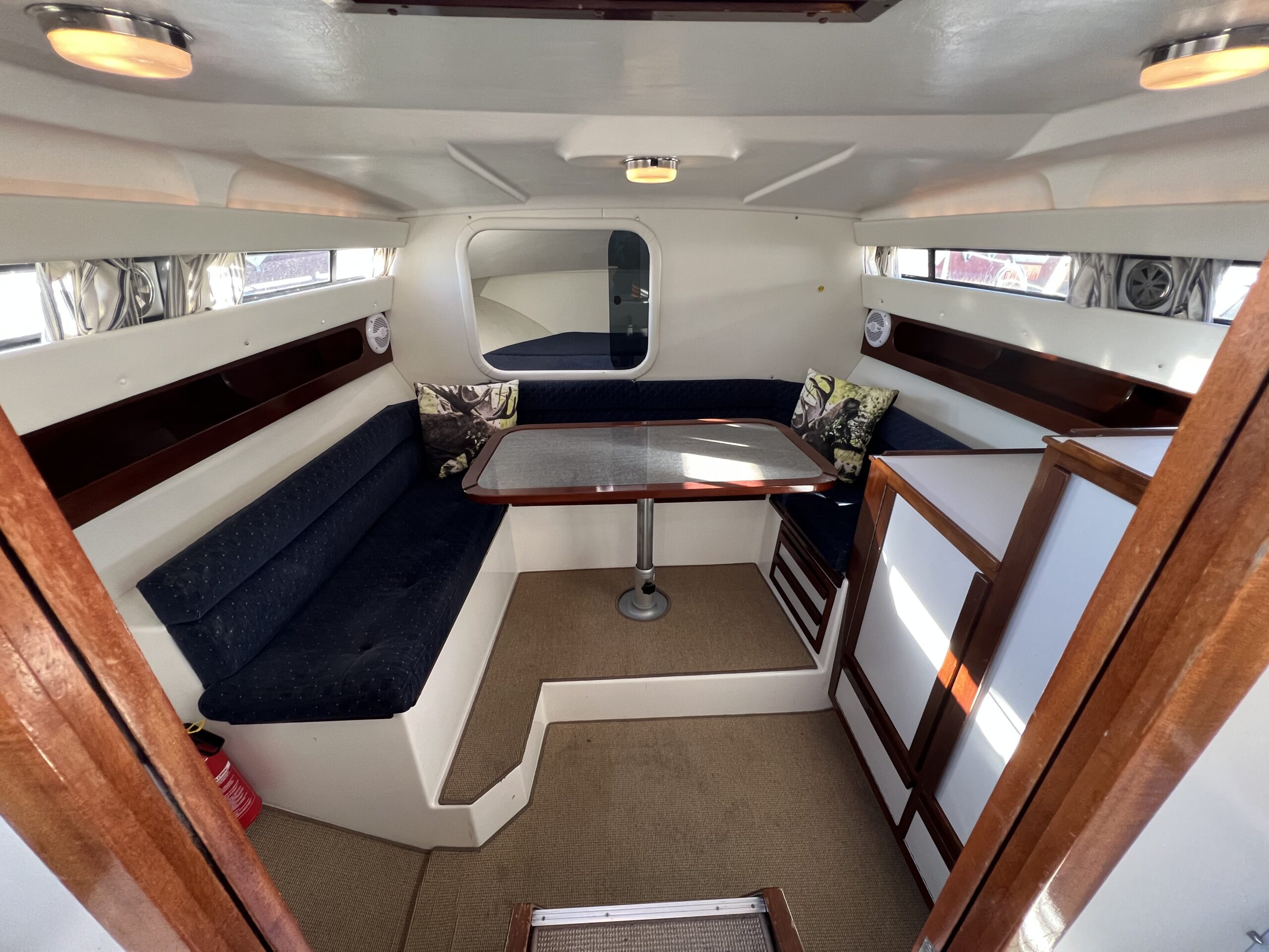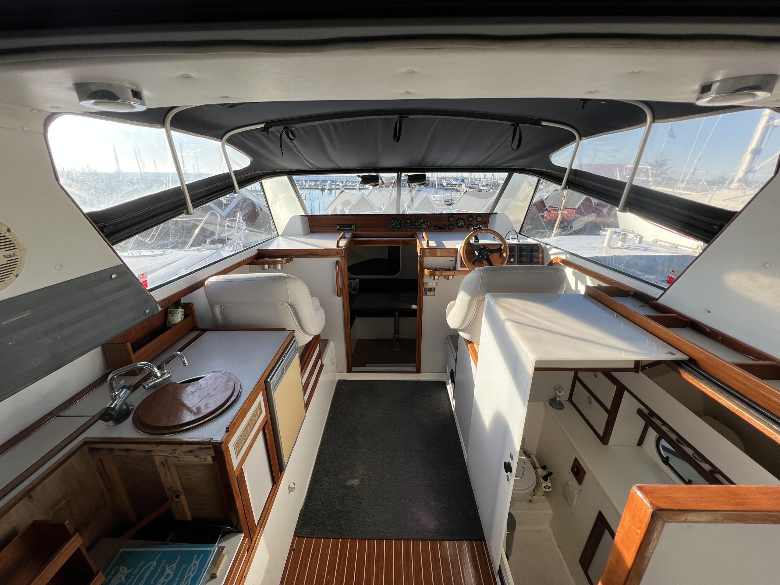 Skøn familie turbåd med nyere dieselmaskine som sikre god økonomi og alligevel med fart nok til at komme hjem til tiden. Cockpit med pantrysektion. førerplads og passagerstol, Stor siddegruppe med bord, Adgang til stort toilet rum fra cockpit, Fremme er kahyt med stor sofagruppe med bordløsning som kan omgøres til stor dobbeltkøje. Yderligere fin dobbelt soveplads midt under cockpit, og en mindre køje helt i front som kan lukkes af, det giver båden hele 8 rigtig fine sovepladser. Bådens stand er rimelig men med plads til kosmetiske forbedringer, bla. hynder i cockpit står snart til udskiftning. Kalechen har fået nye vinduer, Motoren er passet og plejet og sammen med Bovpropel er båden nem og sejle.