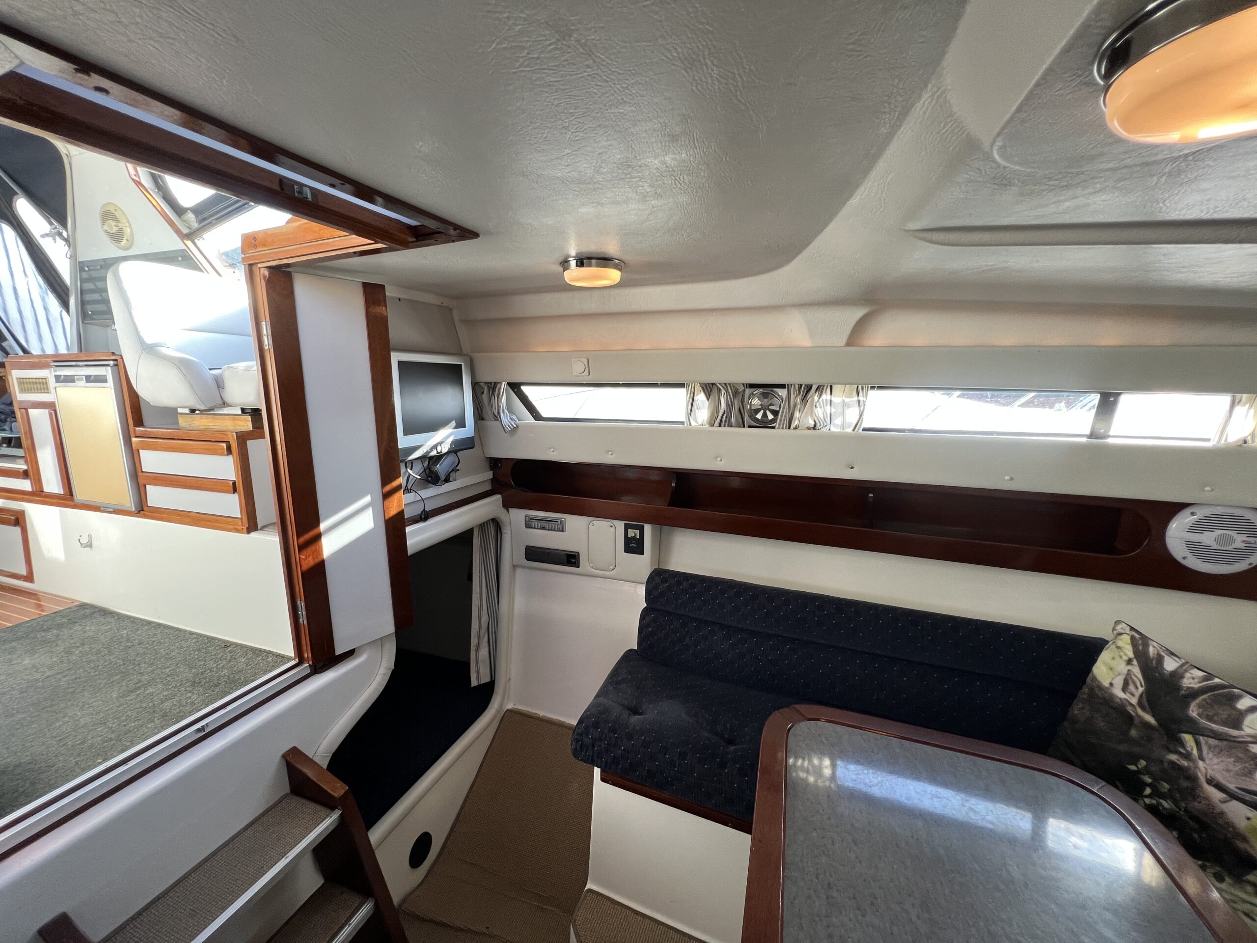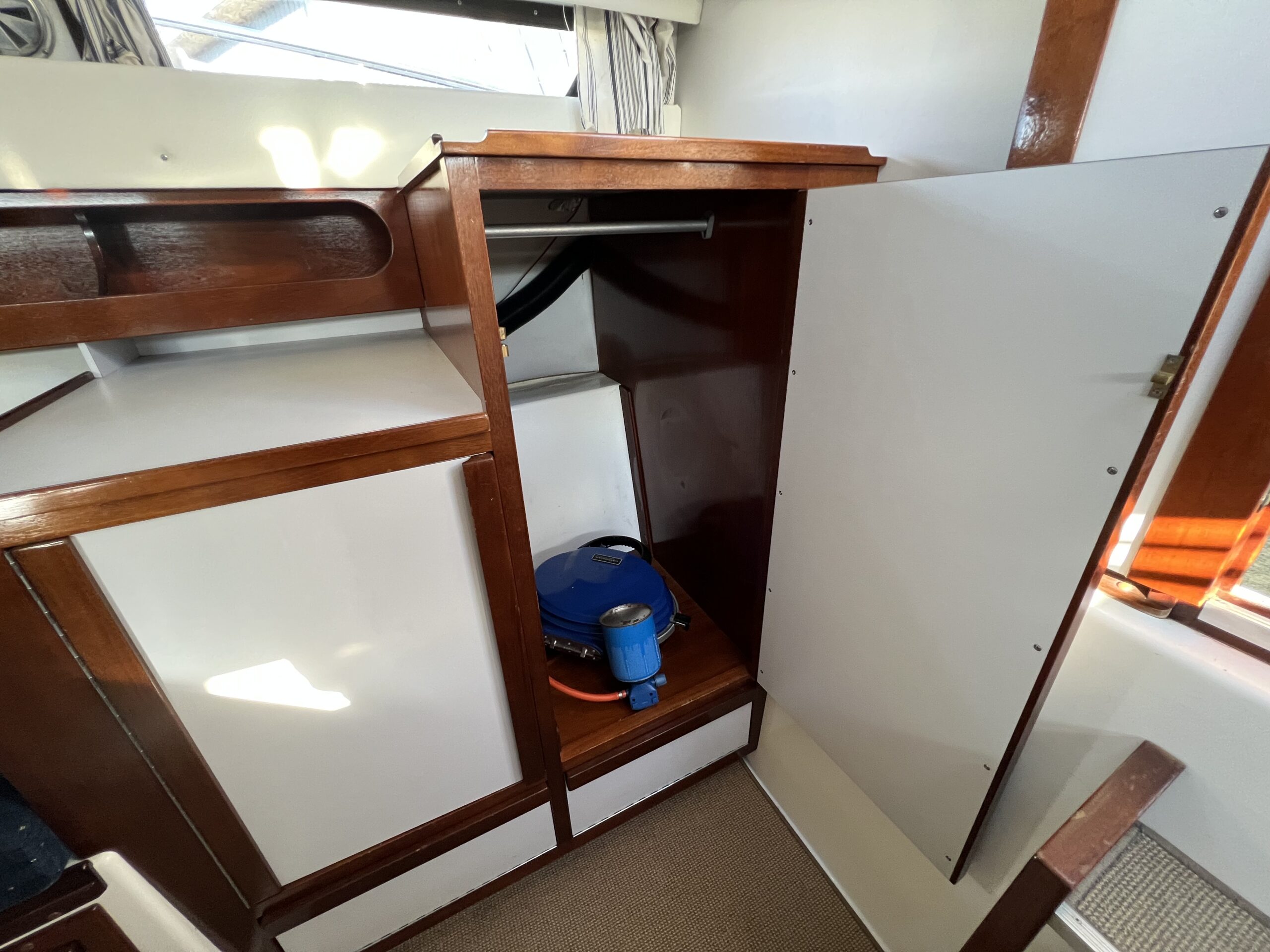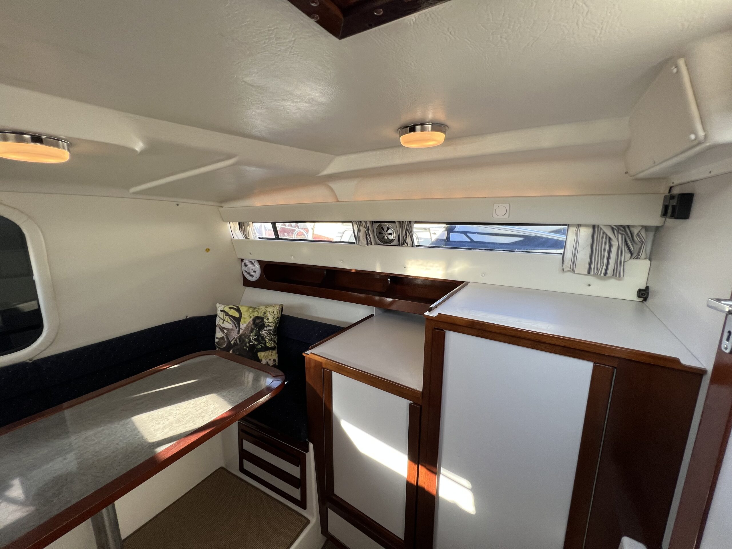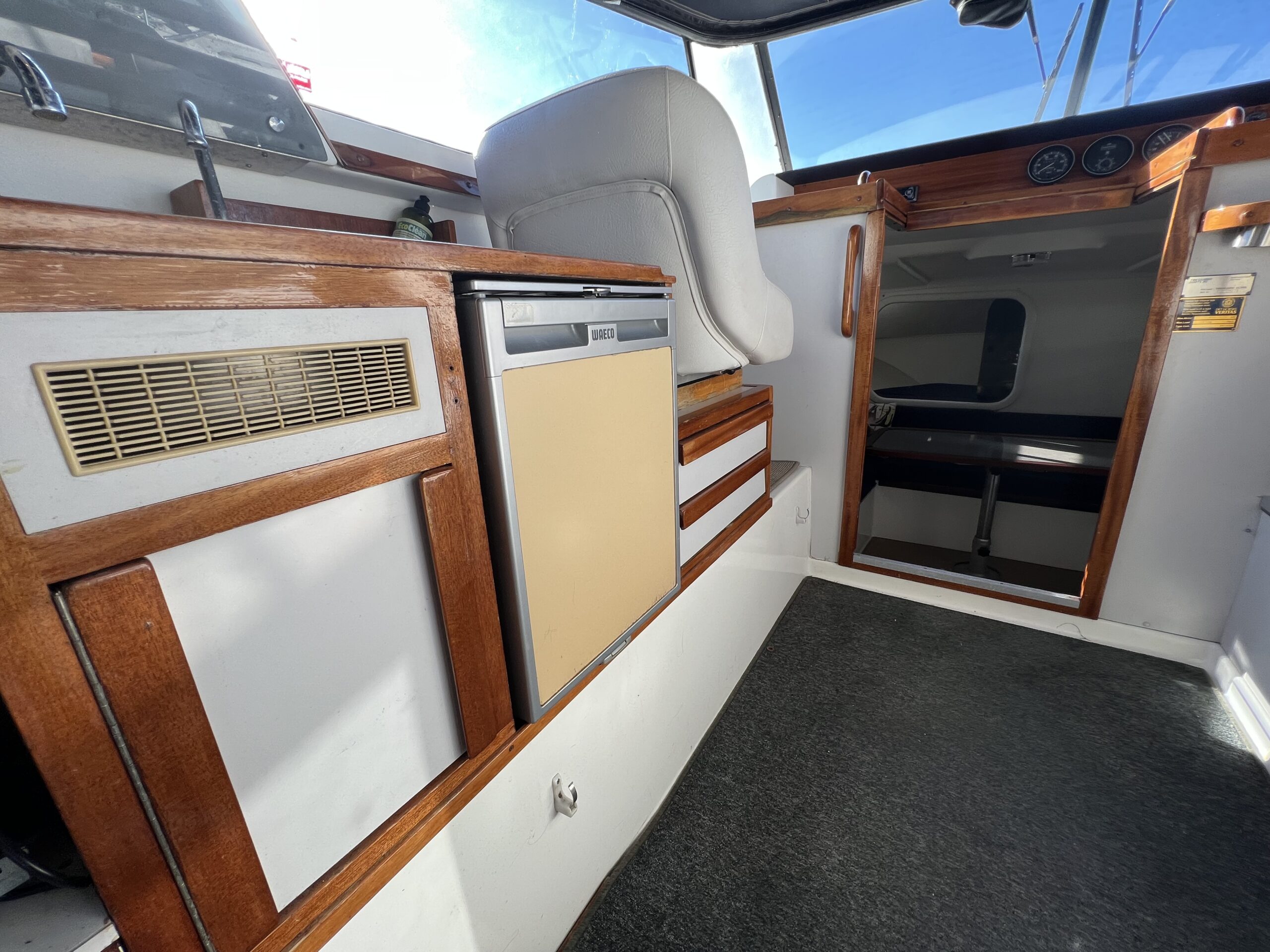 Skøn familie turbåd med nyere dieselmaskine som sikre god økonomi og alligevel med fart nok til at komme hjem til tiden. Cockpit med pantrysektion. førerplads og passagerstol, Stor siddegruppe med bord, Adgang til stort toilet rum fra cockpit, Fremme er kahyt med stor sofagruppe med bordløsning som kan omgøres til stor dobbeltkøje. Yderligere fin dobbelt soveplads midt under cockpit, og en mindre køje helt i front som kan lukkes af, det giver båden hele 8 rigtig fine sovepladser. Bådens stand er rimelig men med plads til kosmetiske forbedringer, bla. hynder i cockpit står snart til udskiftning. Kalechen har fået nye vinduer, Motoren er passet og plejet og sammen med Bovpropel er båden nem og sejle.