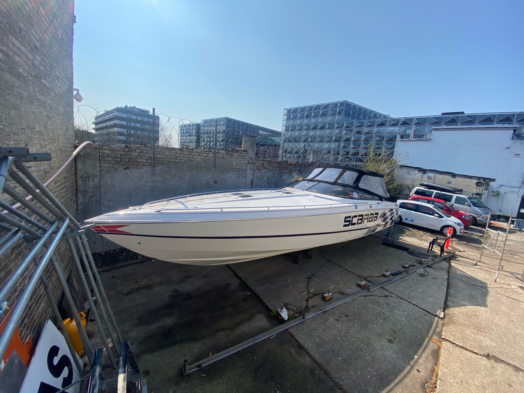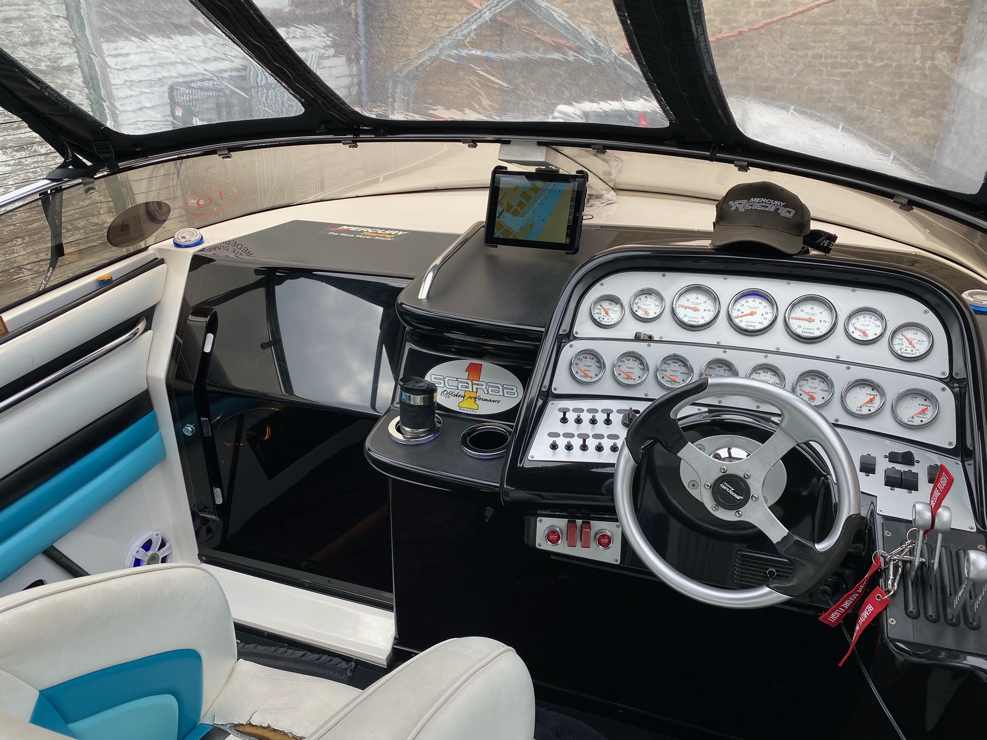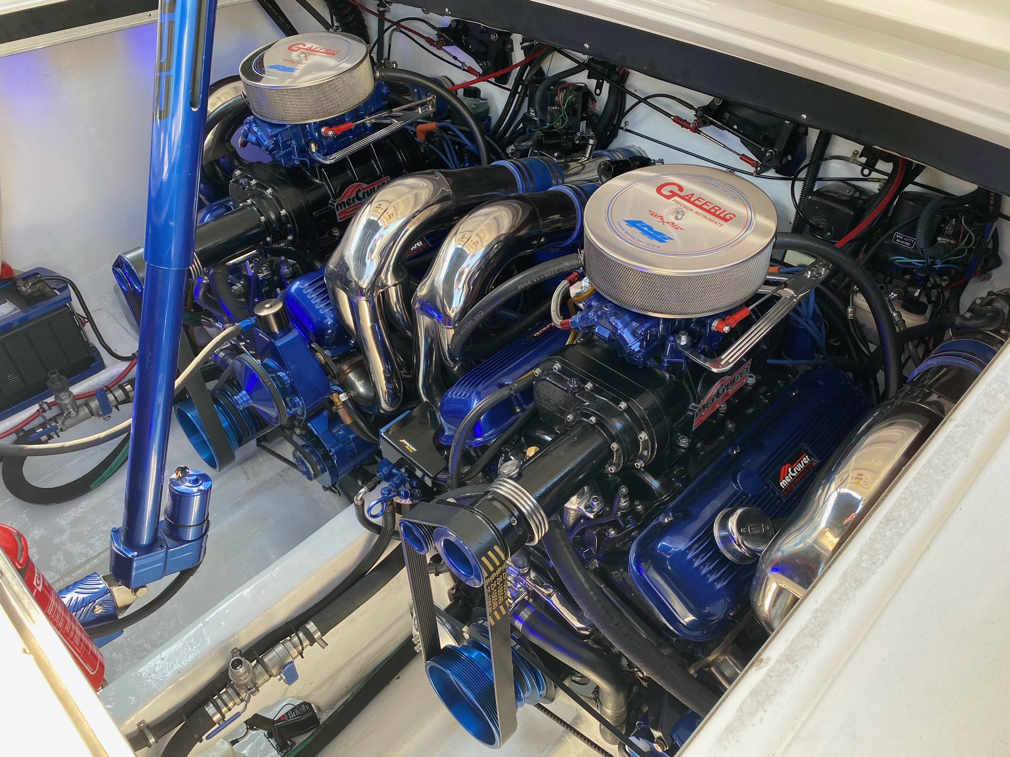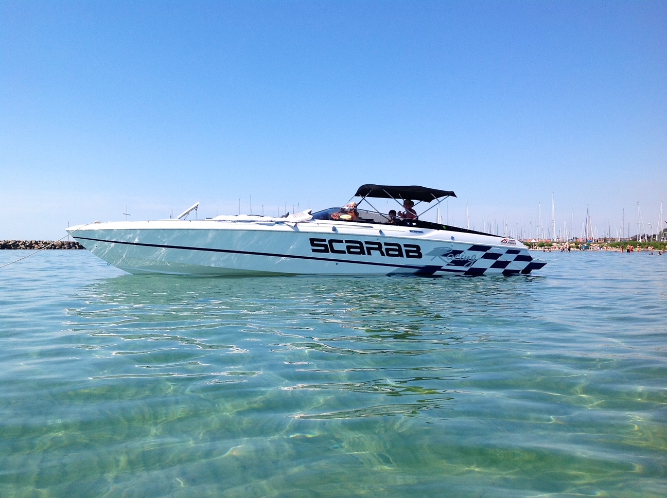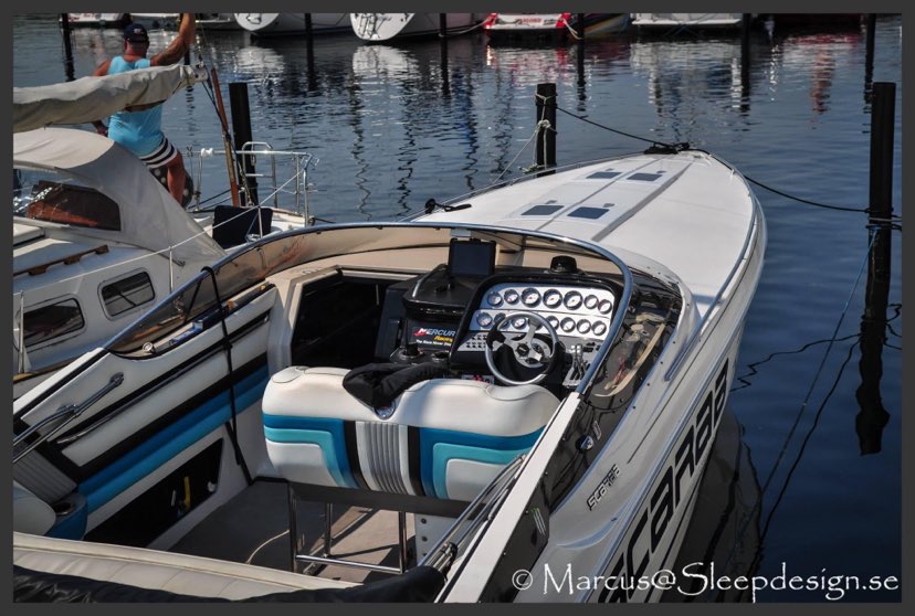 Scarab 34 er en af de fedeste oldschool Powerboats. Motorerne taler for sig selv, de er pudset og poleret, der er autolakeret dele på, alt der omhandler drivlinen er serviceret og passet på en næsten hysterisk måde. billederne taler for sig selv. nemlig meget velholdt, dog er sæder ikke nye mere og det kunne være en ting for den nye ejer og skifte ud om nogle år.